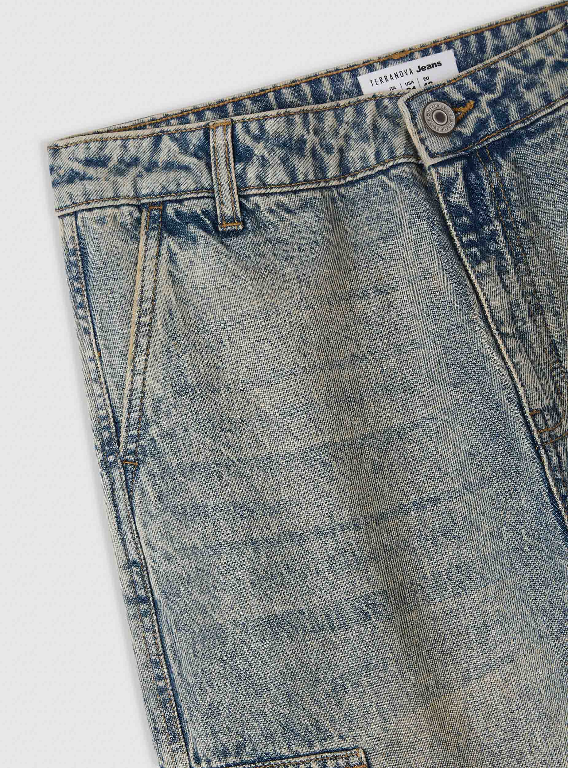 Muške duge traperice širokog kroja, dizajnirane za urbani i opušteni stil. Cargo model s velikim bočnim džepovima s preklopom i dodatnim stražnjim džepovima, dovršen remenjem u struku. Prednja zatvarač s gumbom i patentnim zatvaračem. Pranje s efektom istrošenosti dodaje karakter i lako se kombinira s trenirkama, majicama i tenisicama.Detalji