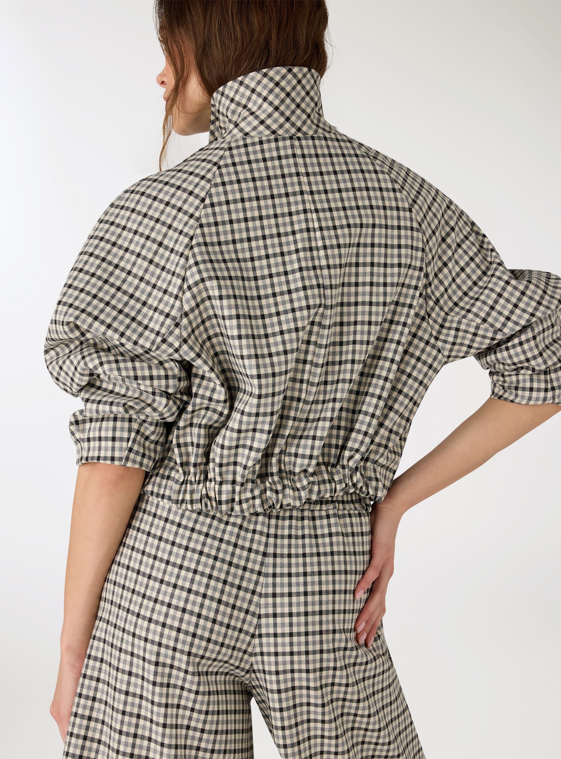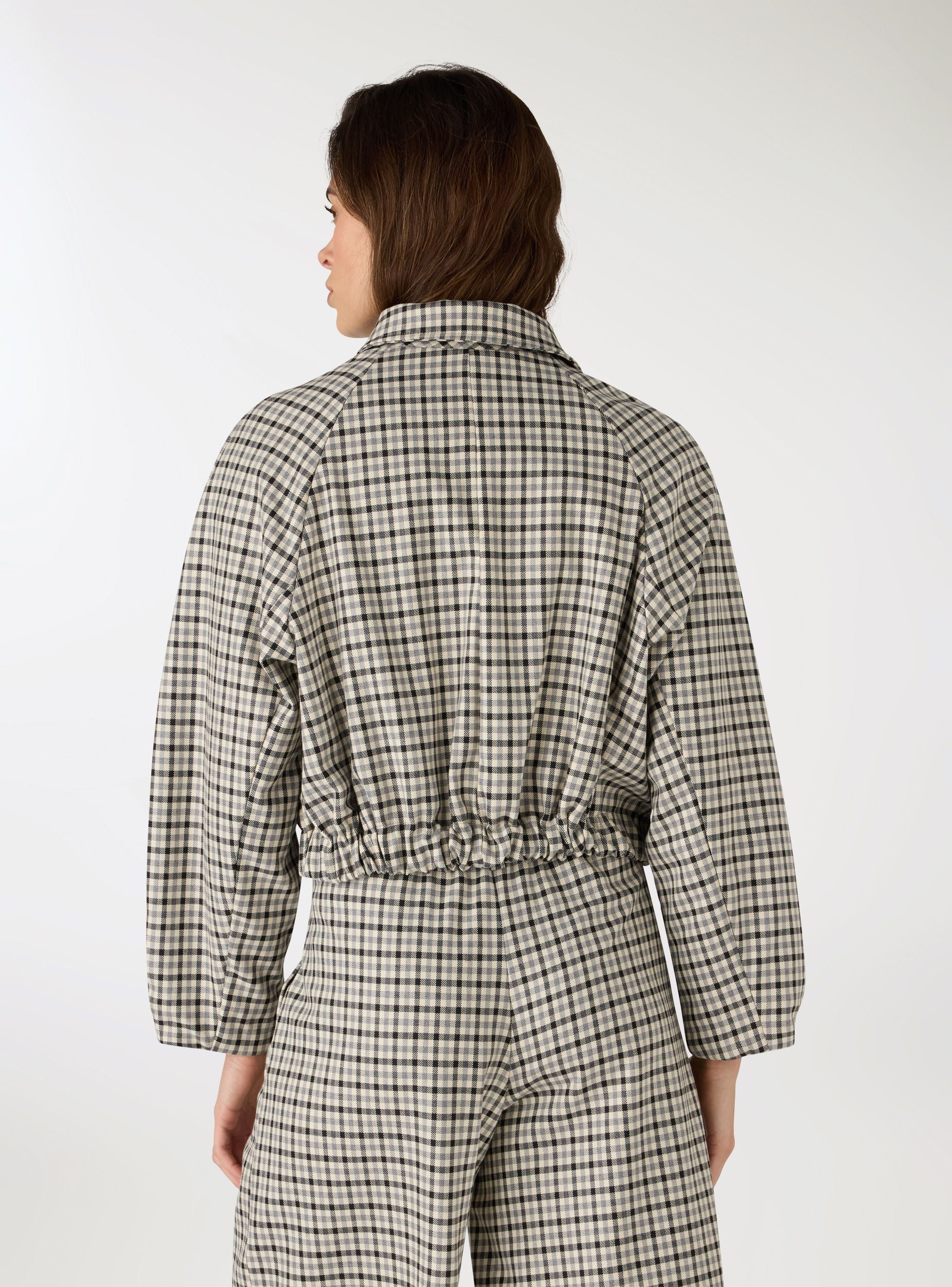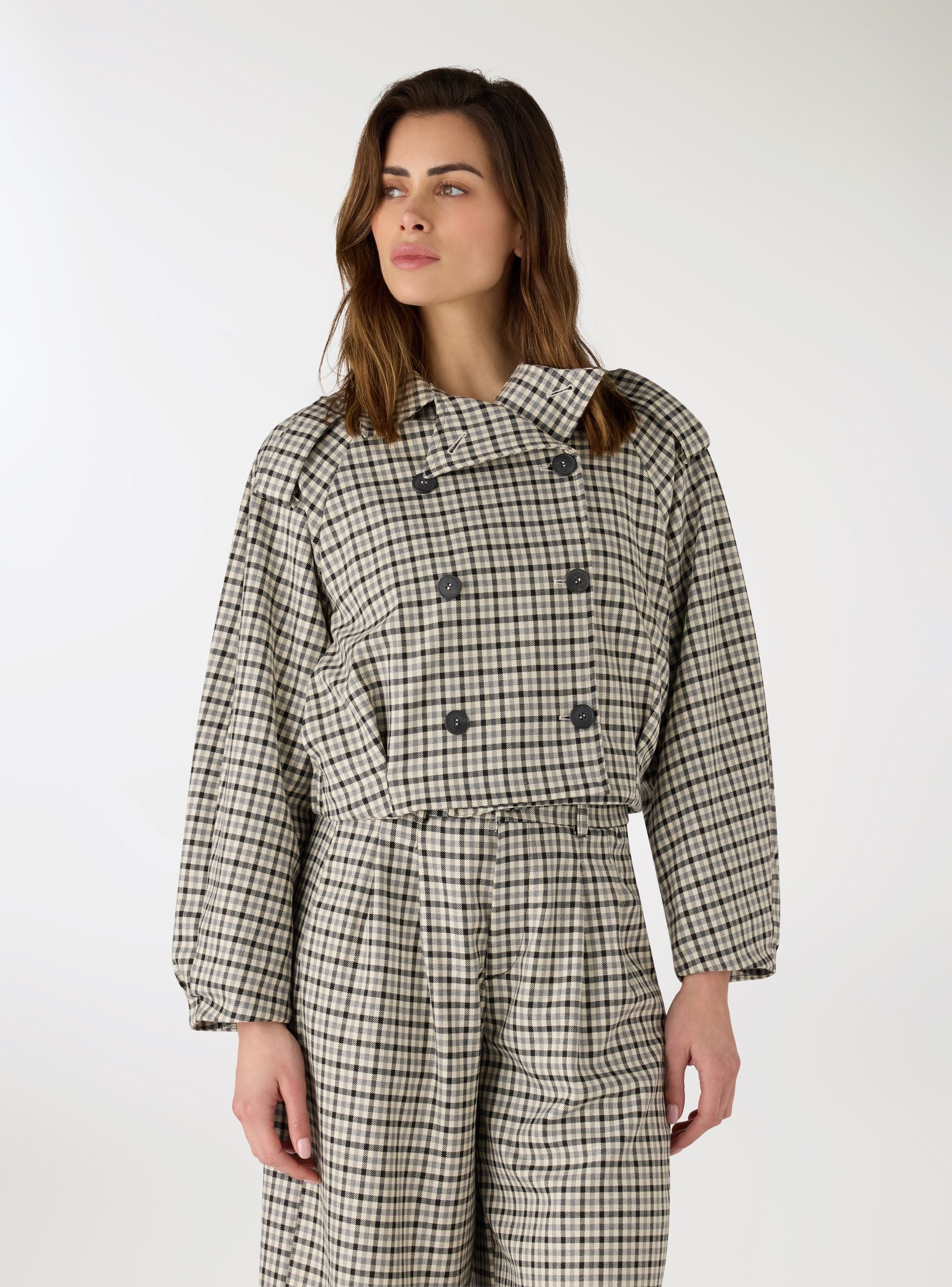 Ženski gornji kaput u stilu trench kaputa u skraćenoj verziji s geometrijskim uzorkom. Model s dvostrukim kopčanjem ističe se zatvaranjem s toniranim gumbima i ovratnikom s oštrim reverima. Strukturirani naramenice daju krojački štih, dok duge rukave s manžetama definiraju siluetu. Savršeno se slaže s hlačama visokog struka ili midi suknjom za dotjeran i moderan izgled, idealan za svakodnevne i poluformalnije prilike.Detalji