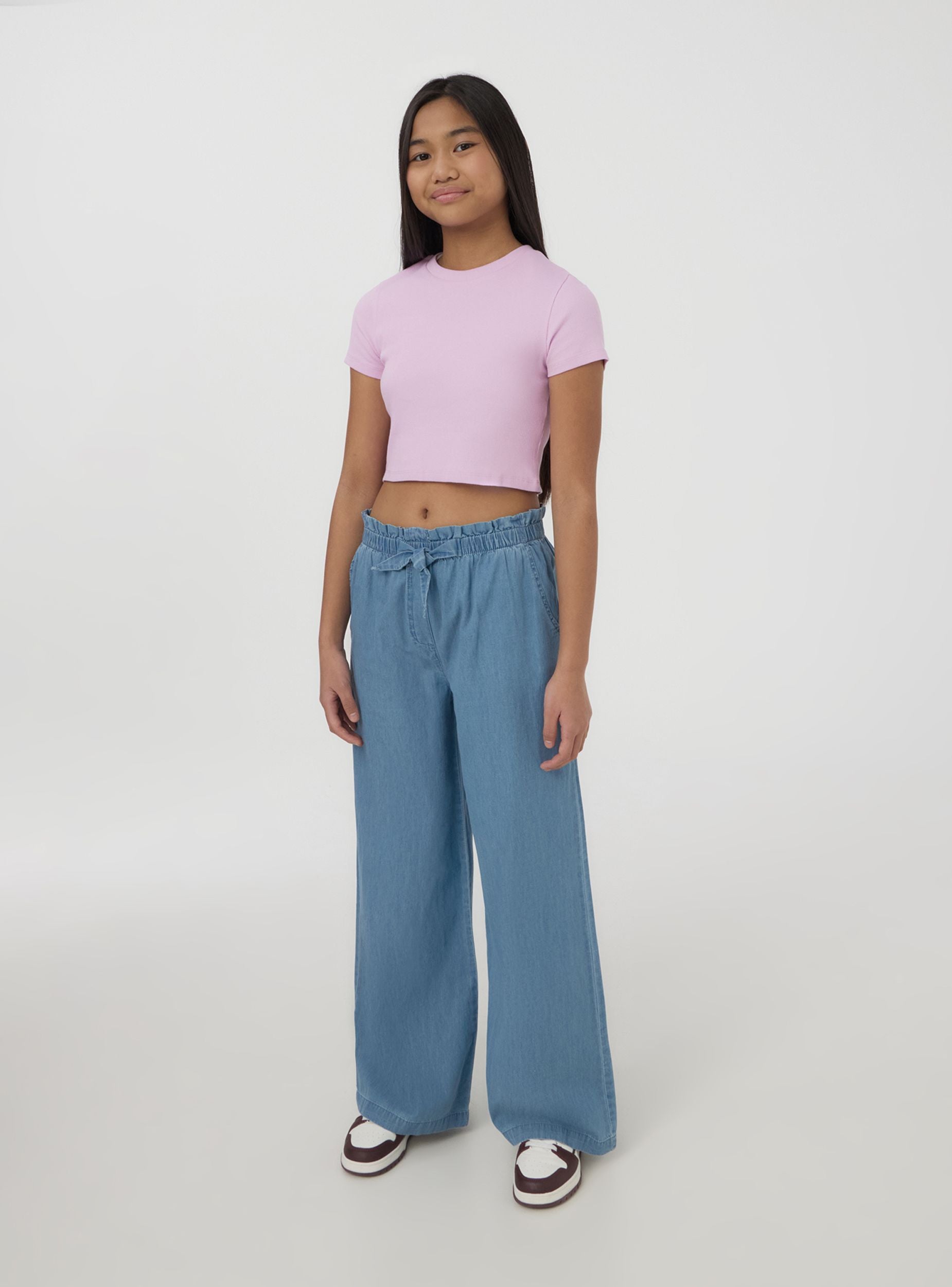 Dječje paperbag traperice, savršene za one koji vole udoban i moderan izgled. Chambry tkanina u srednjem denimu naglašava široki i lagani dizajn, idealan za dane igre ili casual izlazak. Elastična traka u struku s vezicom osigurava prilagodljivu i praktičnu udobnost. Savršene za kombiniranje s majicama i tenisicama za dinamičan izgled ili s bluzama i sandalama za ženstveniji dodir.Detalji