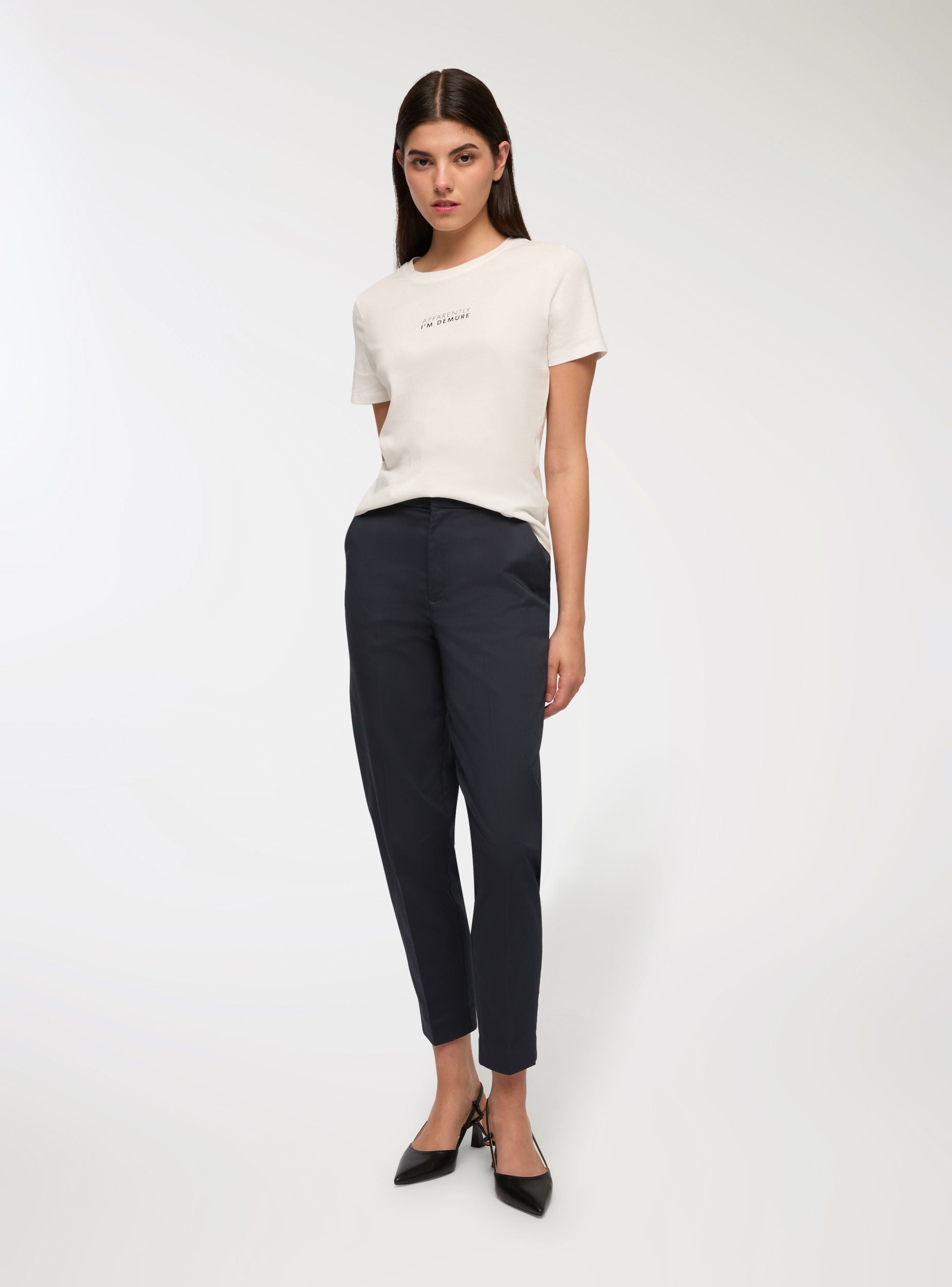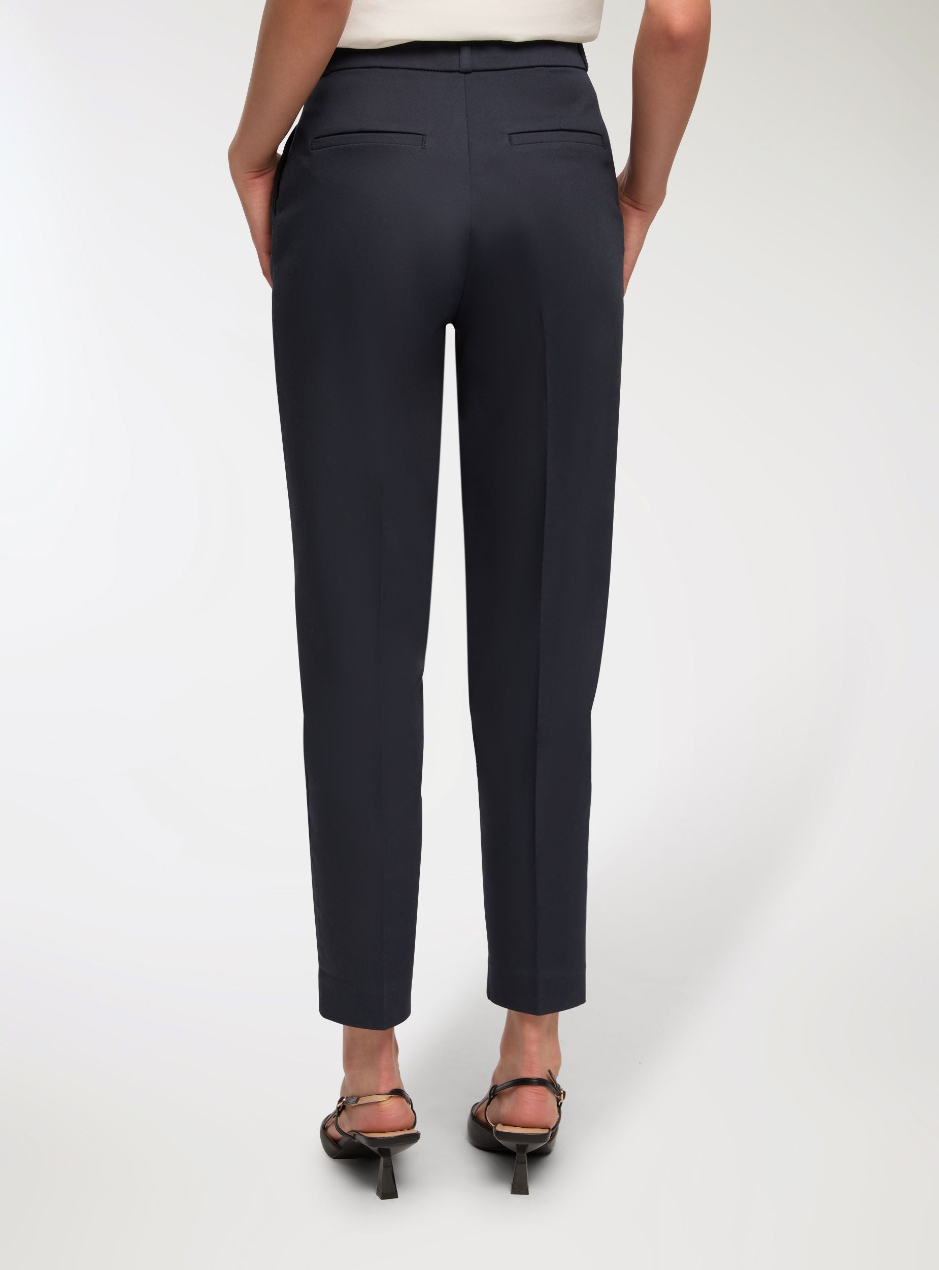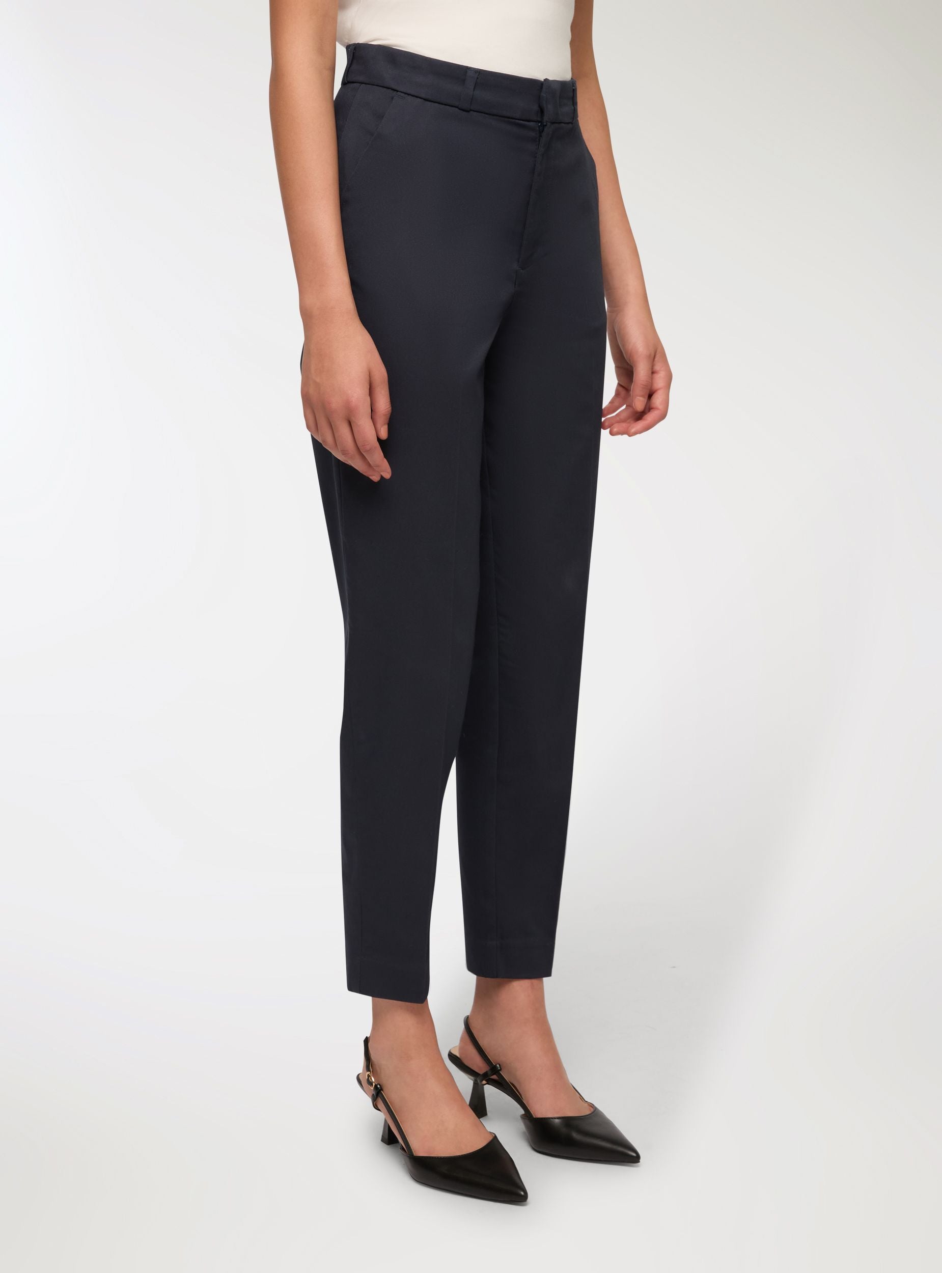 Ženske duge hlače, model chino, s regularnim krojem, idealne za formalni ili casual izgled. Imaju zatvaranje na gumb, patentni zatvarač i kukicu, te bočne džepove i petlje za remen. Cigaret kroj ističe siluetu, čineći ih savršenima za kombiniranje s košuljama ili bluzama za uredski outfit ili elegantne prilike. Njihova svestranost čini ih nezaobilaznim komadom u ormaru.Detalji