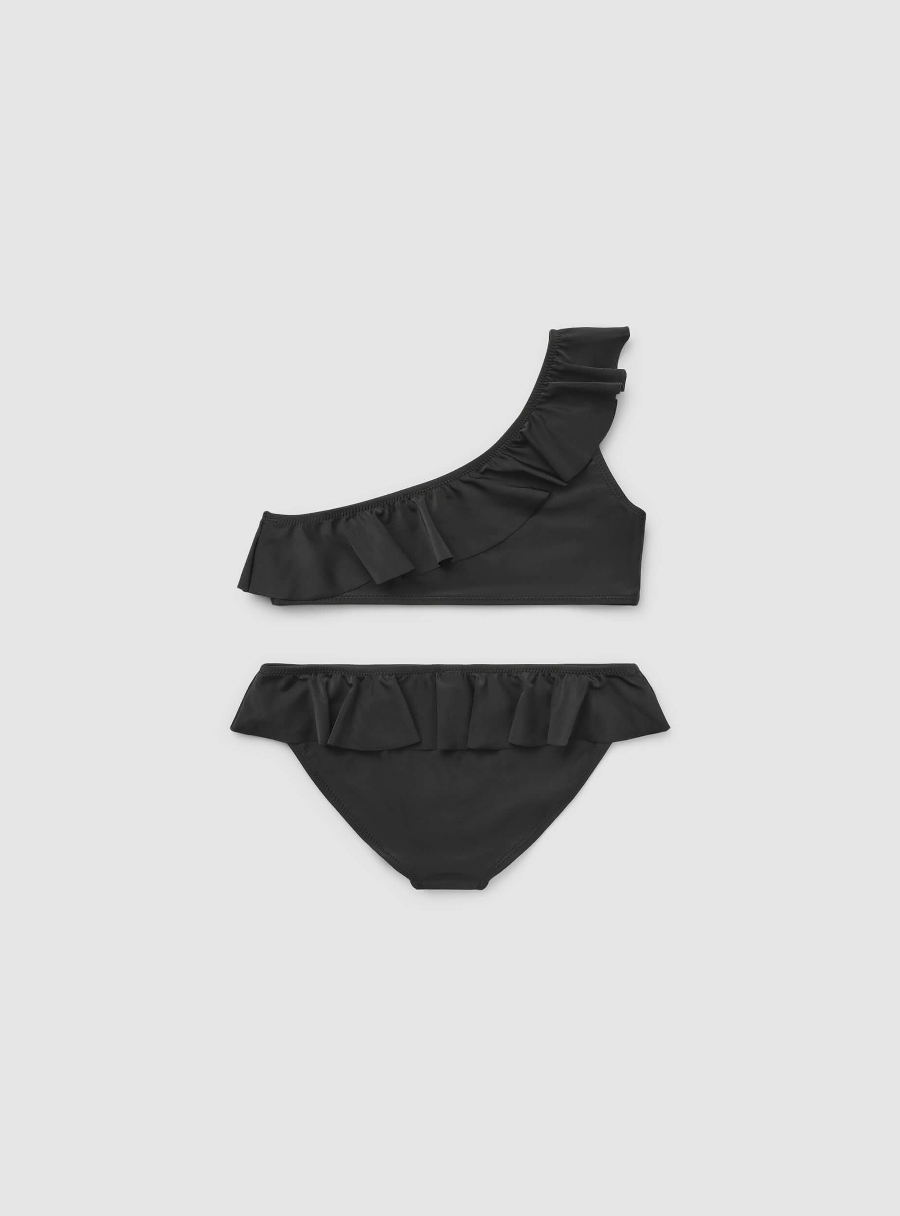 Dječji dvodijelni kostim savršen za ljeto u stilu na plaži ili bazenu. Bikini s jednim ramenom i volanima daje originalan i romantičan dodir, ističući delikatan dizajn. Jednobojna boja ga čini svestranim i lako kombiniranim s laganom plažnom haljinom i šarenim sandalama za svjež i rafiniran izgled, idealan za sunčane dane.Detalji