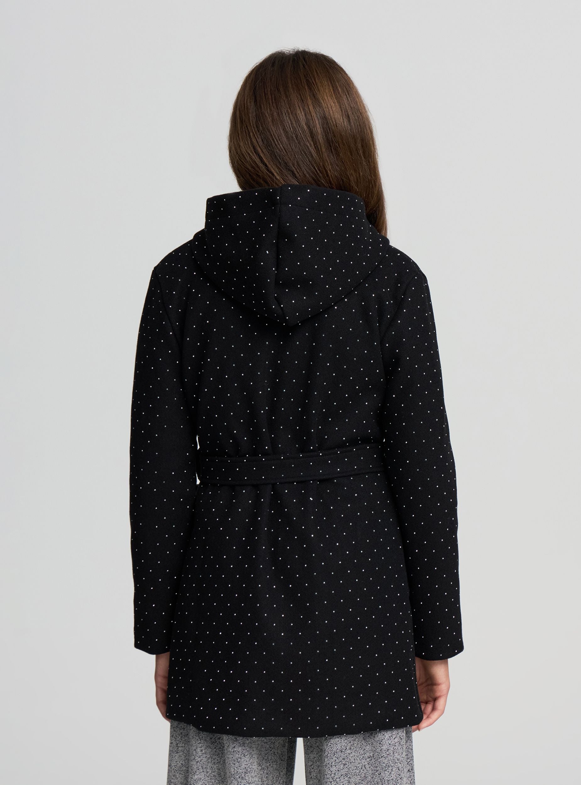 Kaput za djevojčice s kapuljačom, savršen za hladne mjesece i izlaske u grad. Model s točkicama po cijelom kaputu, opremljen pojasom u struku za vezanje koji definira pristajanje. Ima ovratnik s reverom, duge rukave i prednje džepove. Srednje dužine, idealan za traperice ili tajice, lako se kombinira i s odjevnim kombinacijama za školu ili vikend.