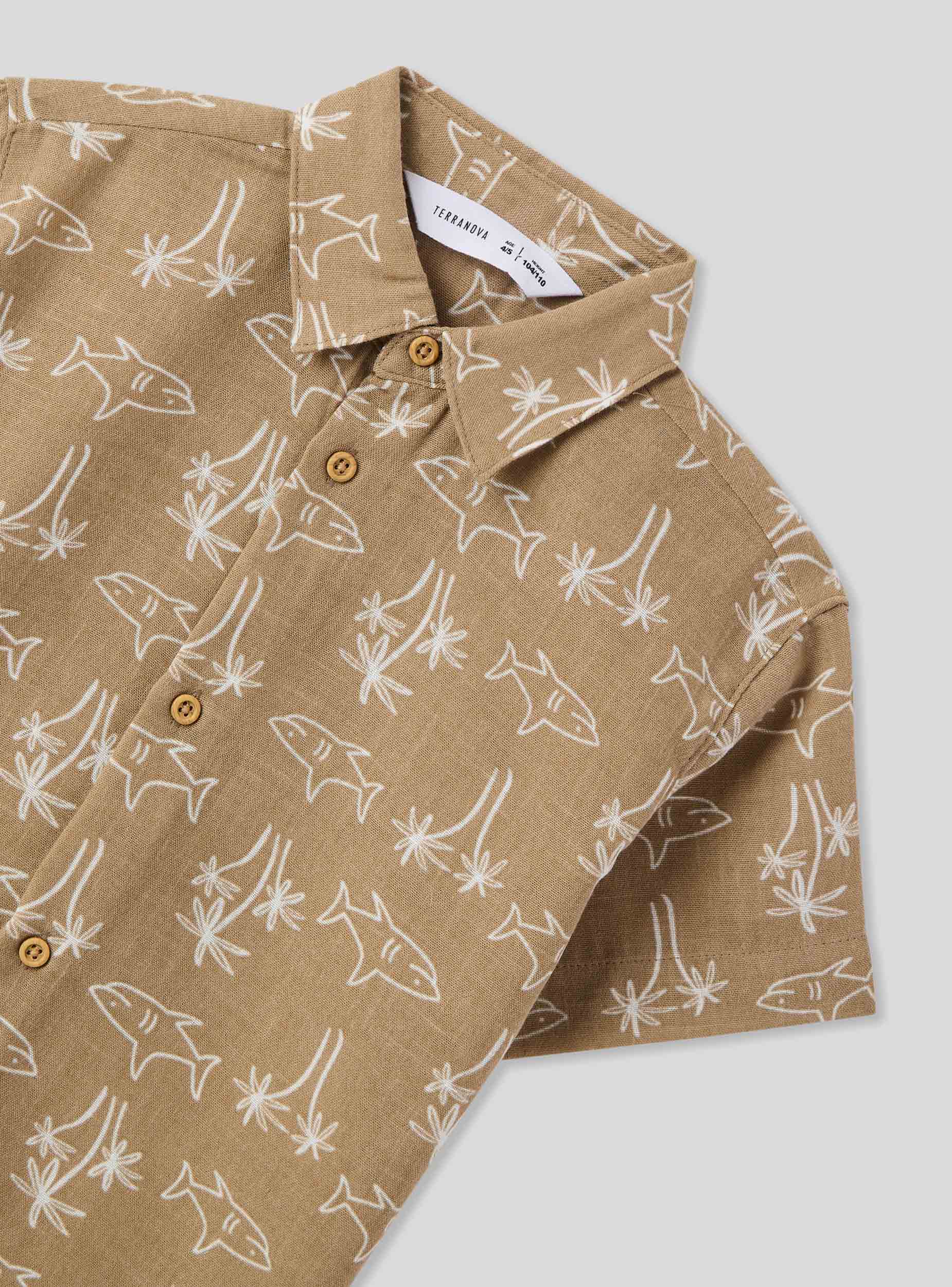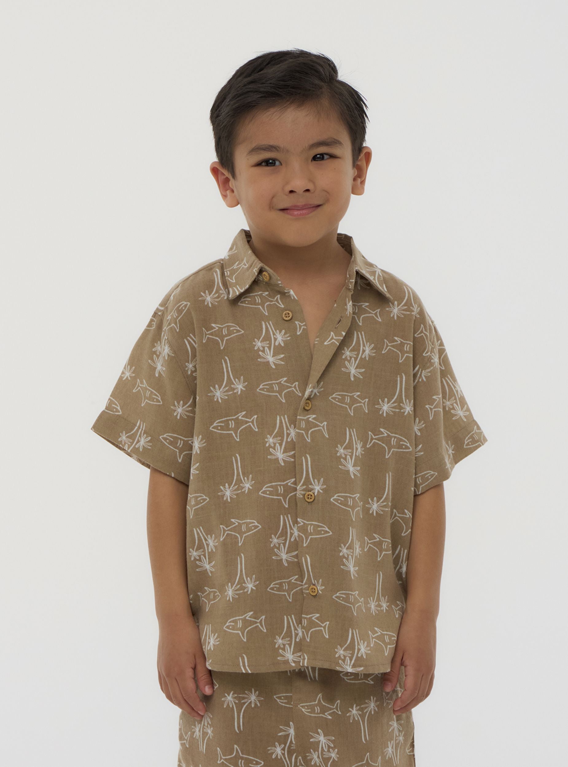Majica za dječake s kratkim rukavima, savršena za dodavanje daška veselja u garderobu malih. Dizajn ima živopisni uzorak sa stiliziranim morskim psima, idealan za one koji vole more i avanturu. Zakopčavanje na gumbe čini je praktičnom za nošenje i daje dotjeran izgled. Savršena za kombiniranje s kratkim hlačama ili trapericama za udoban i originalan outfit.Detalji