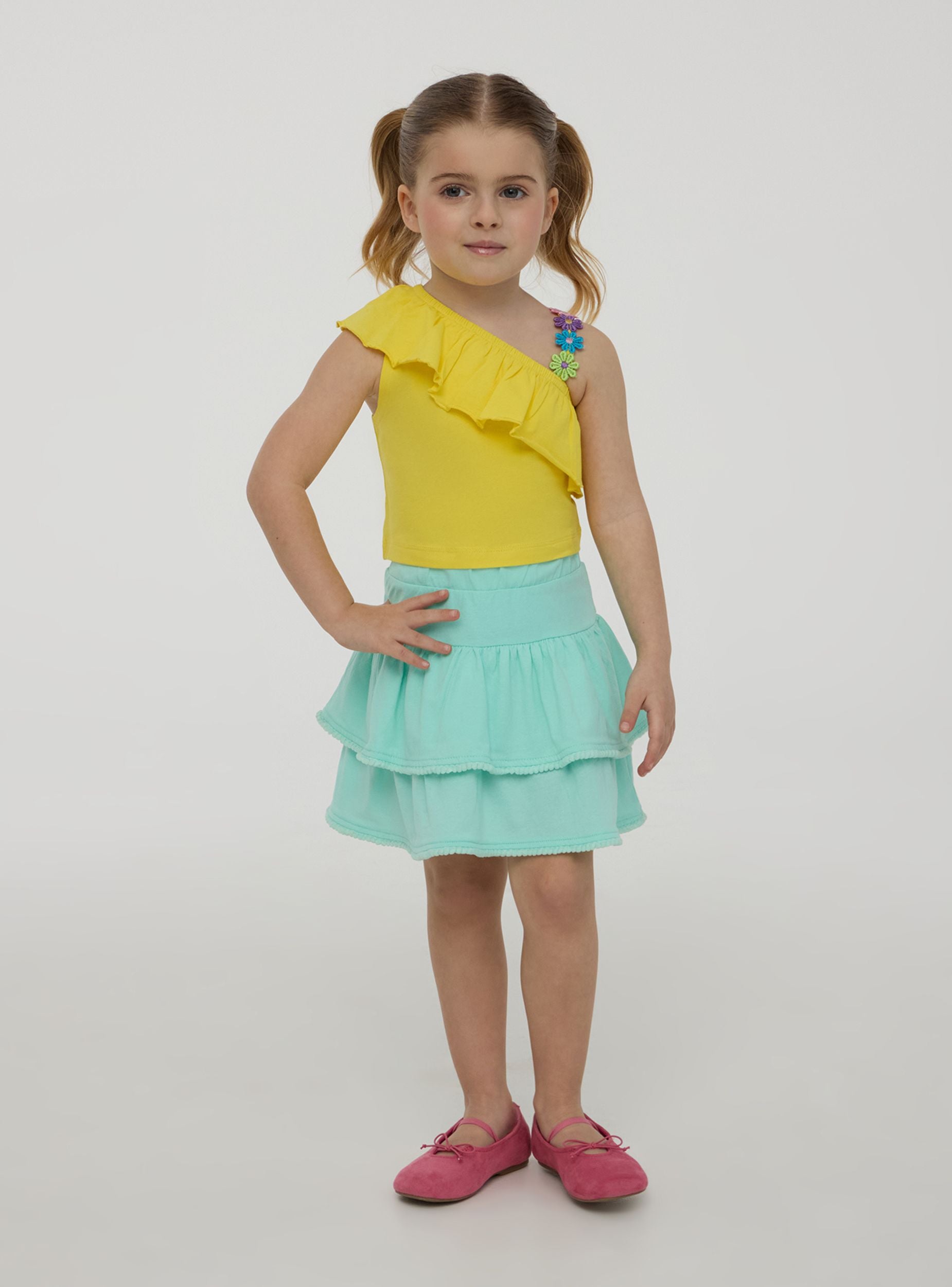 Kratka haljina za djevojčice živahnog i razigranog dizajna, savršena za svježe i zabavne lookove. Jednobojna boja olakšava kombiniranje, dok volani dodaju dašak pokreta. Elastična traka u struku osigurava udobno prianjanje, idealno za igru i slobodno vrijeme. Delikatne resice ukrašavaju rub, dajući originalan detalj. Savršena uz majicu i sandale za dan ili uz bluzu za posebnu priliku.