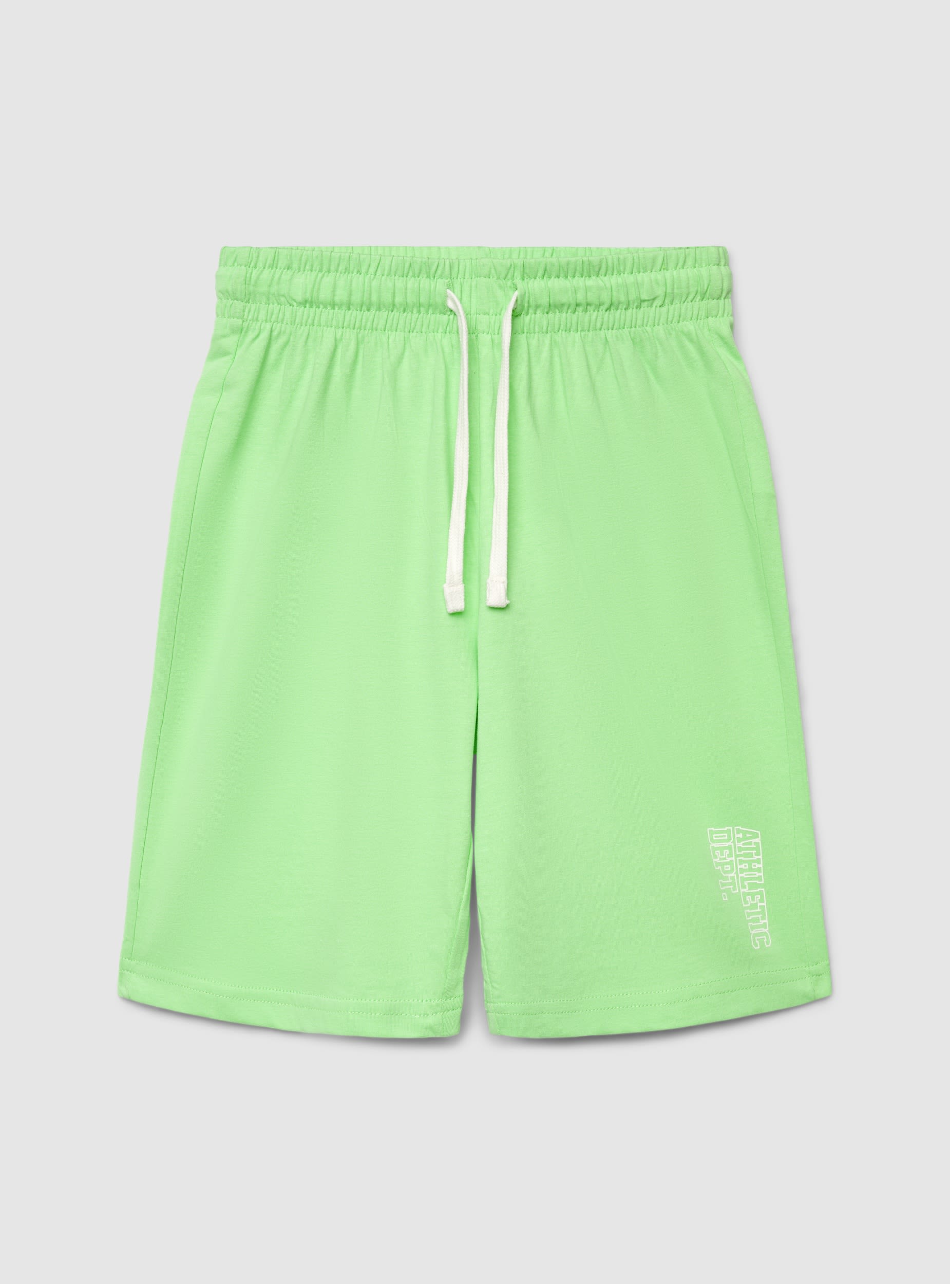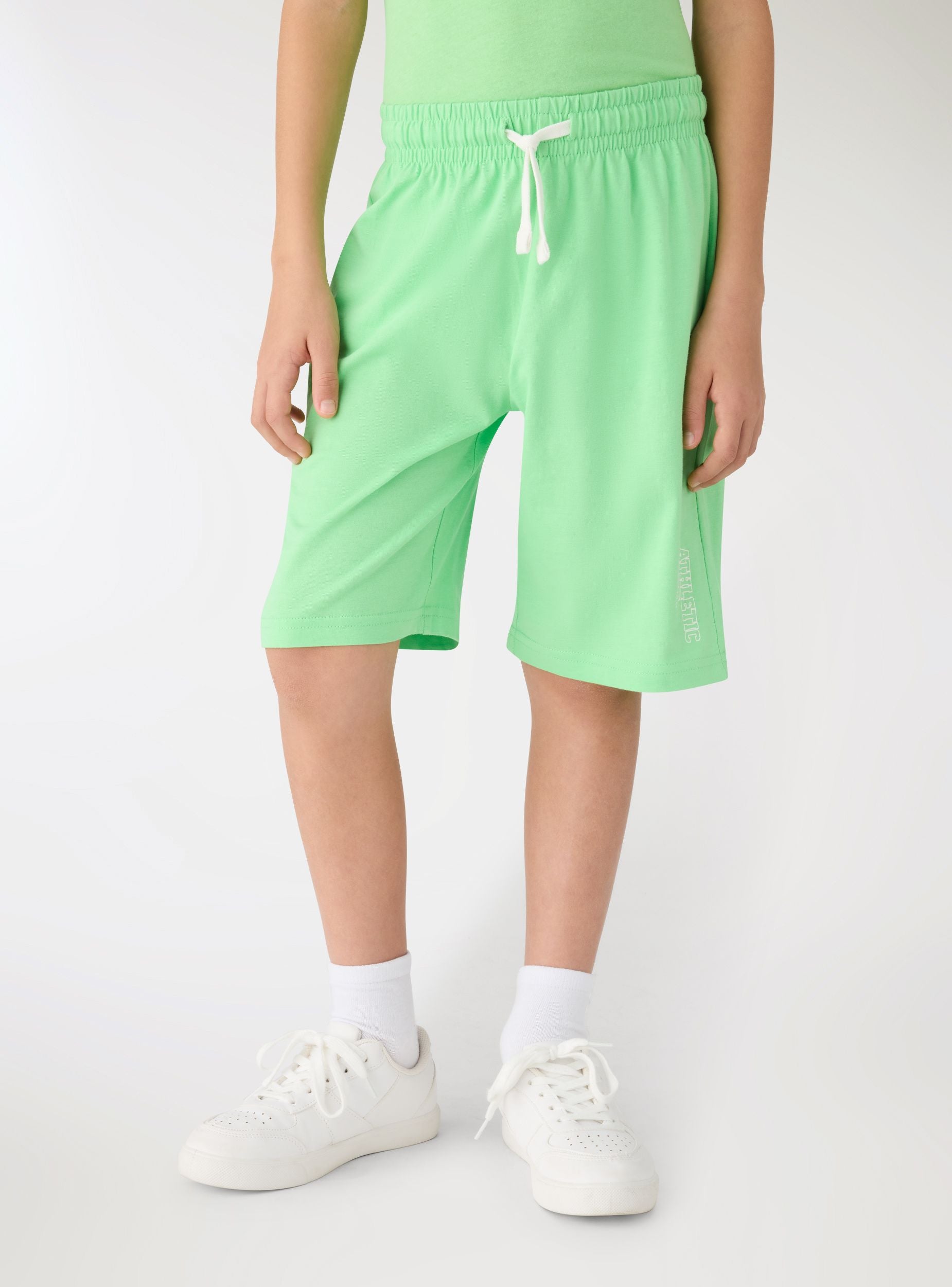 Dječje kratke hlače u jednobojnoj izvedbi s elastičnim pojasom i podesivim vezicama, dizajnirane za sport i slobodno vrijeme. Natpis sa strane dodaje dinamičan detalj. Regularan kroj i ravne nogavice, idealne uz majicu i tenisice ili uz hoodicu za udoban izgled za školu i vikend.Detalji