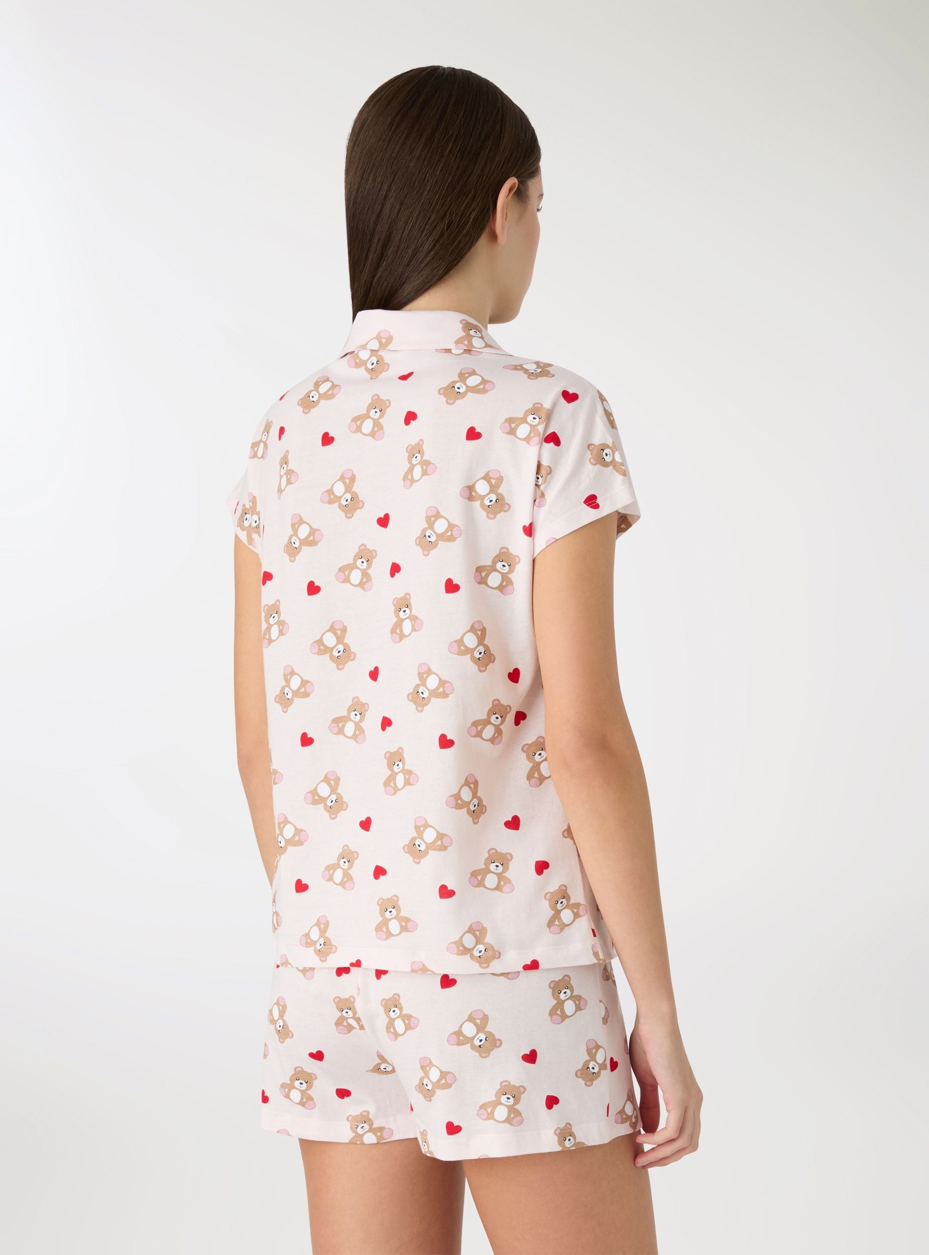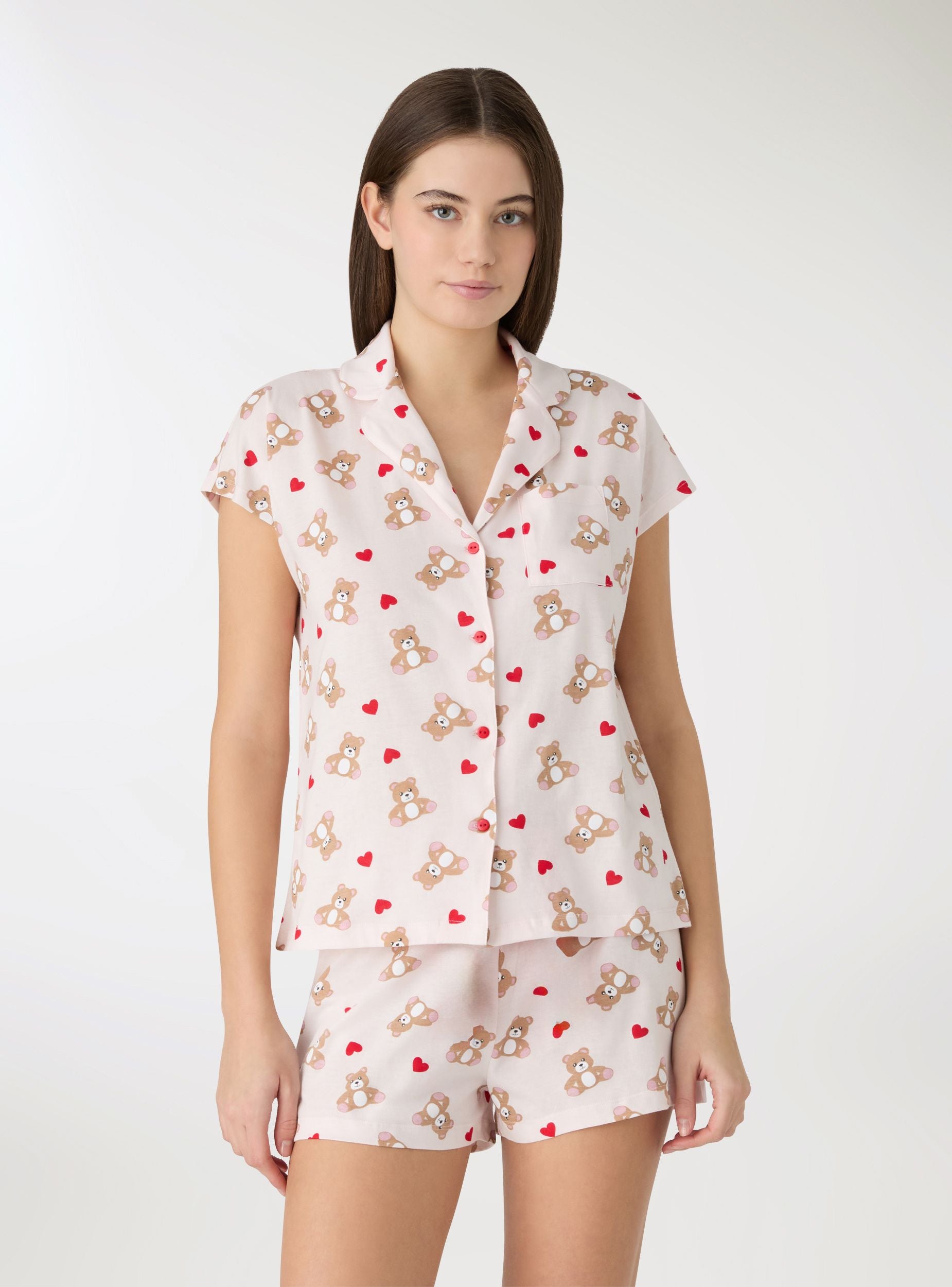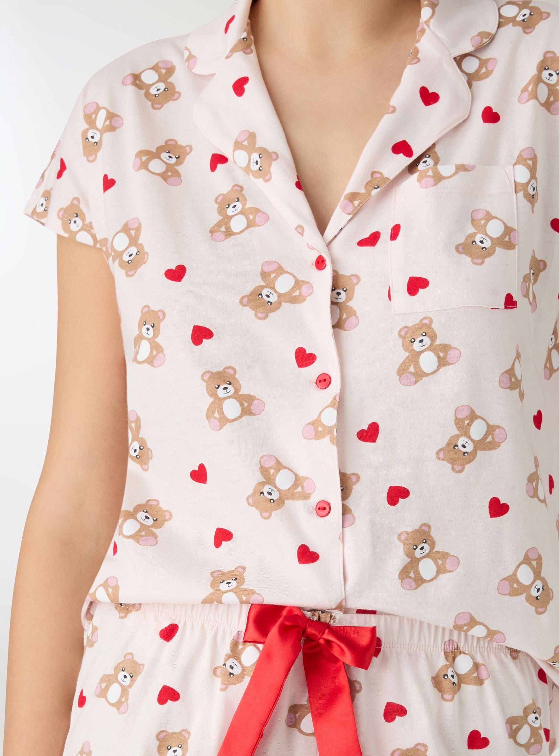 Ženski pidžama s uzorkom, s košuljom kratkih rukava i rever ovratnikom. Prednja kopča na gumbe i džepić na prsima. Hlačice s elastičnim strukom i vezicom s trakicom. Savršeno za večeri kod kuće i za one koji traže udobnost bez odricanja od zabavnog detalja zahvaljujući printu s srcima i medvjedićima.Detalji