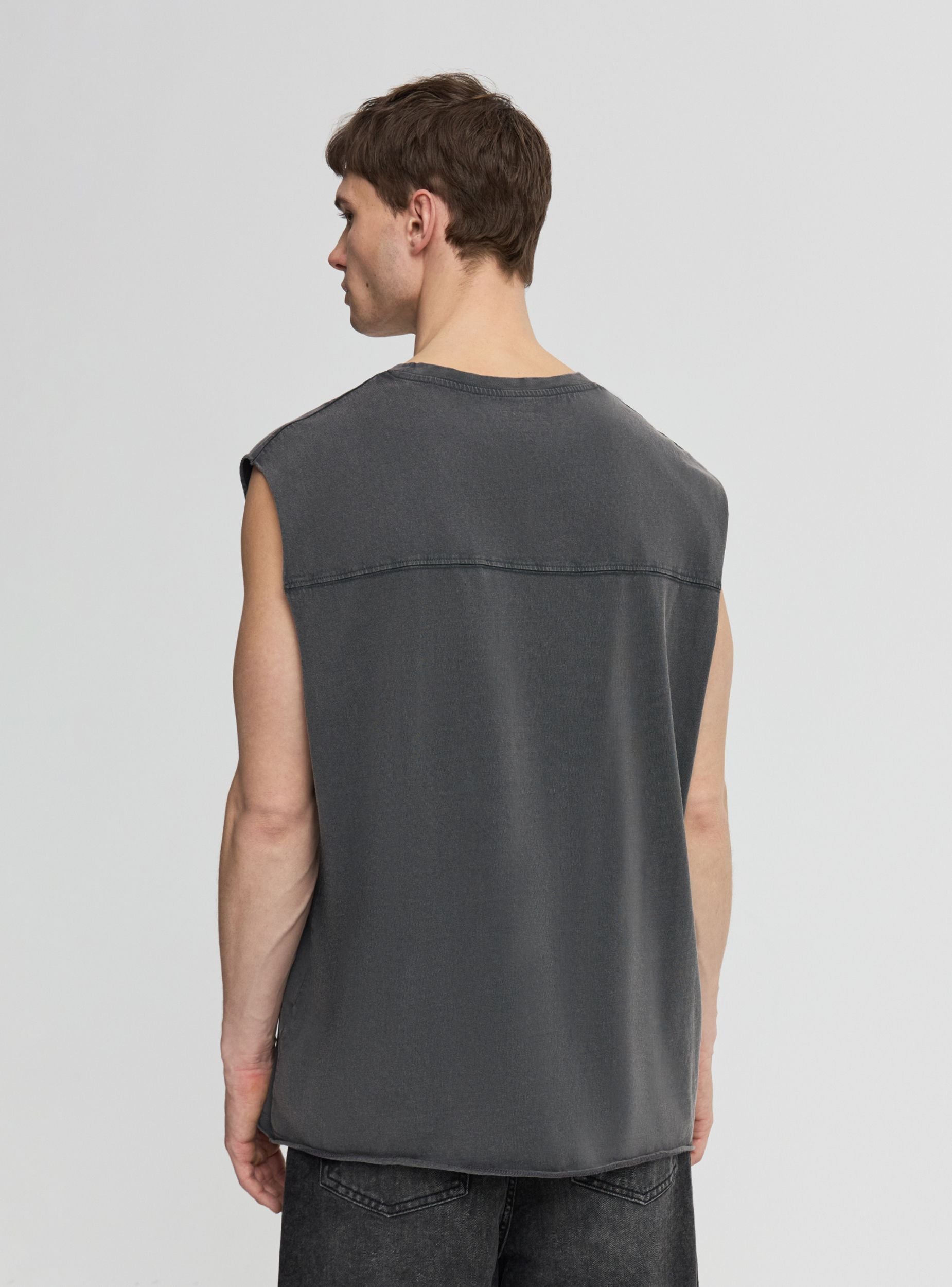 Muška majica bez rukava s okruglim izrezom i boxy krojem, dizajnirana za street i casual stil. Print broja u koledž stilu sprijeda daje karakter odjevnom predmetu, dok šavovi na prsima dodaju detalj. Lako se kombinira s trapericama, cargo hlačama ili bermudama za opuštene i trendi outfite.Detalji