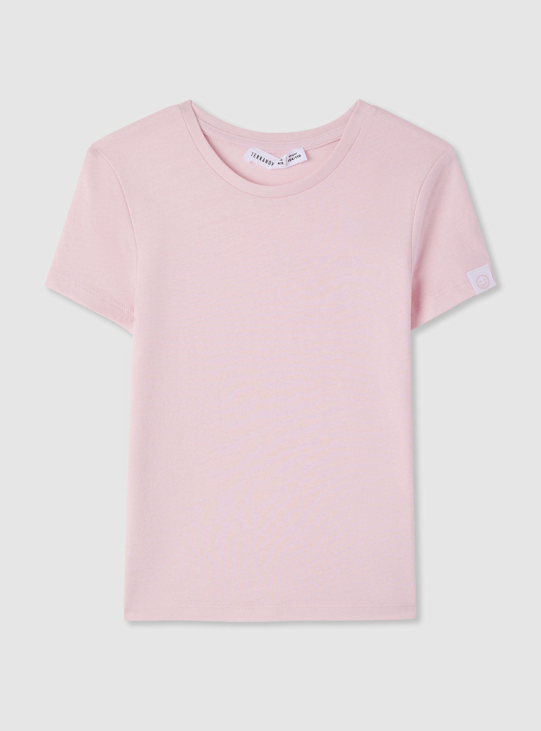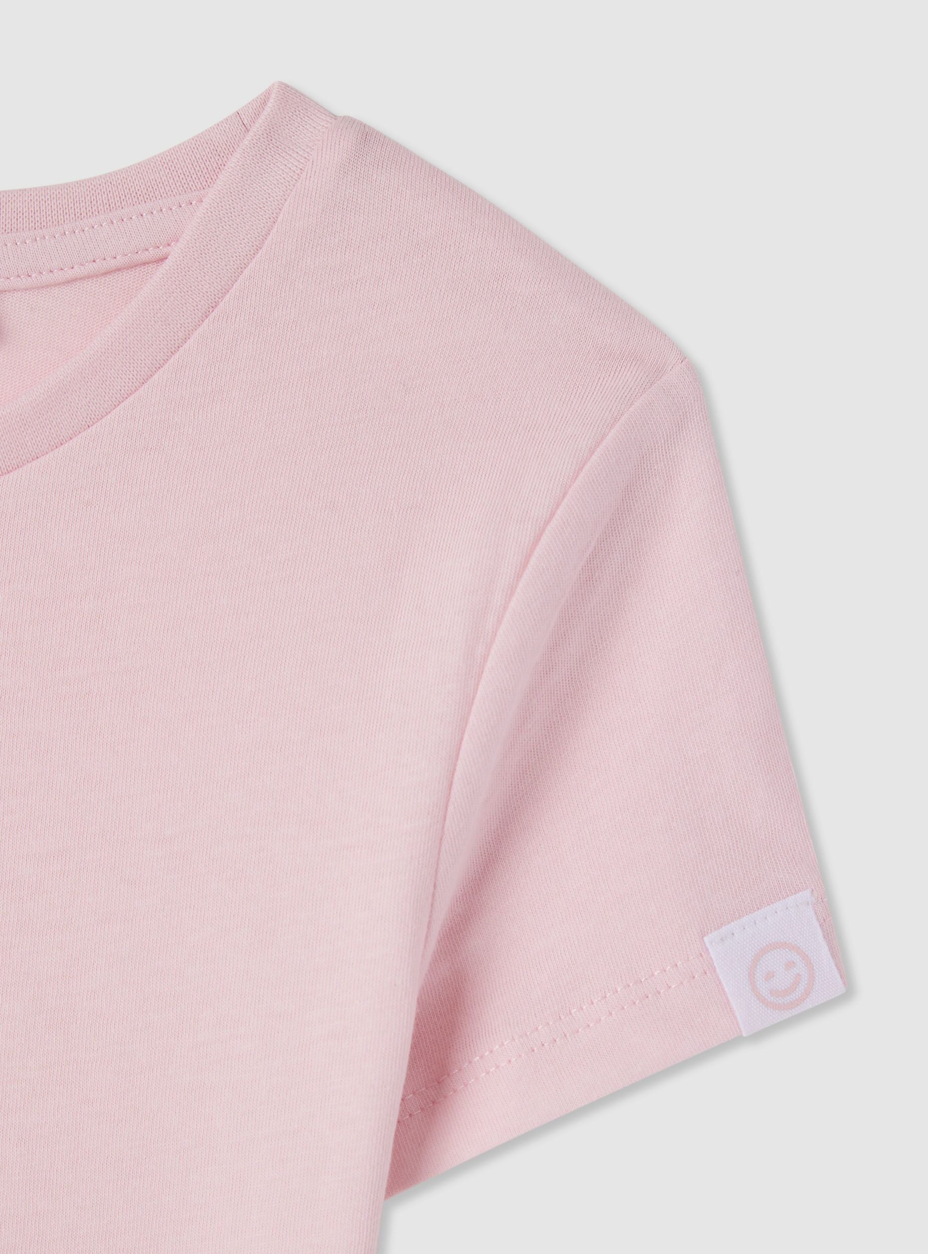 Majica za djevojčice jednobojna s okruglim izrezom i kratkim rukavima. Osnovni i svestrani model, idealan za školu i slobodno vrijeme, lako se kombinira s trapericama, suknjama ili kratkim hlačama. Regularni kroj koji osigurava svakodnevnu udobnost. Mala etiketa sa smiješkom na rukavu dodaje razigrani detalj. Savršena ispod dukseva ili jaknica u prijelaznim godišnjim dobima.Detalji