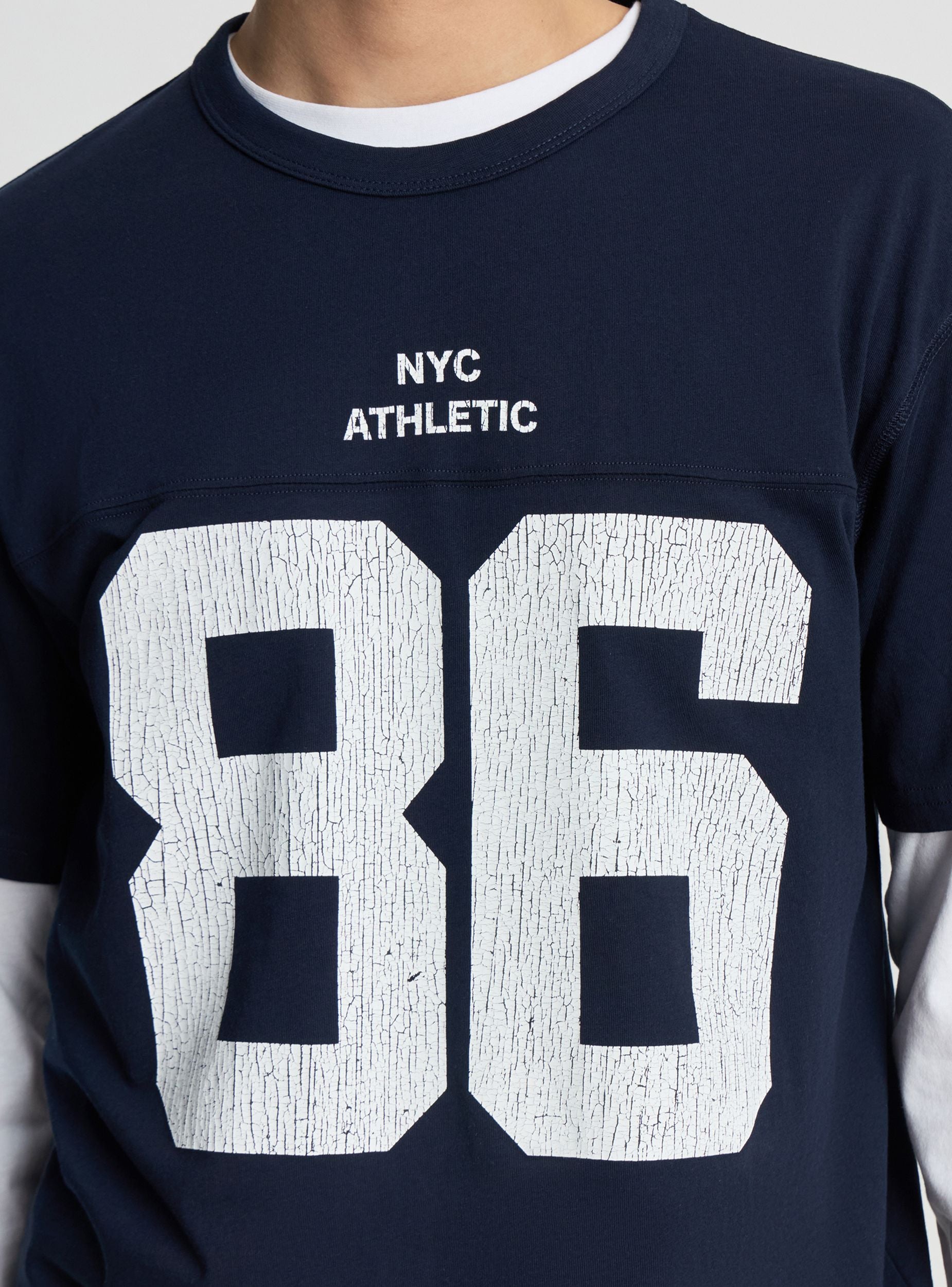 Muška majica s velikim printom sprijeda inspiriranim sveučilišnim stilom, print broja 86 s efektom istrošenosti i malim natpisom „NYC Athletic“. Model s kratkim rukavima, okruglim izrezom i opuštenim krojem, idealan za slobodno vrijeme i urbane kombinacije s trapericama ili trenirkama. Čiste linije na jednobojnoj stražnjoj strani i blago spušteni rameni šav. Savršena ispod duksa ili lagane jakne, dodaje sportski karakter svakom outfitu.Detalji