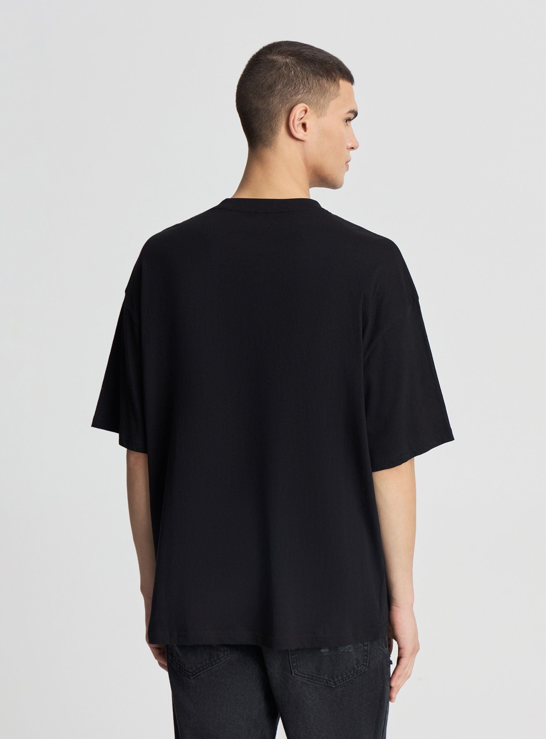 Muška majica oversize kroja s kratkim rukavima, idealna za casual i urbani stil. Okrugli izrez i spuštena ramena, ukrašena malim tiskanim natpisom u sredini prsa. Savršena uz traperice i tenisice u slobodno vrijeme ili ispod otvorene košulje za street look. Jednobojni dizajn s kontrastnim natpisom, lako se kombinira u svako godišnje doba.Detalji