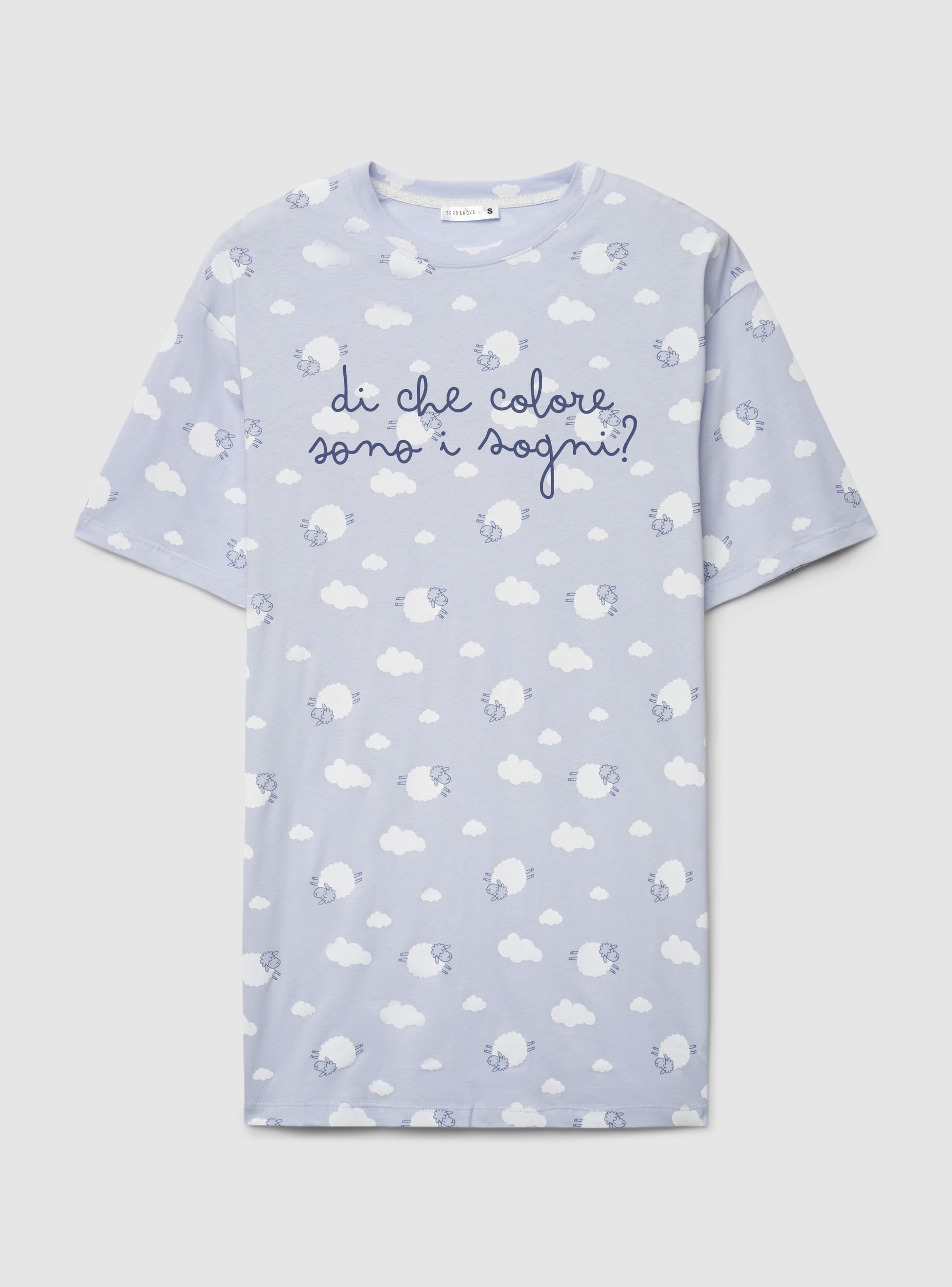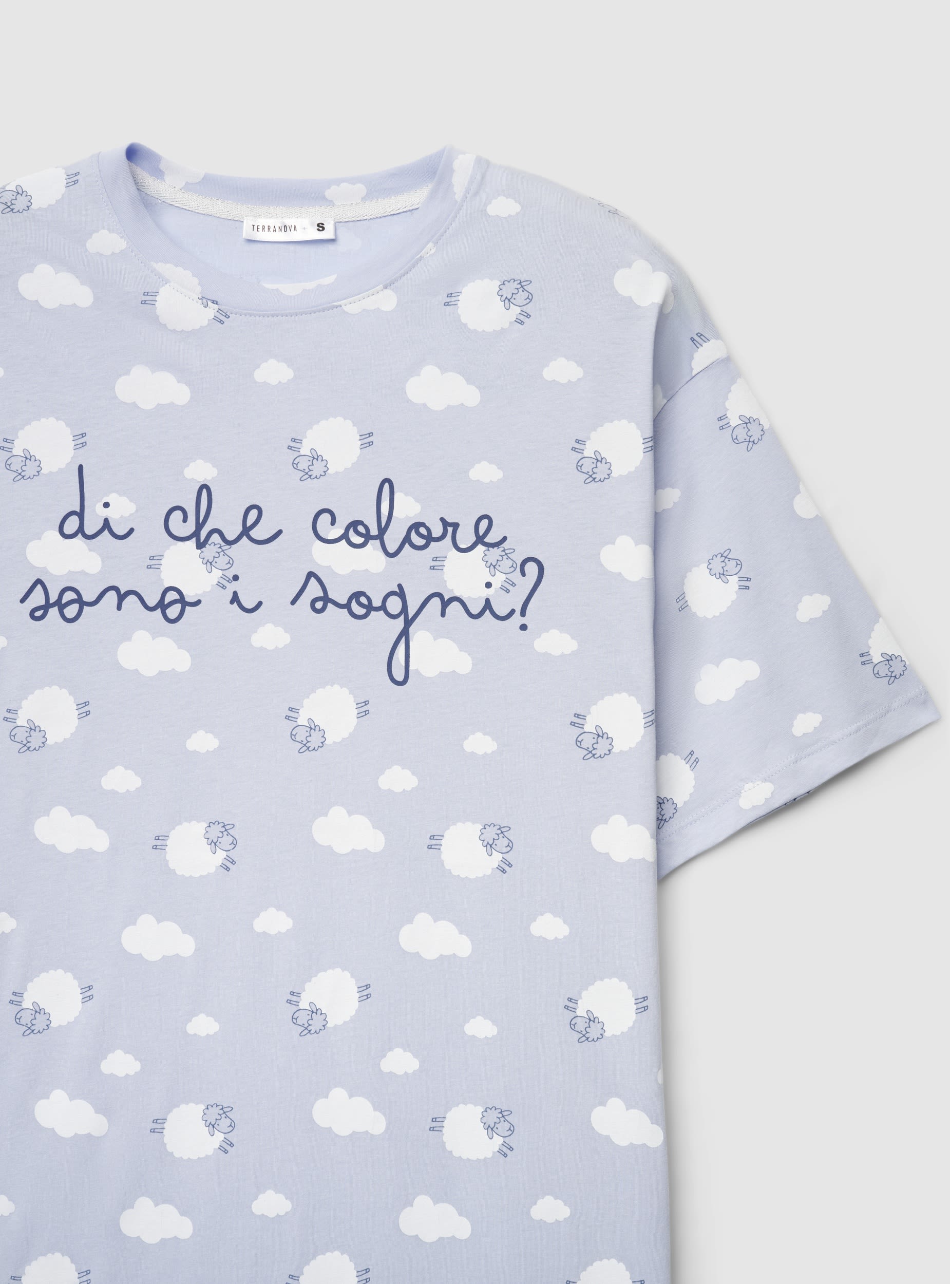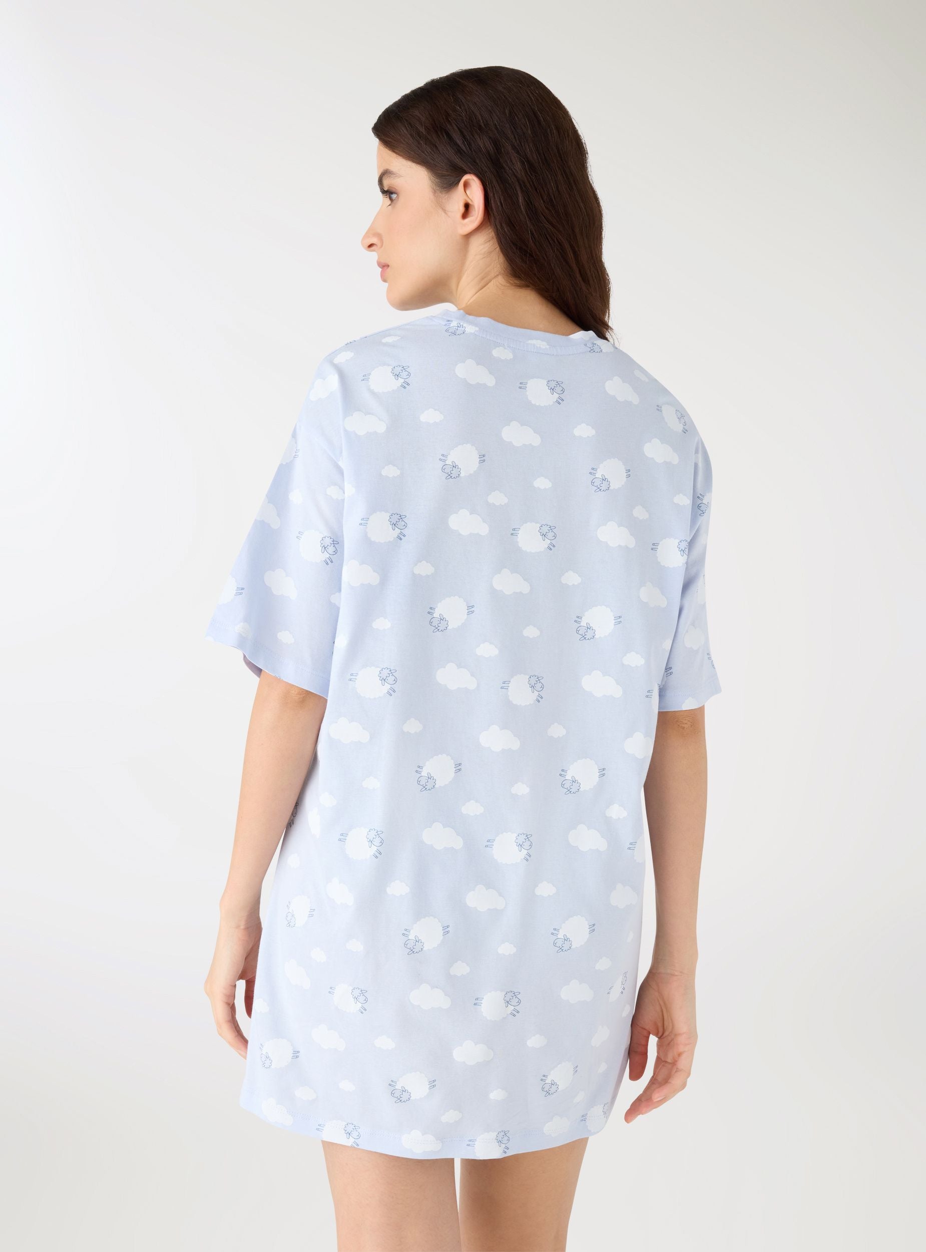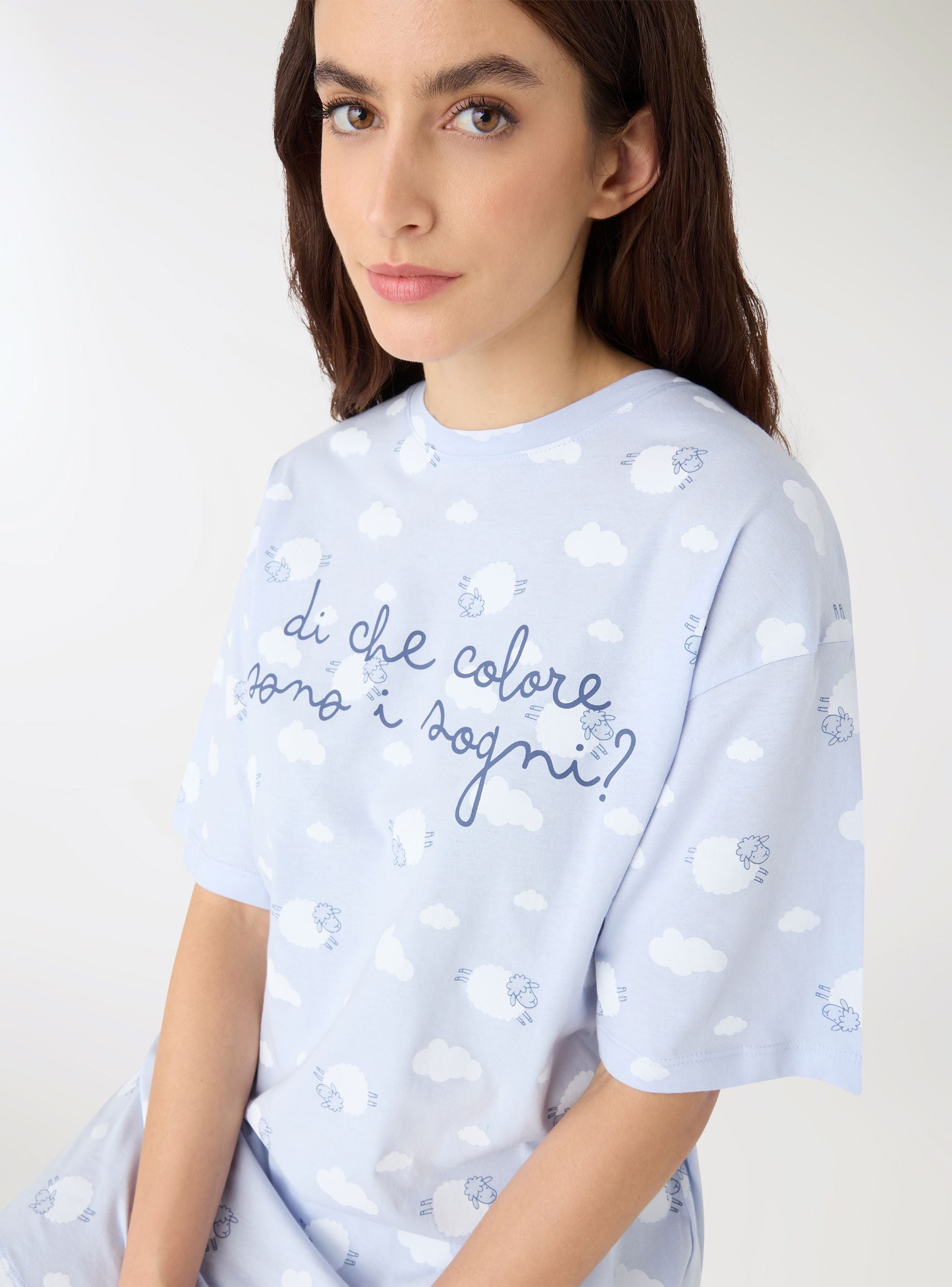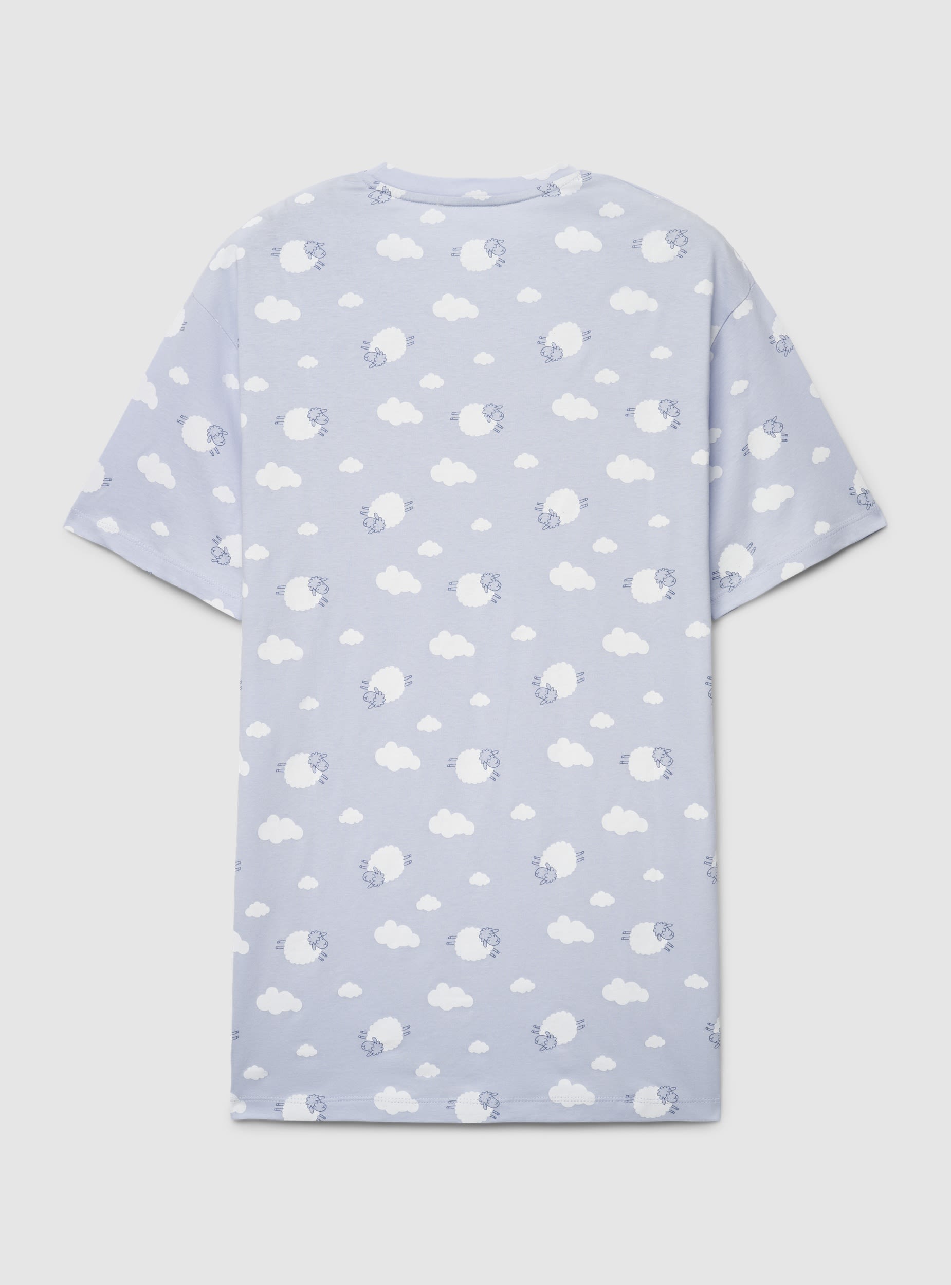 Ženska majica kratkih rukava s oversized krojem i okruglim izrezom, u potpunosti ukrašena printom oblaka, ovaca i natpisom sprijeda. Savršena za slobodno vrijeme i trenutke opuštanja. Ravni rub i blago spuštena ramena upotpunjuju dizajn.Detalji