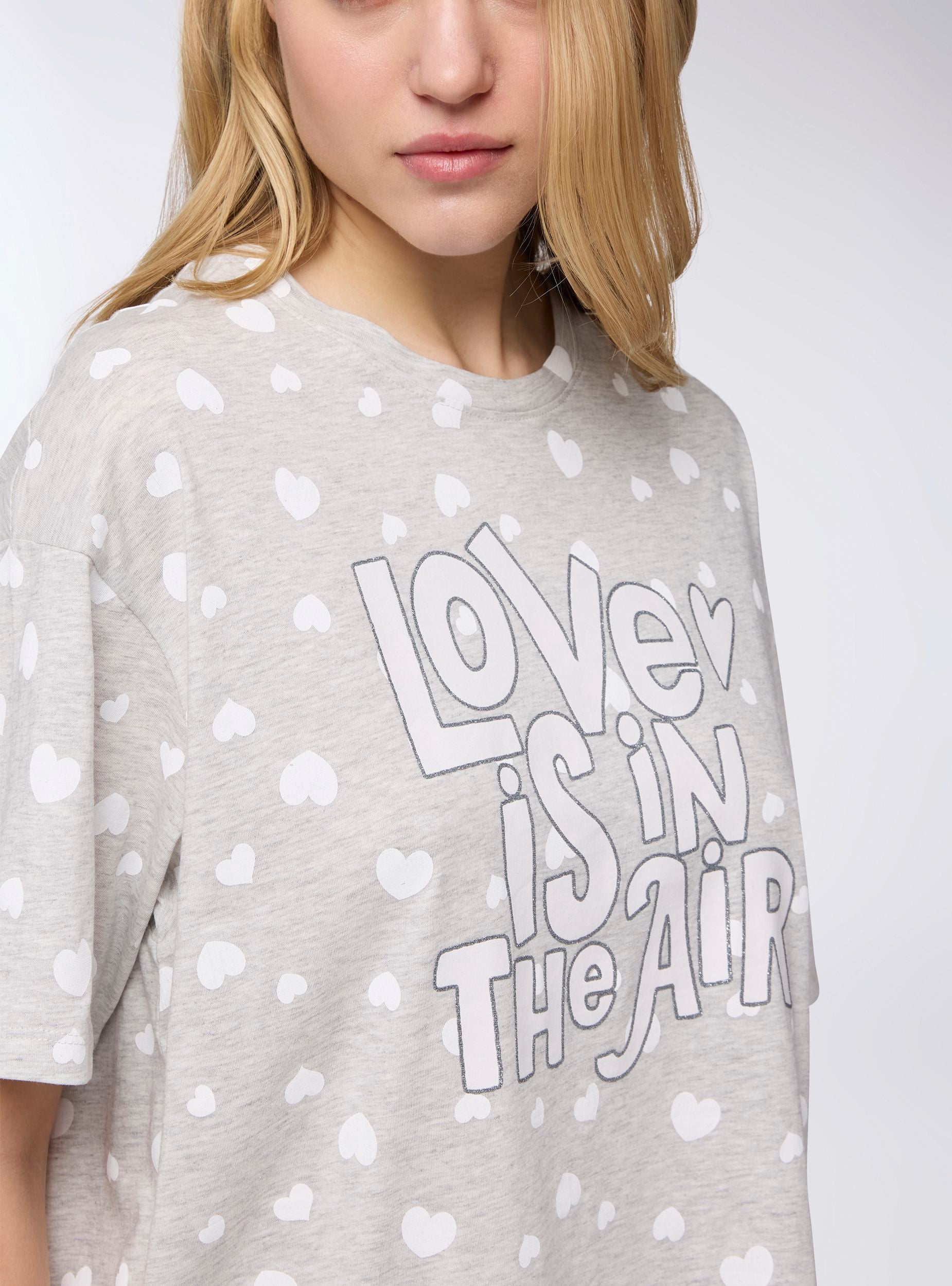 Ženska dugotrajna majica savršena kao pidžama, s overdimenzioniranim krojem koji osigurava udobnost i slobodu kretanja. Dizajn s kratkim rukavima i okruglim izrezom pruža osjećaj mekoće idealan za opuštanje. Print s srcima i natpisom dodaje romantičan i razigran dodir. Idealna sama ili u kombinaciji s tajicama ili kratkim hlačama za spavanje, savršena je za večeri potpunog blagostanja i slatkih trenutaka odmora.Detalji