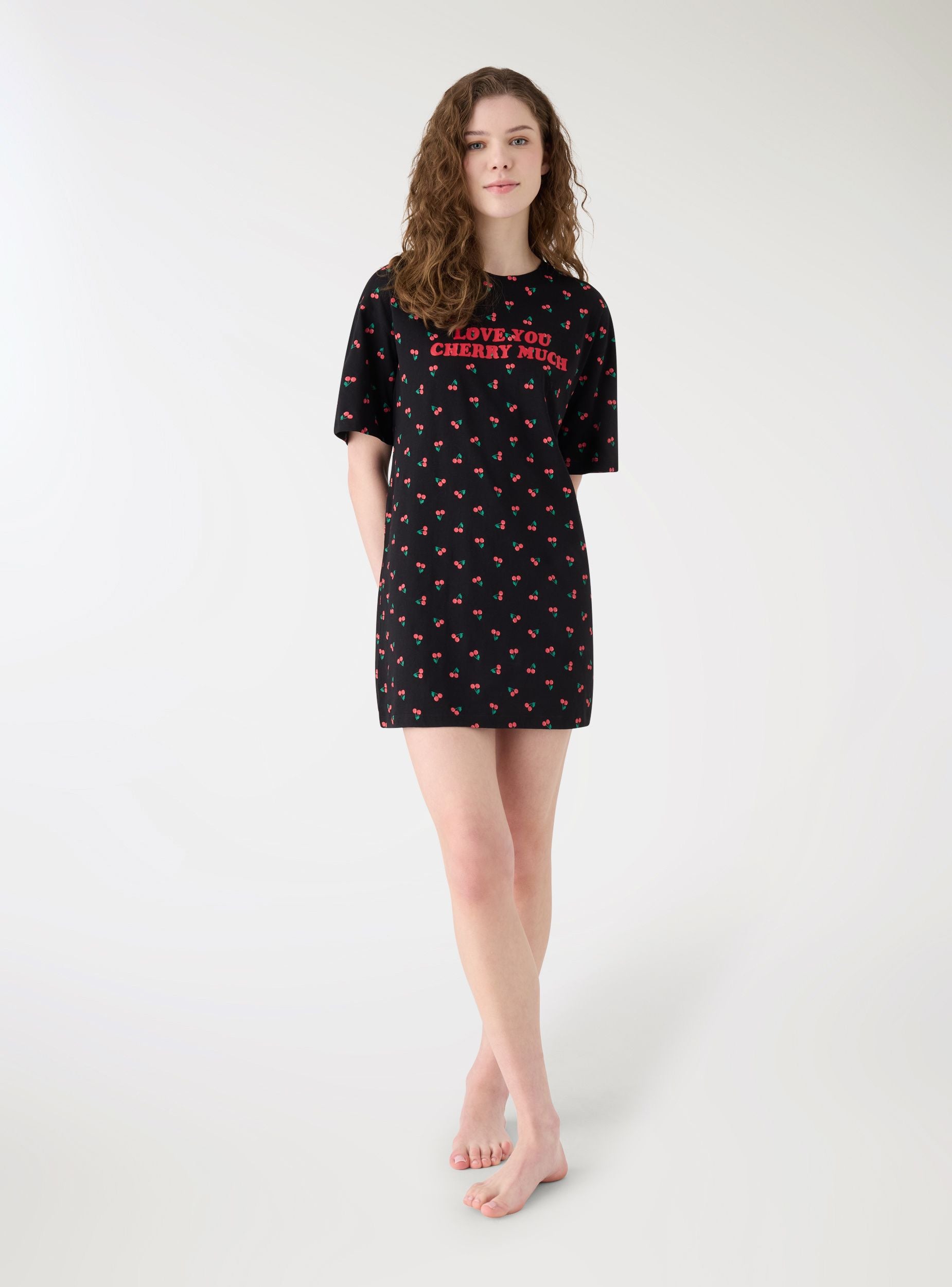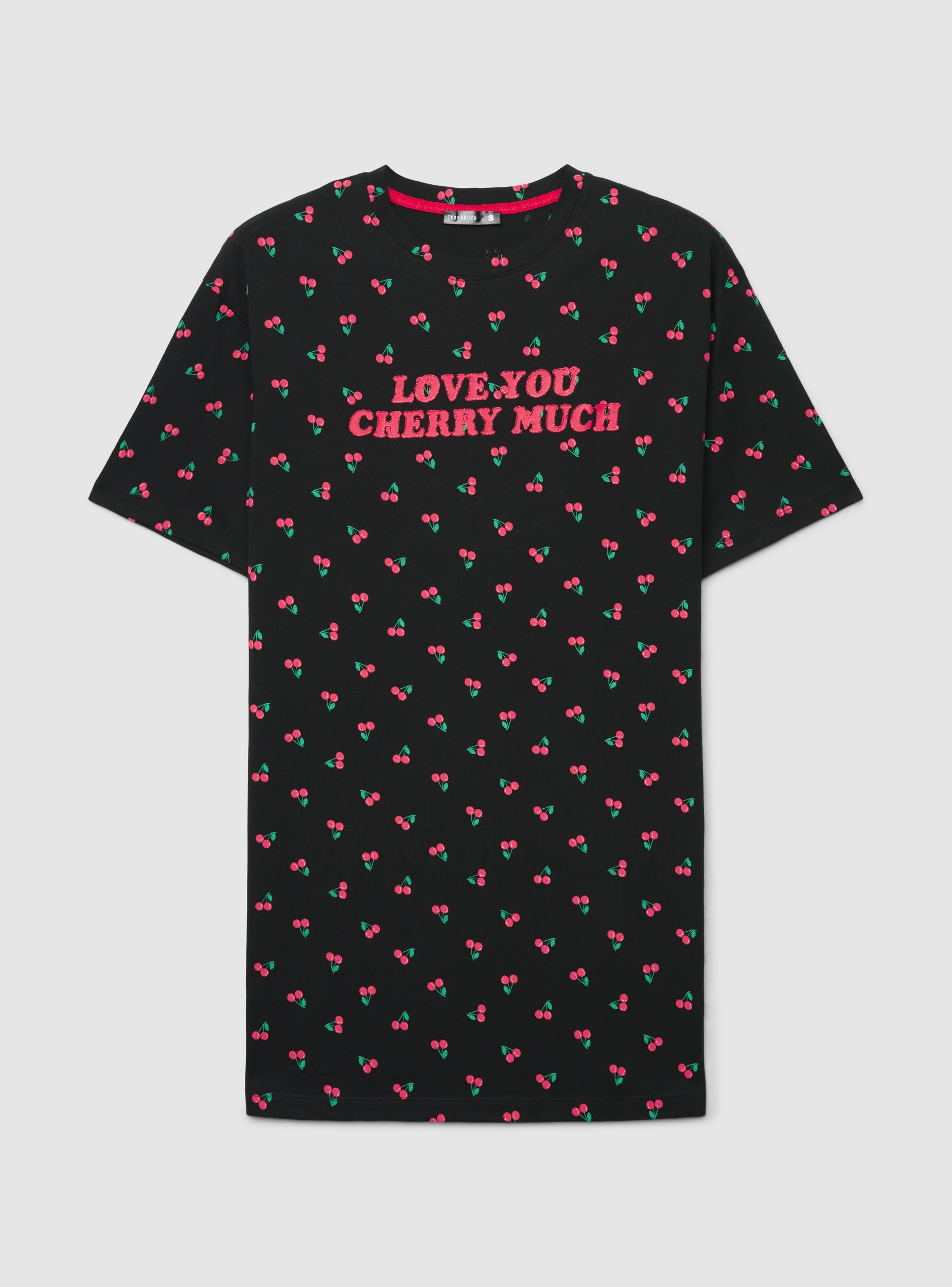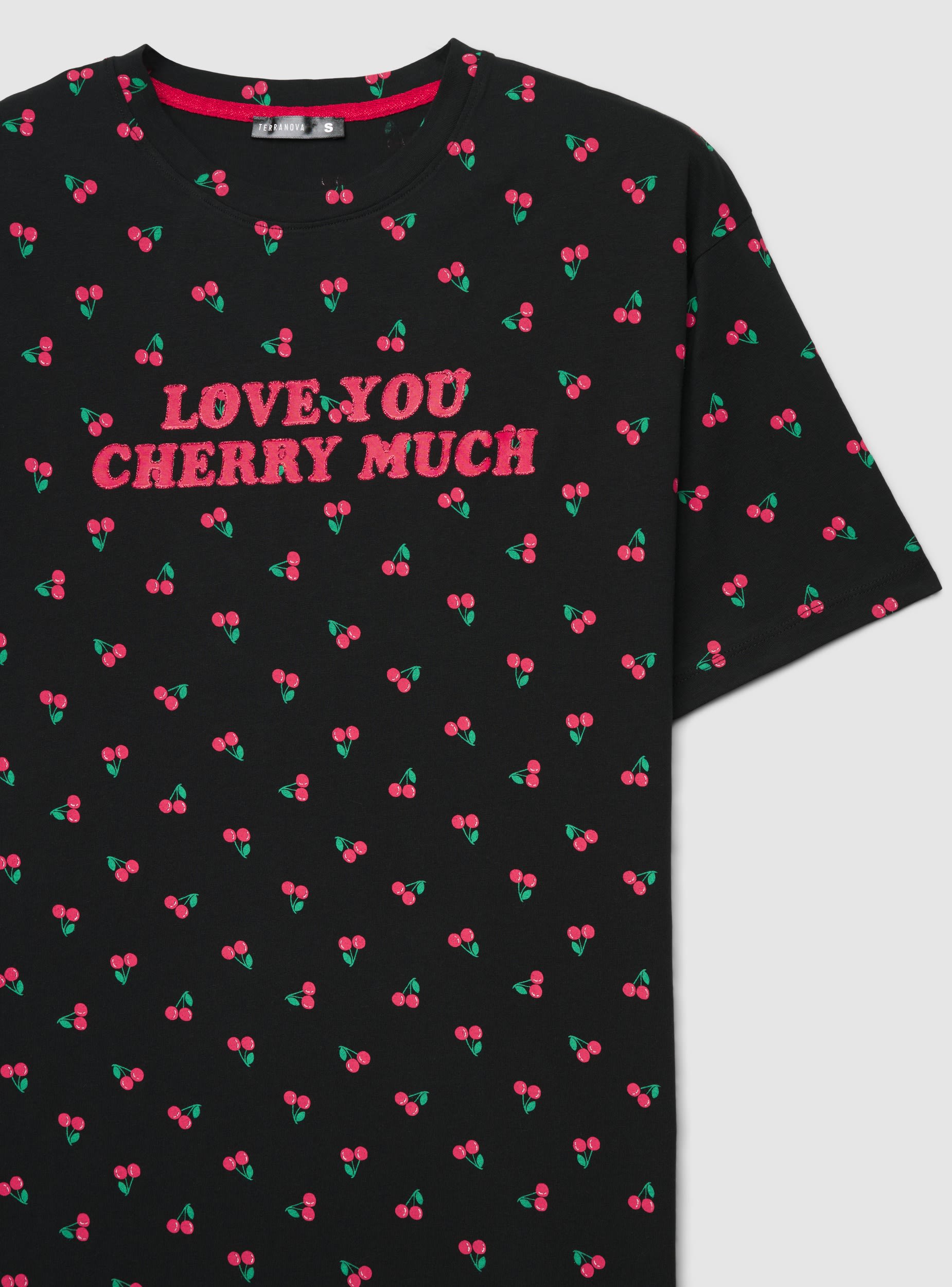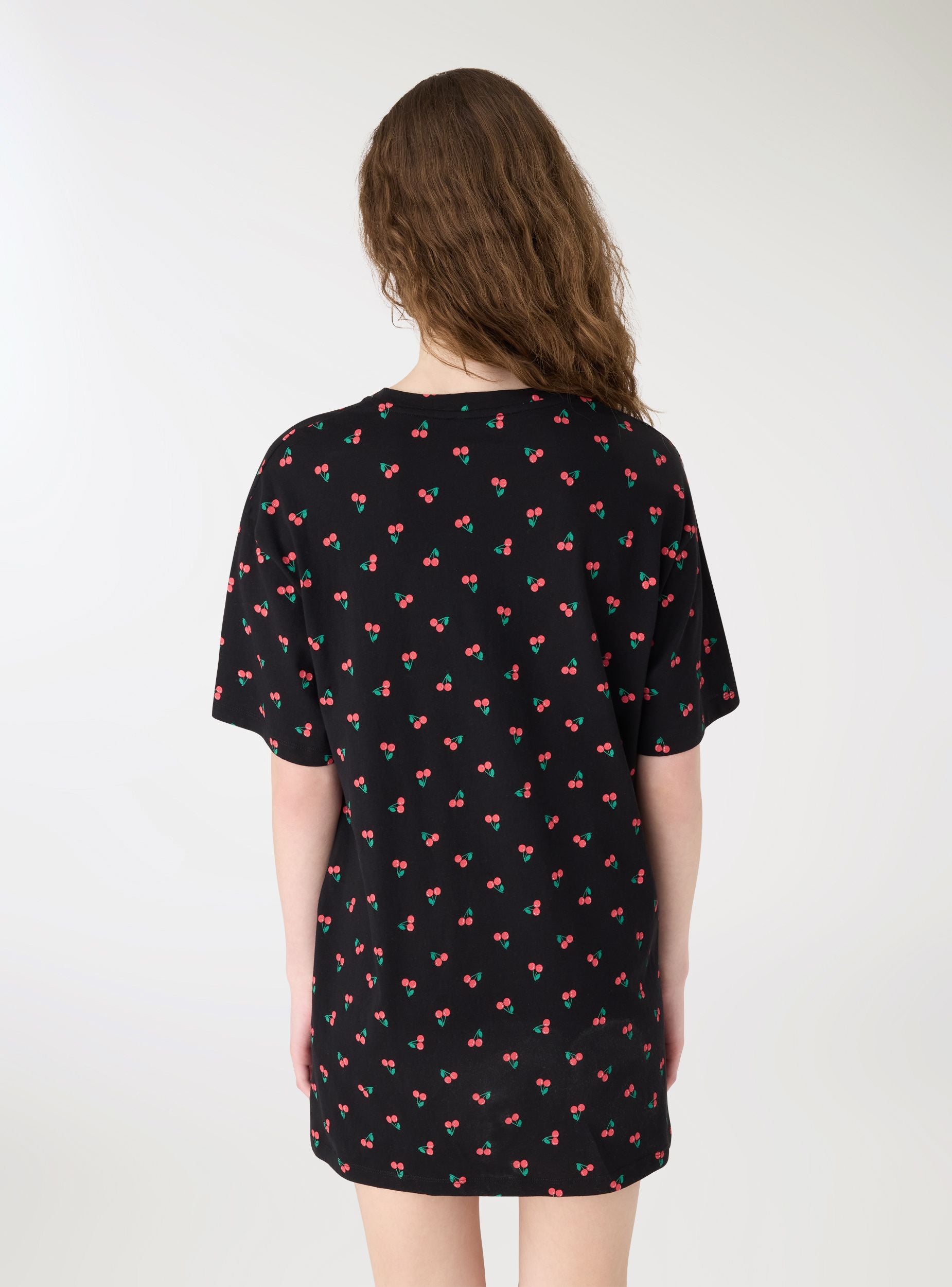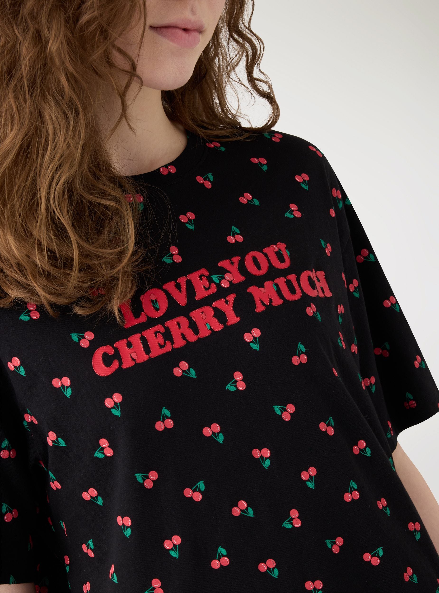 Ženska majica kratkih rukava s oversize krojem, savršena za casual i urbani stil. Ima okrugli izrez i all-over print s voćnim motivom te istaknut natpis sprijeda, idealna za kombiniranje s trapericama ili kratkim hlačama i tenisicama. Živopisni uzorak koji daje karakter tvojim svakodnevnim outfitima, udobna za slobodno vrijeme i izlaske s prijateljima.Detalji