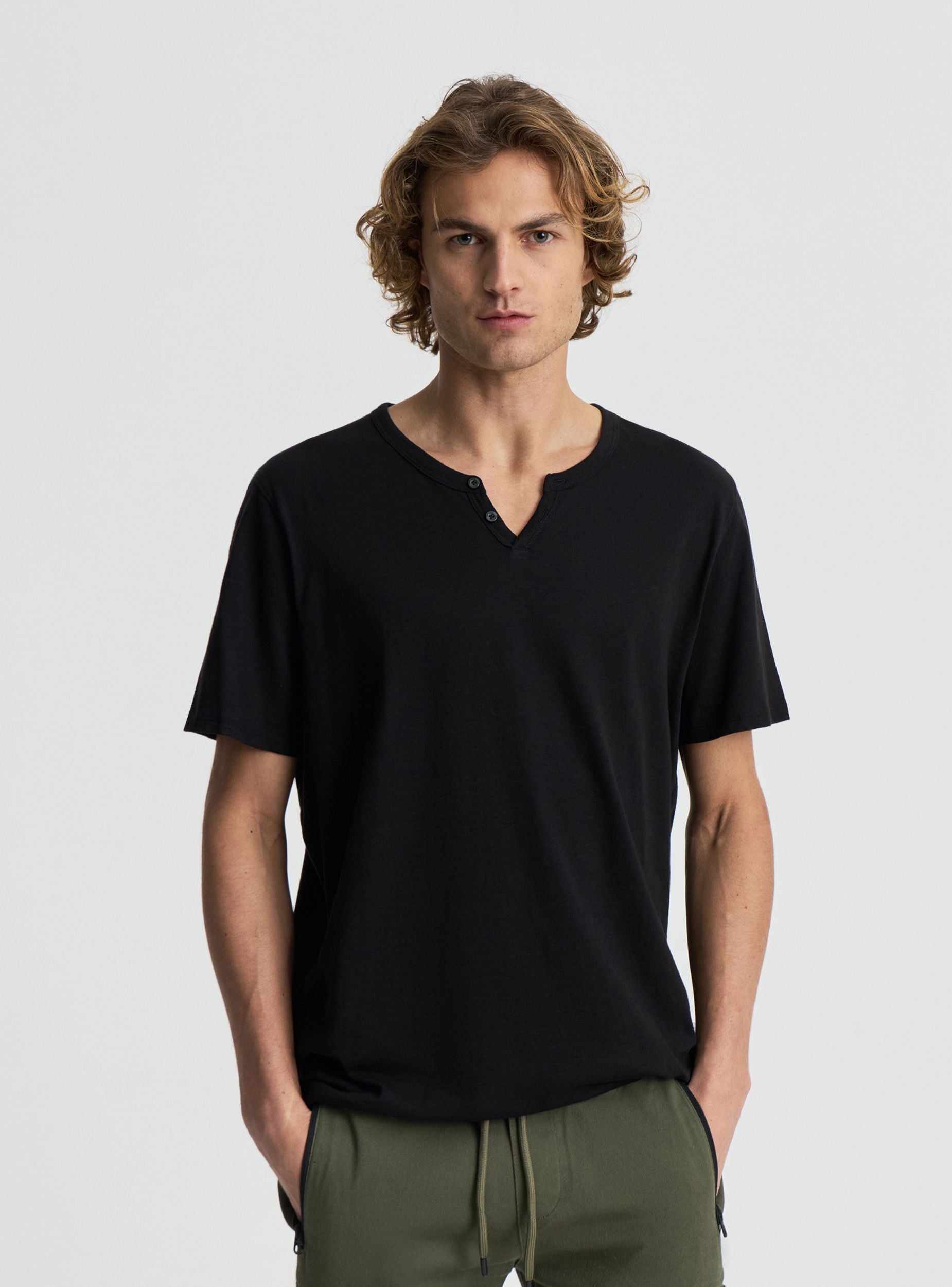 Muška majica kratkih rukava s dvostrukim V-izrezom s dva gumba i jednobojnim izgaranjem. Idealna za slobodno vrijeme i ležeran izgled, lako se kombinira s trapericama ili chinos hlačama i tenisicama. Regularan kroj s ravnim rubom, otvoreni V-izrez s kratkim preklopom i malim gumbima. Svestran komad za svaki dan, također savršen ispod lagane košulje ili dukserice.Detalji