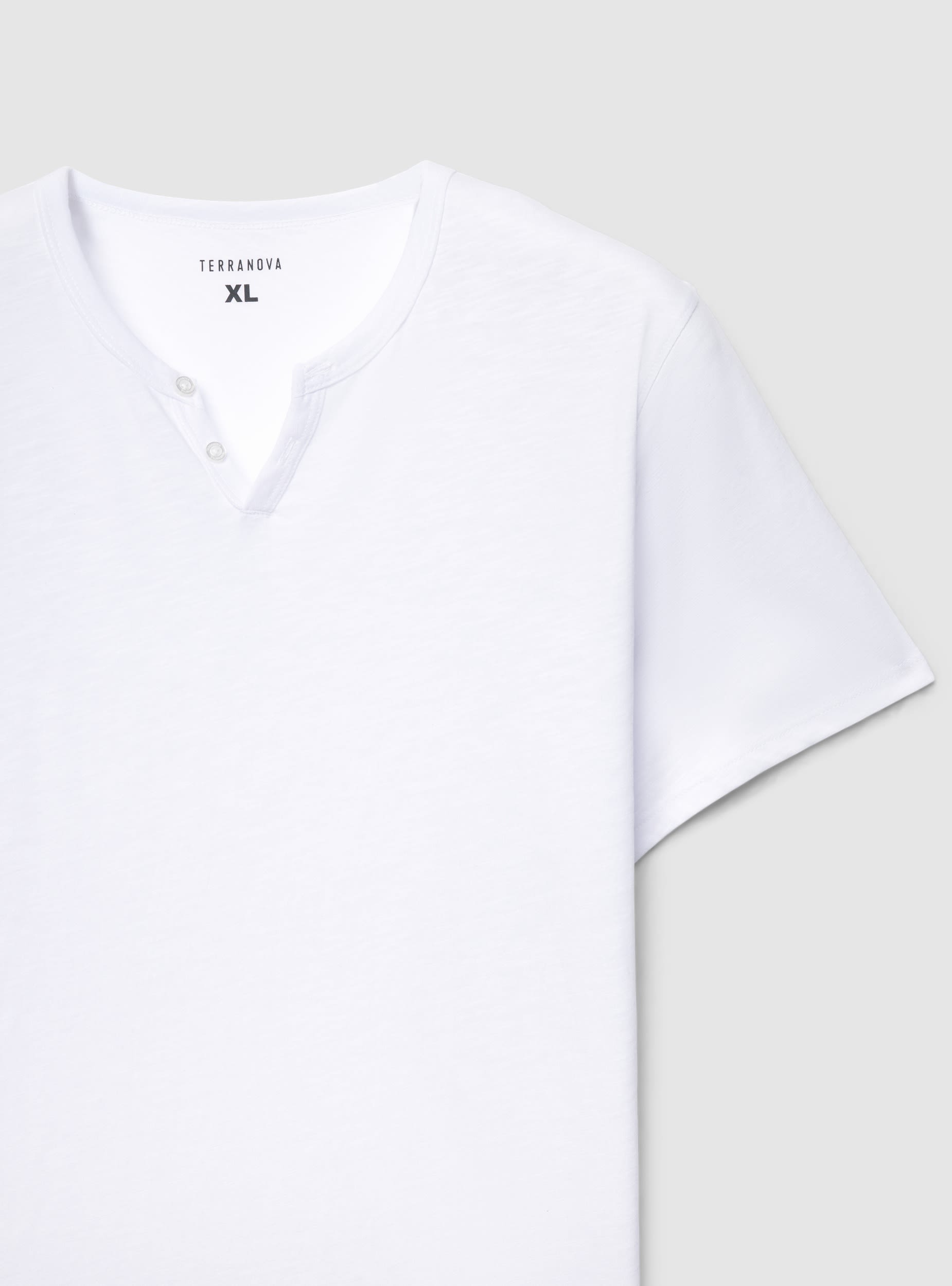 Muška majica kratkih rukava s serafinskim izrezom i dva gumba, u jednobojnoj izvedbi s efektnim prženjem. Idealna za slobodno vrijeme i ležeran izgled, lako se kombinira s trapericama ili chino hlačama i tenisicama. Regularan kroj s ravnim rubom, otvoreni serafinski ovratnik s kratkim preklopom i malim gumbima. Svestran odjevni predmet za svaki dan, savršen i ispod lagane košulje ili trenirke.Detalji