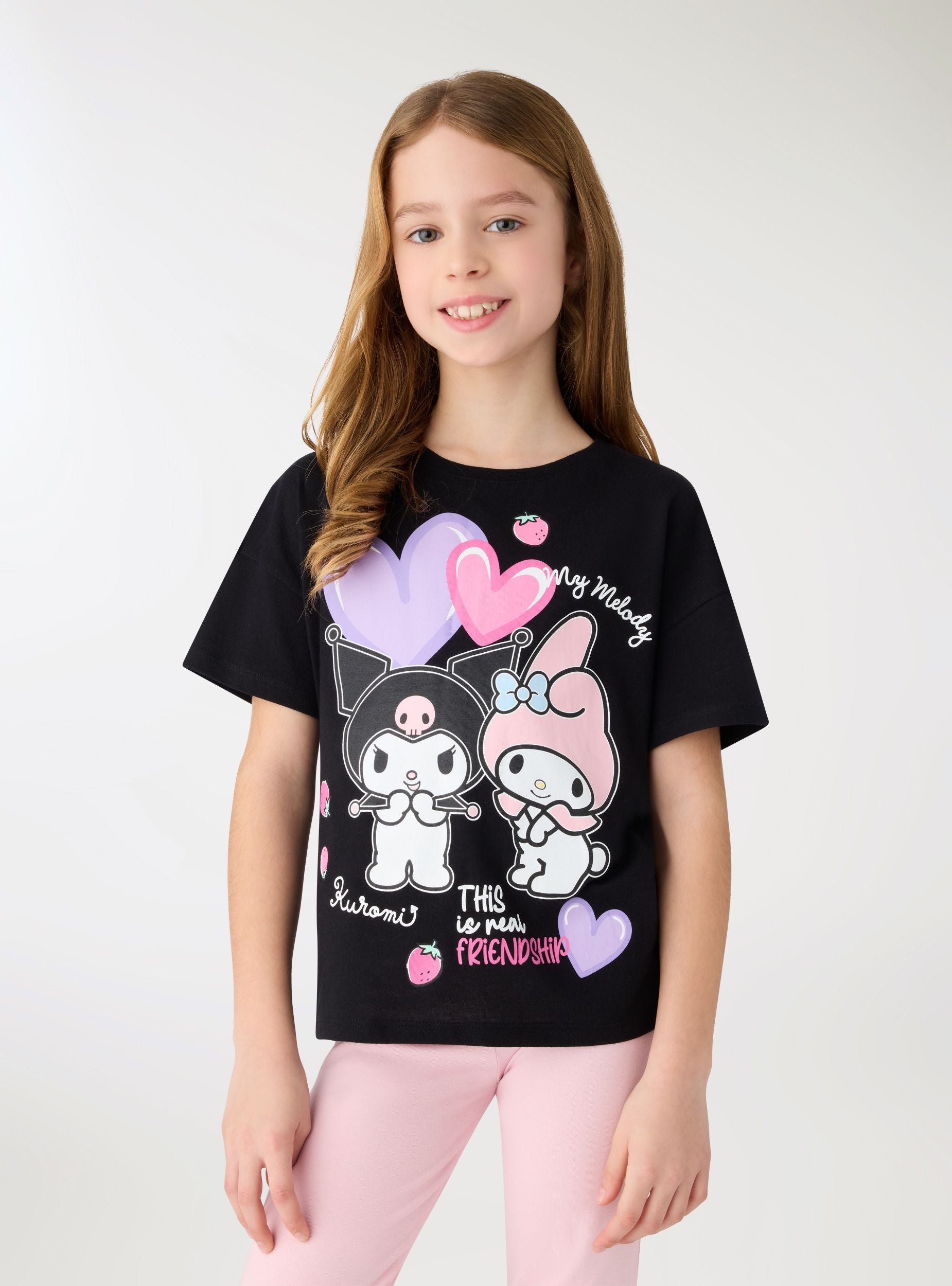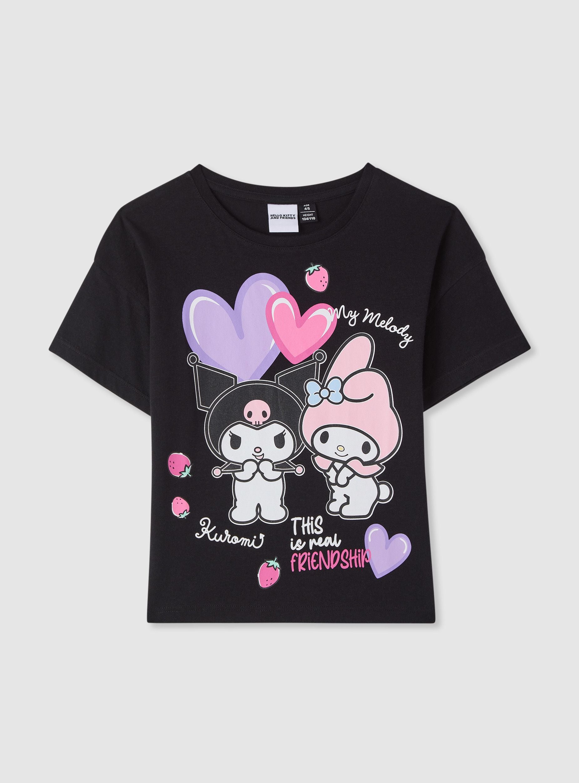 Majica za djevojčice s printom sprijeda posvećena likovima Kuromi® i My Melody, savršena za slobodno vrijeme i školu. Model s kratkim rukavima i okruglim izrezom, regularnog kroja i dužine do bokova. Grafika s srcima i jagodama daje razigrani dodir koji se lako kombinira s trapericama, kratkim hlačama ili suknjama. Idealna ispod dukserica ili laganih jakni za casual izgled.Detalji