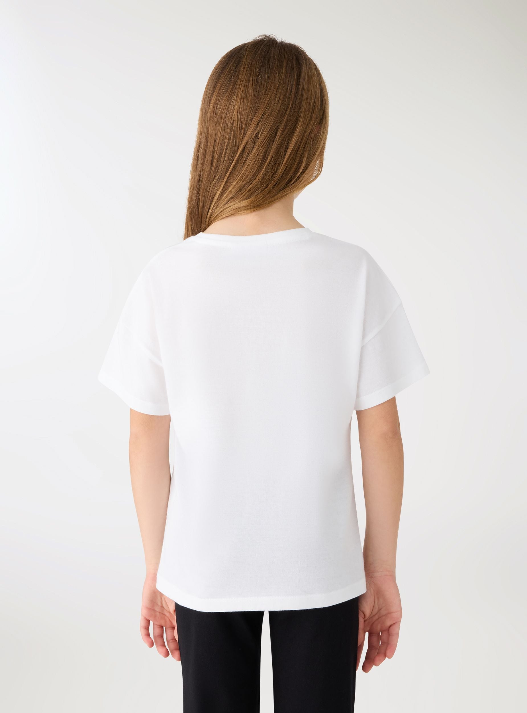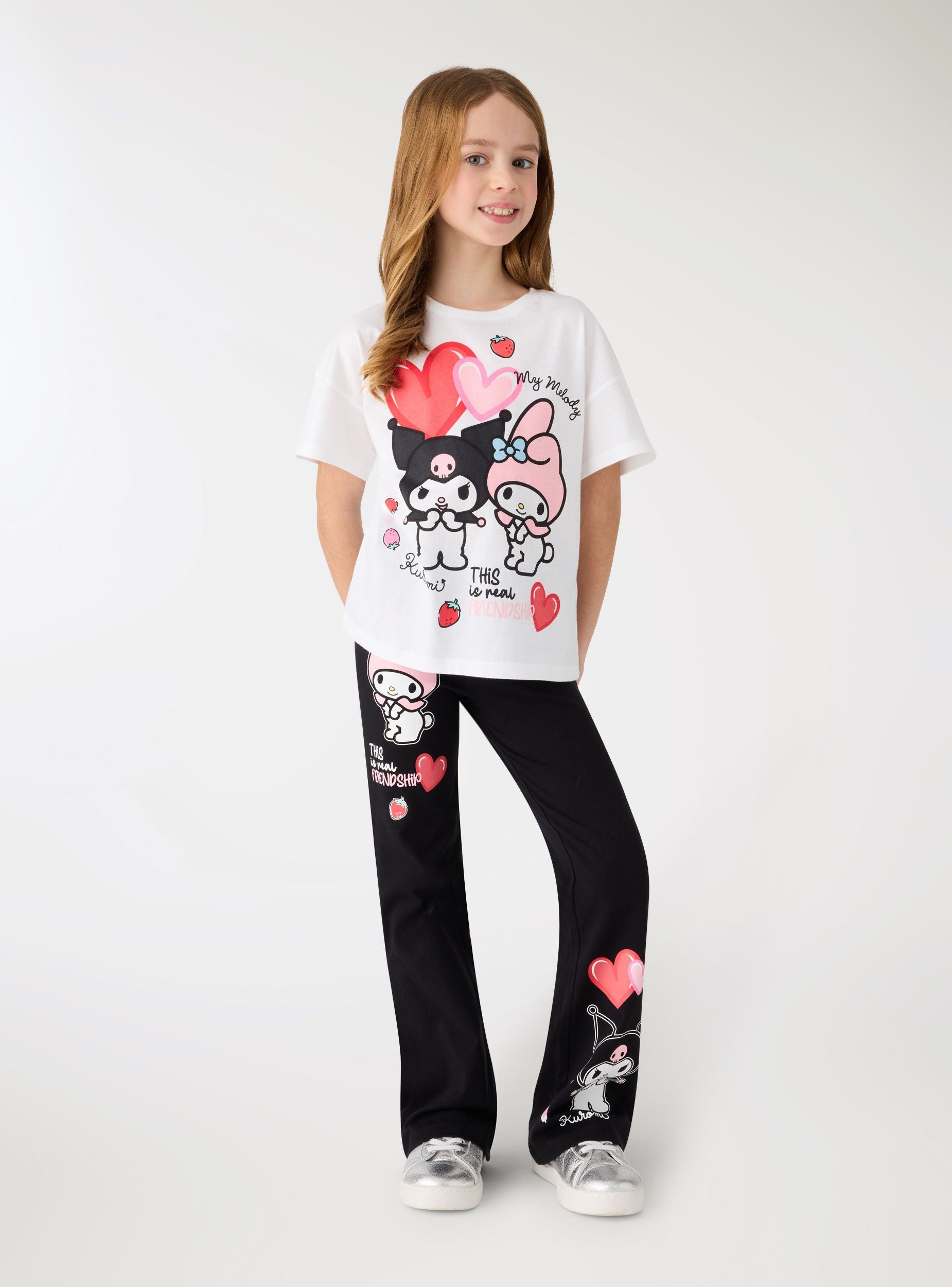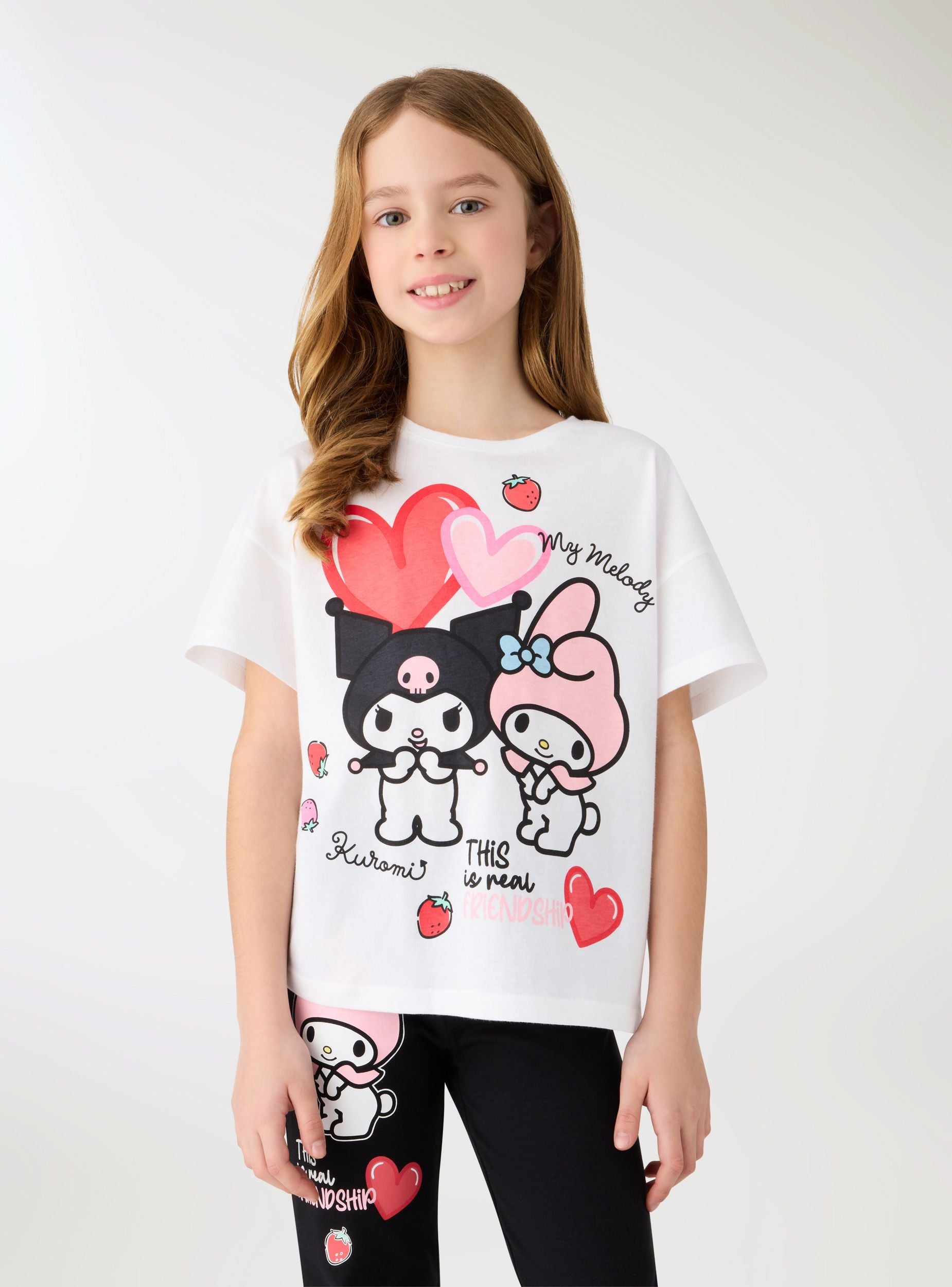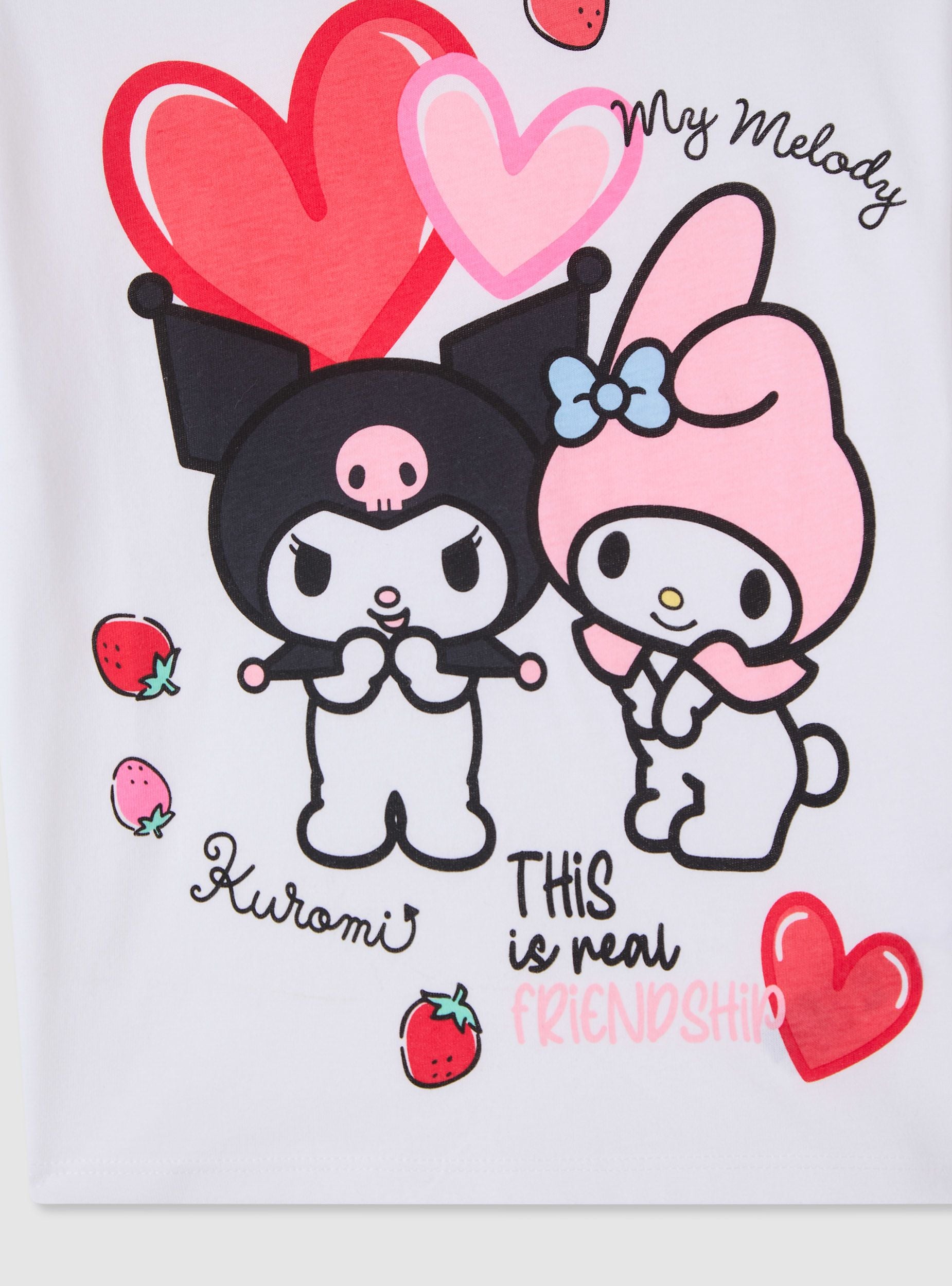 Majica za djevojčice s printom sprijeda posvećena likovima Kuromi® i My Melody, savršena za slobodno vrijeme i školu. Model s kratkim rukavima i okruglim izrezom, regularnog kroja i dužine do bokova. Grafika s srcima i jagodama daje razigrani dodir koji se lako kombinira s trapericama, kratkim hlačama ili suknjicama. Idealna za nošenje ispod dukserica ili laganih jakni za casual izgled.Detalji