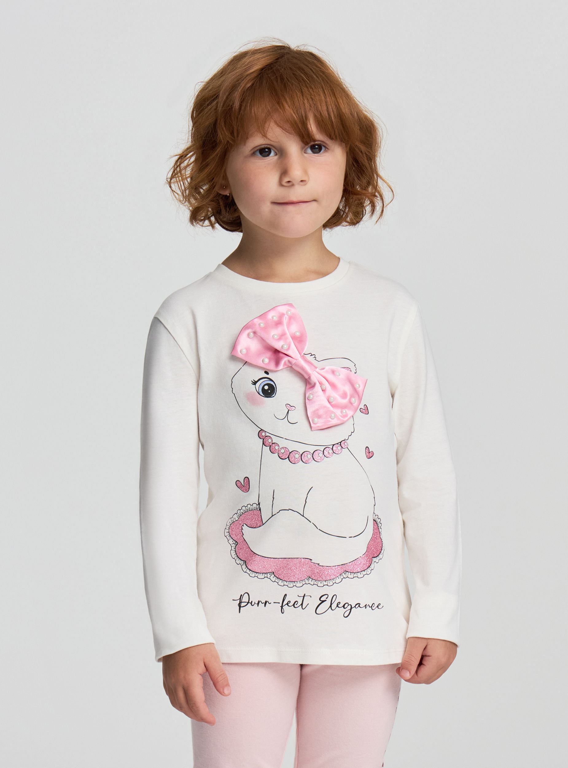 Majica za djevojčice s dugim rukavima, idealna za ležeran i udoban izgled. Ima dizajn s printom mačkice i ukrasnim aplikacijama mašne s perlicama koje dodaju razigrani i originalni dodir. Savršena za kombiniranje s trapericama ili sportskim hlačama za svakodnevni outfit. Krojenje je udobno, pogodno za školske aktivnosti ili slobodno vrijeme.Detalji