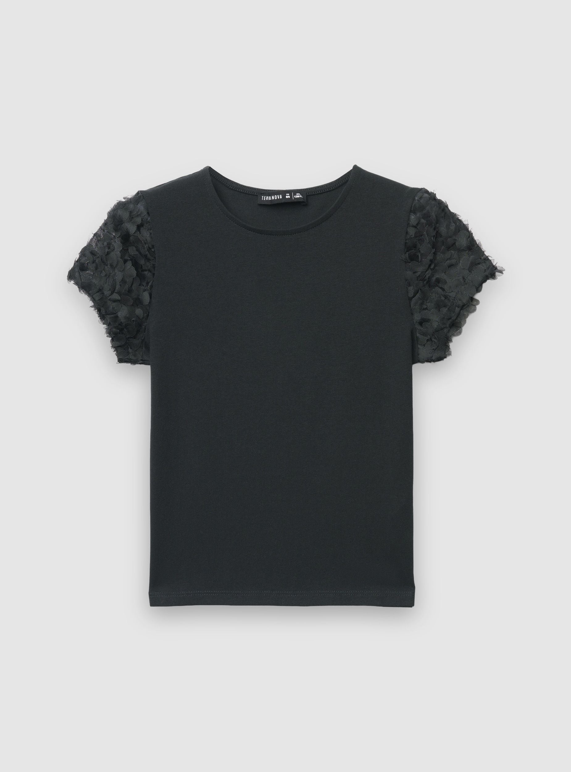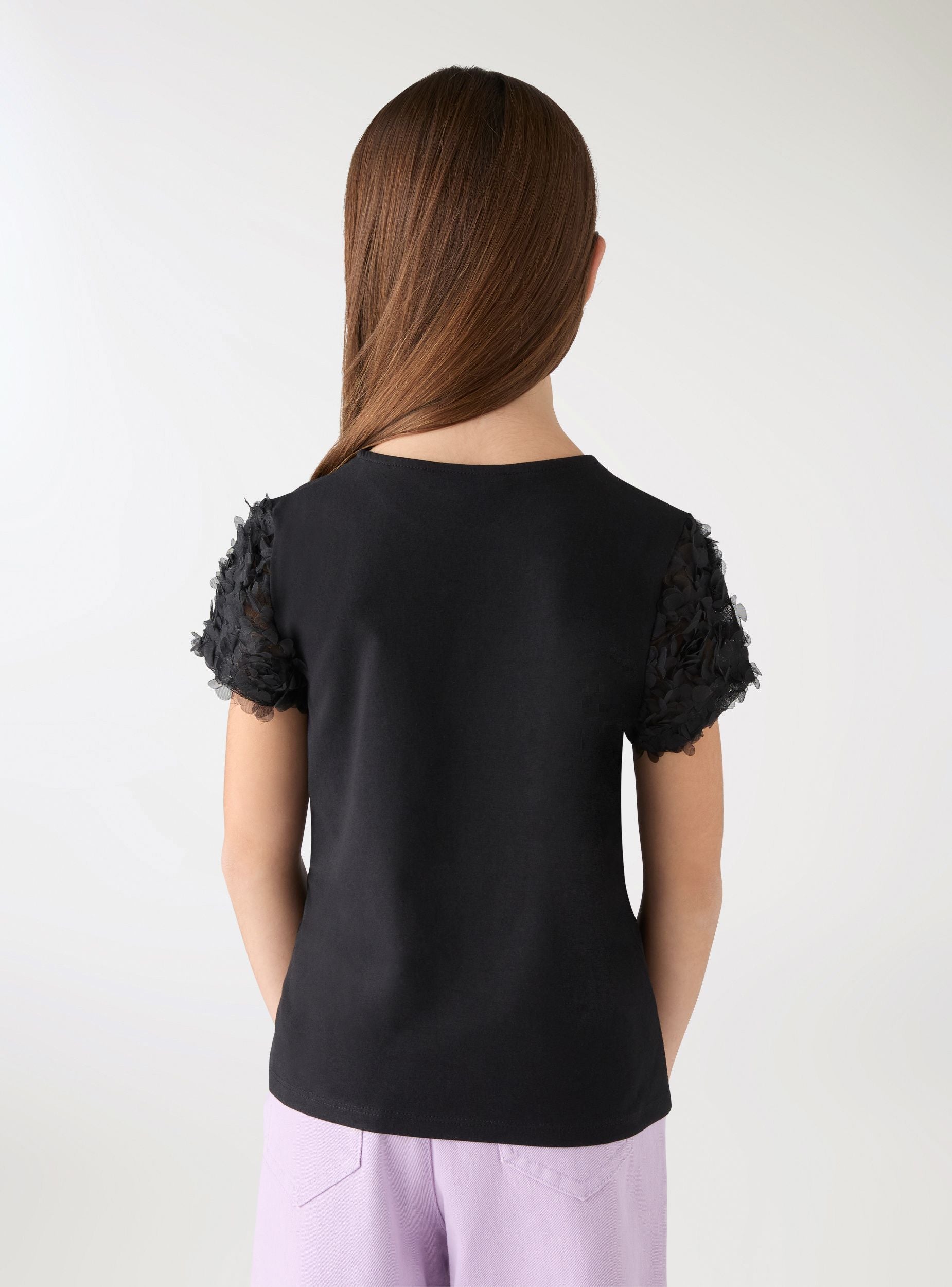 Majica za djevojčice u jednobojnoj varijanti s okruglim izrezom i kratkim rukavima od tila ukrašenim laticama, idealna za svakodnevne kombinacije s romantičnim prizvukom. Savršena za kombiniranje s trapericama, suknjama ili kratkim hlačama za izlaske, zabave i školu. Lagano voluminozni rukavi dodaju pokret i čine odjevni predmet svestranim za mnoge prilike.Detalji