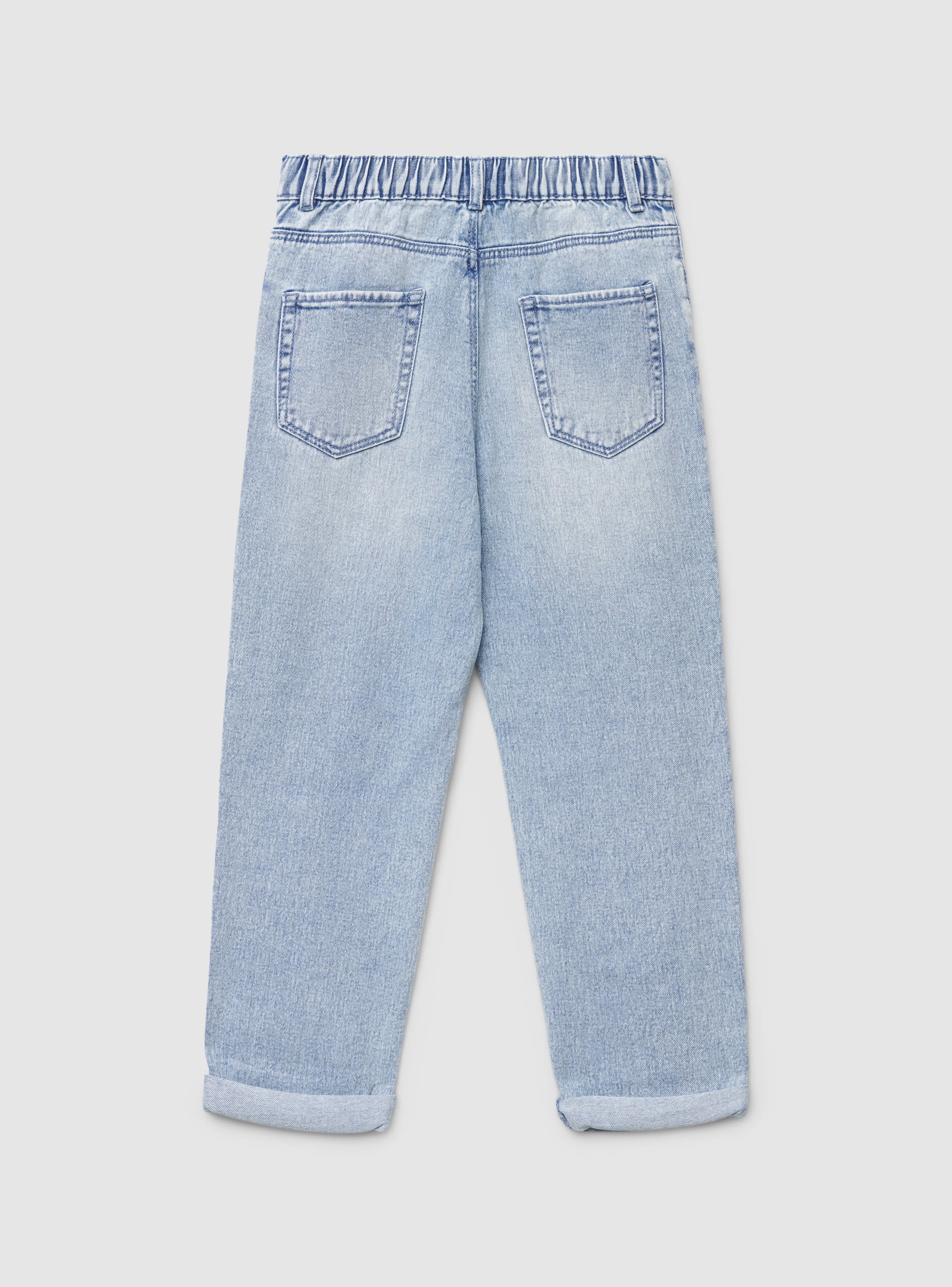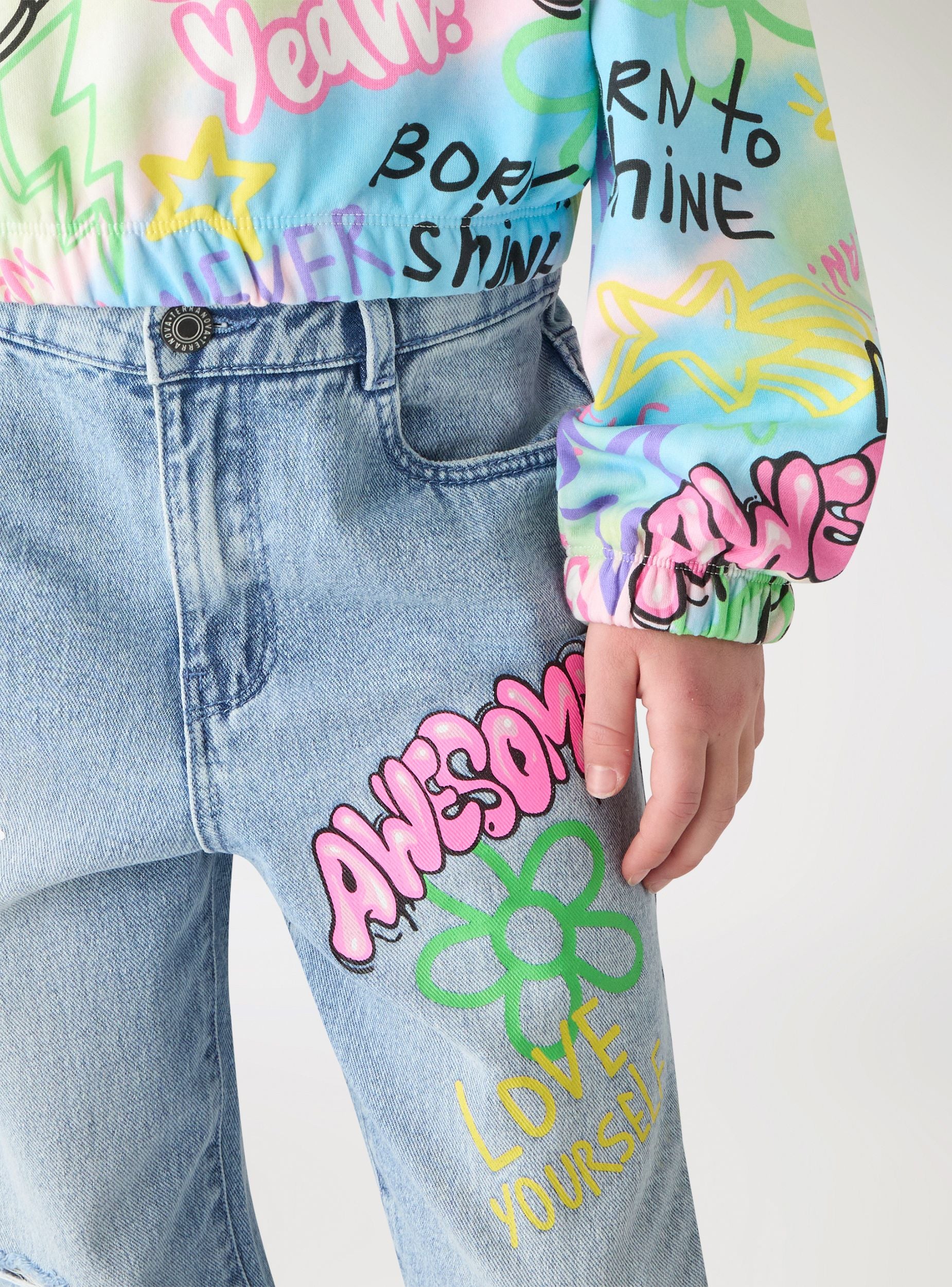 Traperice za djevojčice s krojem mom, savršene za ležerne i urbane outfite. Struk s prorezima za remen i elastičnom trakom straga, zatvaranje na gumb i patentni zatvarač, pet džepova s malim džepićem. Srednje pranje i poderotine sprijeda. Tisak s živopisnim grafičkim motivima duž cijele nogavice za razigrani dodir. Nosite ih s hoodicom i tenisicama za školu ili s majicom i laganom jaknom u slobodno vrijeme.Detalji