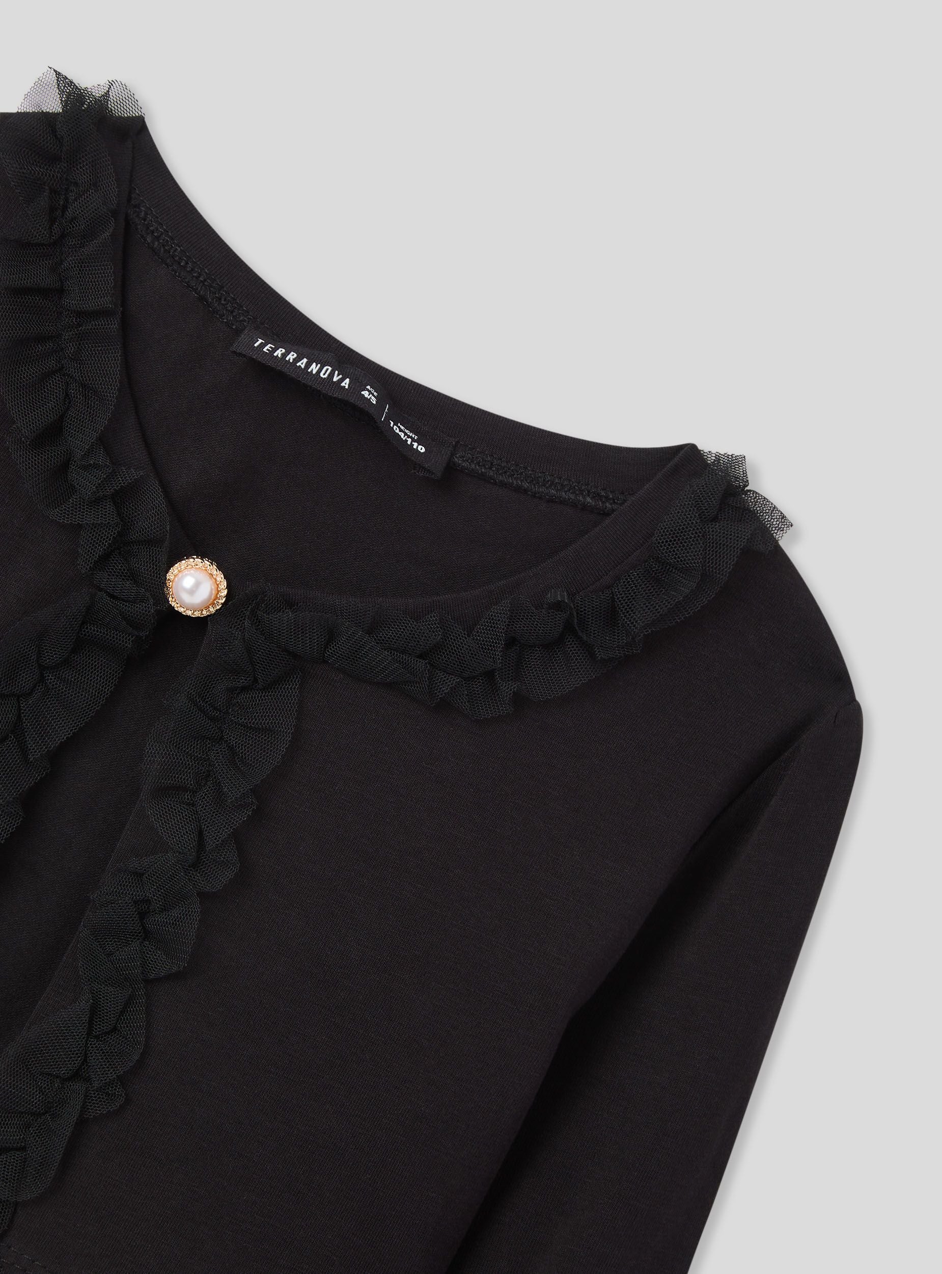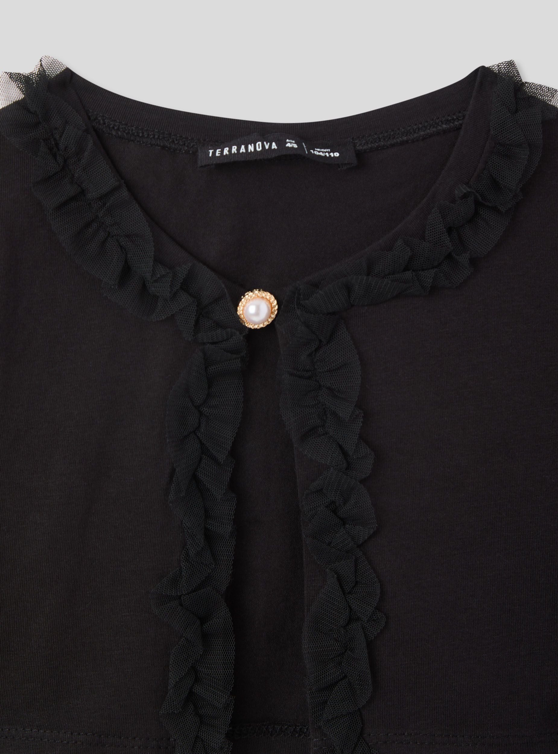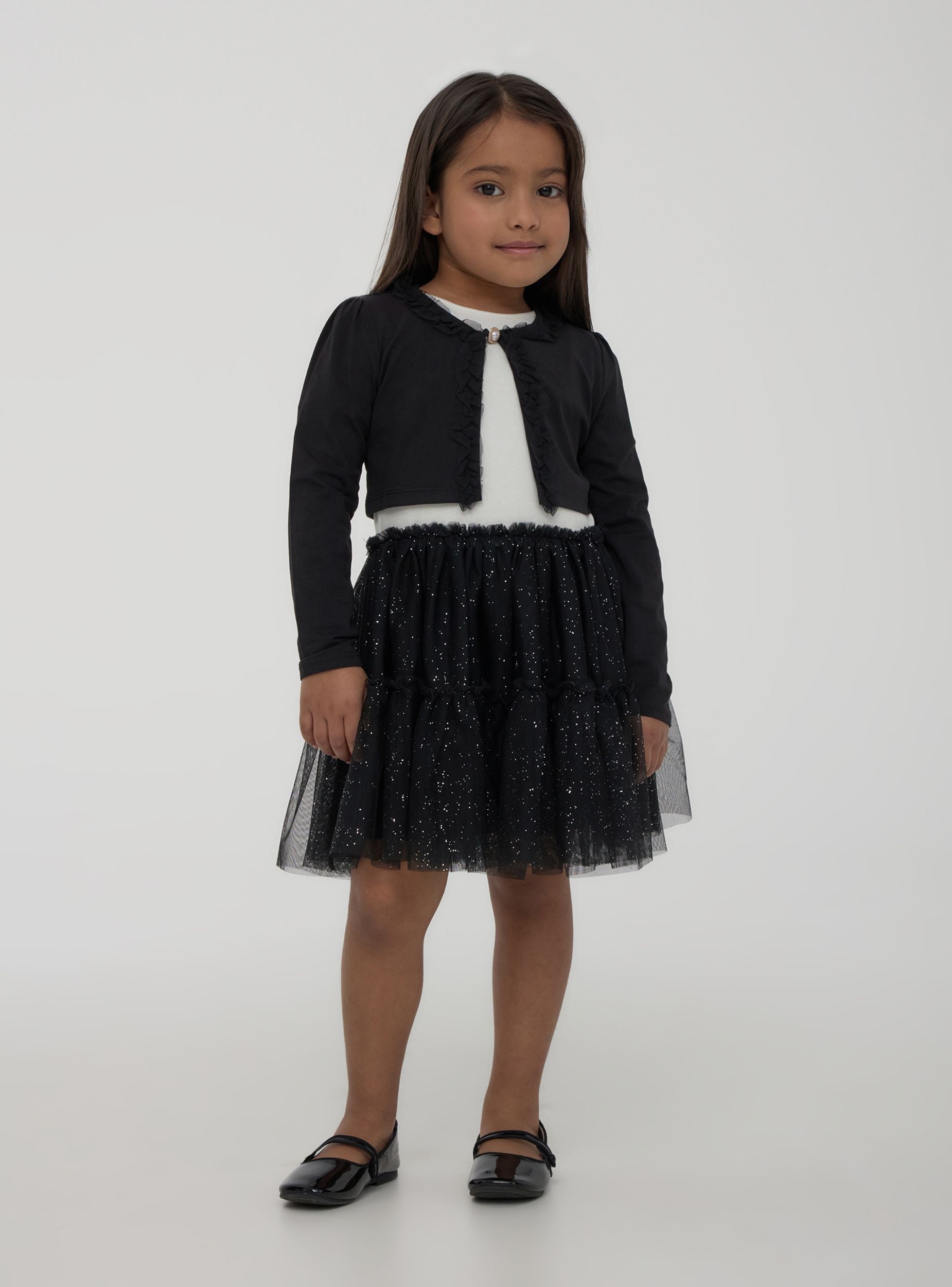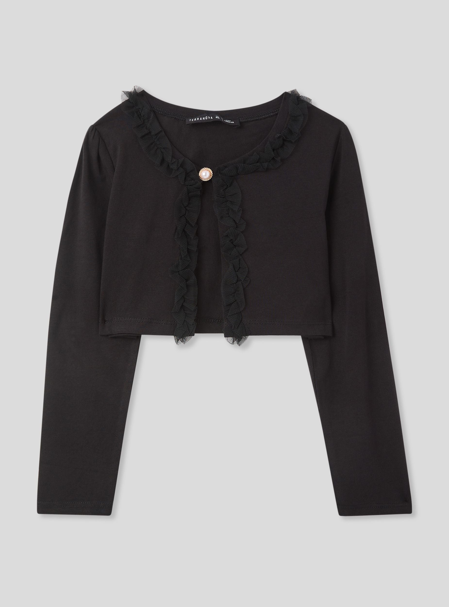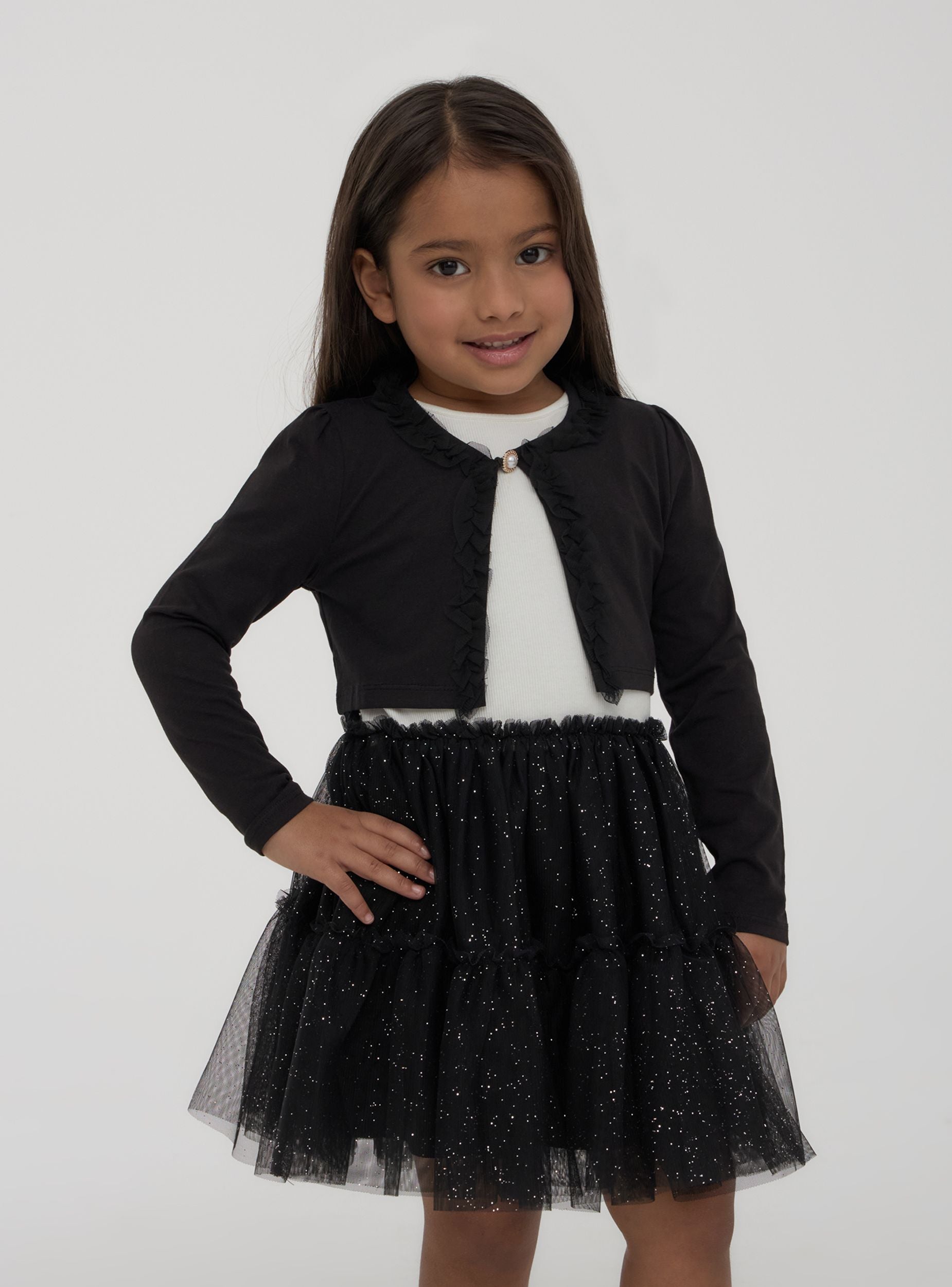 Elegantna i svestrana dječja jakna, idealna za upotpunjavanje odjevnih kombinacija s daškom profinjenosti. Dugi rukavi i kratki kroj čine je savršenom za nošenje preko haljina ili majica, osiguravajući udobnost i stil. Dekoracija sprijeda daje delikatan i ženstven efekt, dok dobro definirani kroj jednostavno naglašava siluetu.Detalji