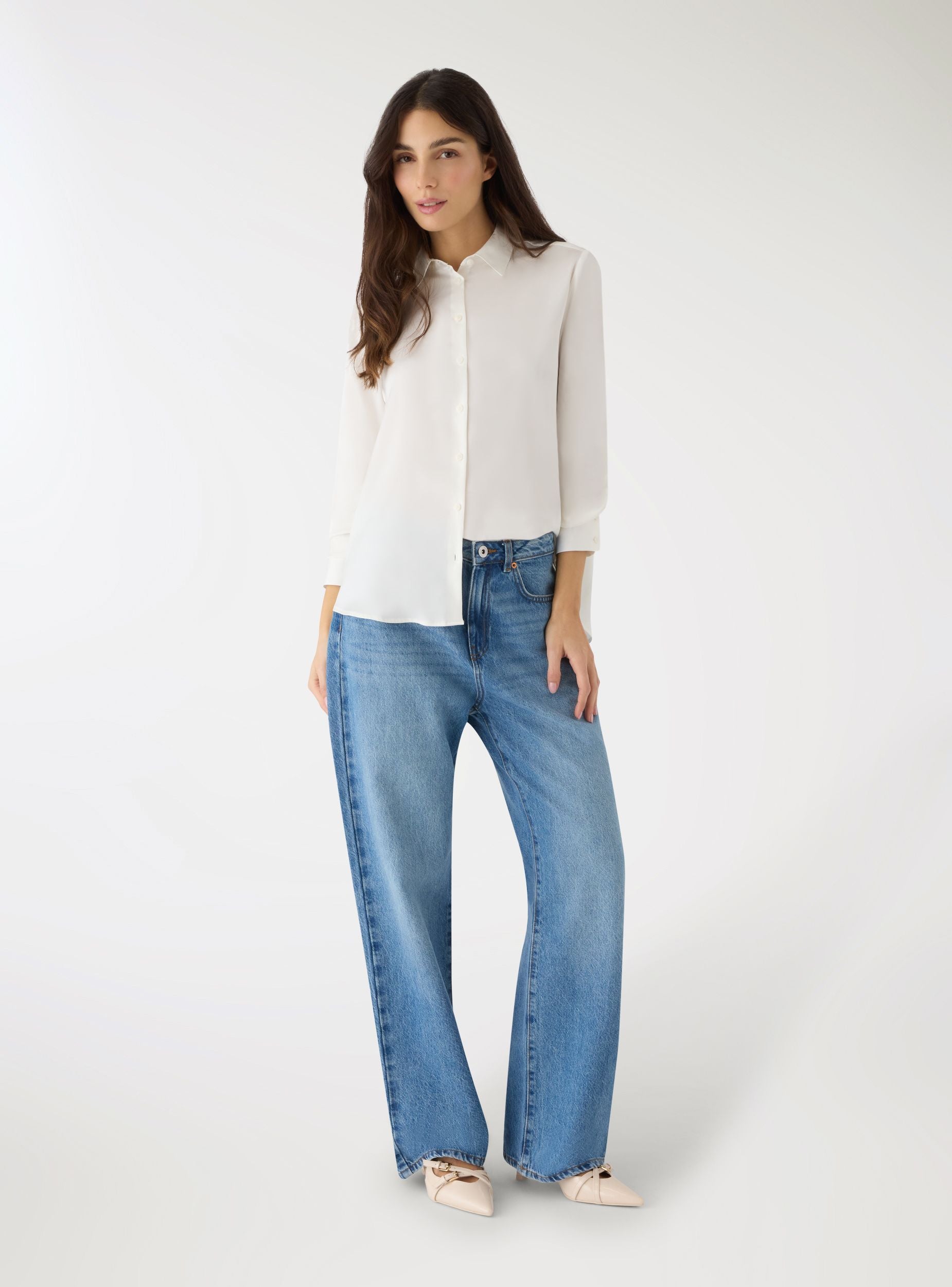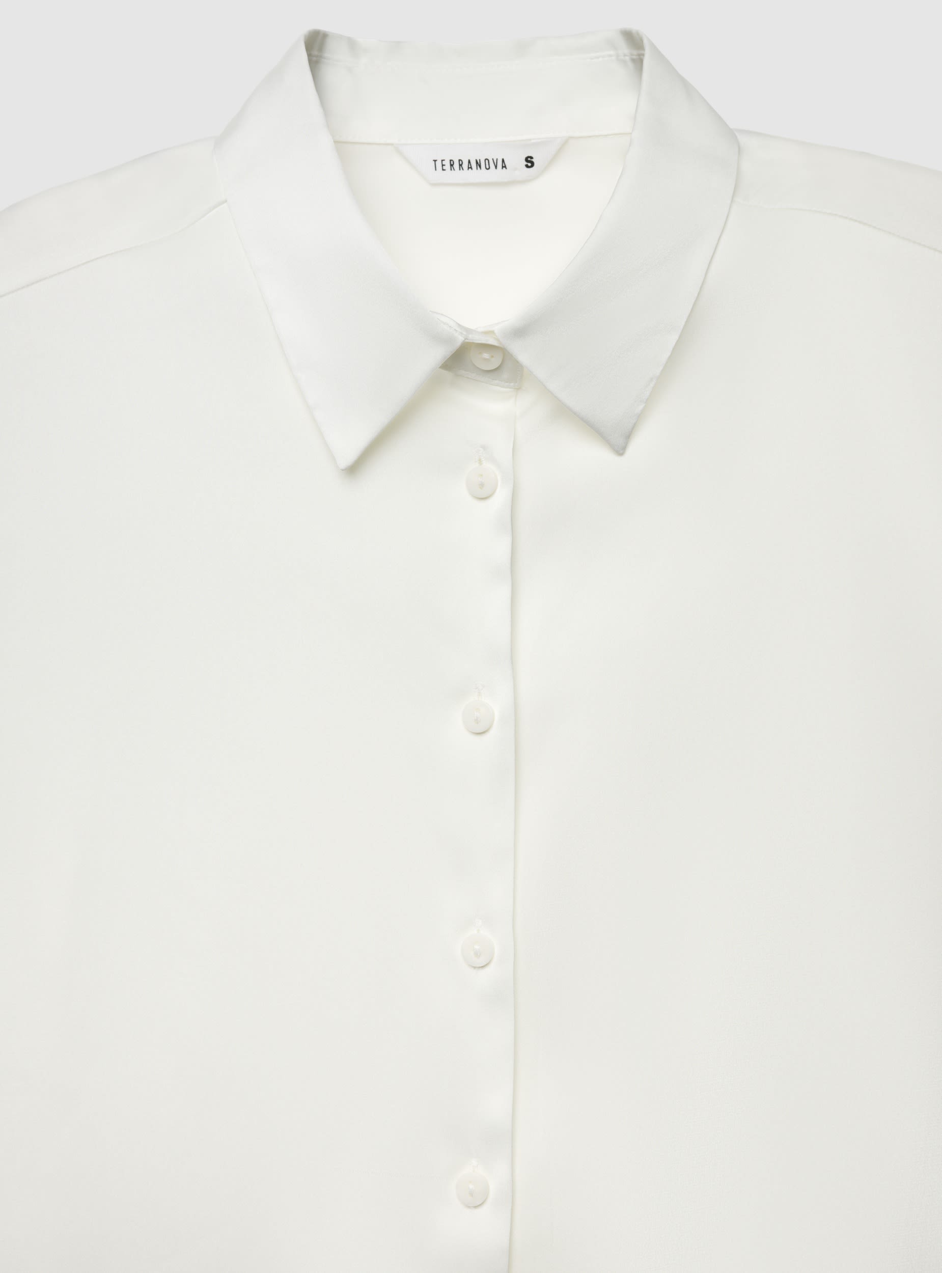 Ženska košulja od umjetnog satena u jednobojnoj varijanti. Klasični ovratnik i prednja kopča s prekrivenim gumbima, dugi rukavi i zaobljeni rub. Oversize kroj. Savršena za ured u kombinaciji s palazzo hlačama i mokasinkama, također je prikladna za ležeran izgled s trapericama i tenisicama. Čist dizajn i mekani kroj čine je svestranom od jutra do večeri.Detalji