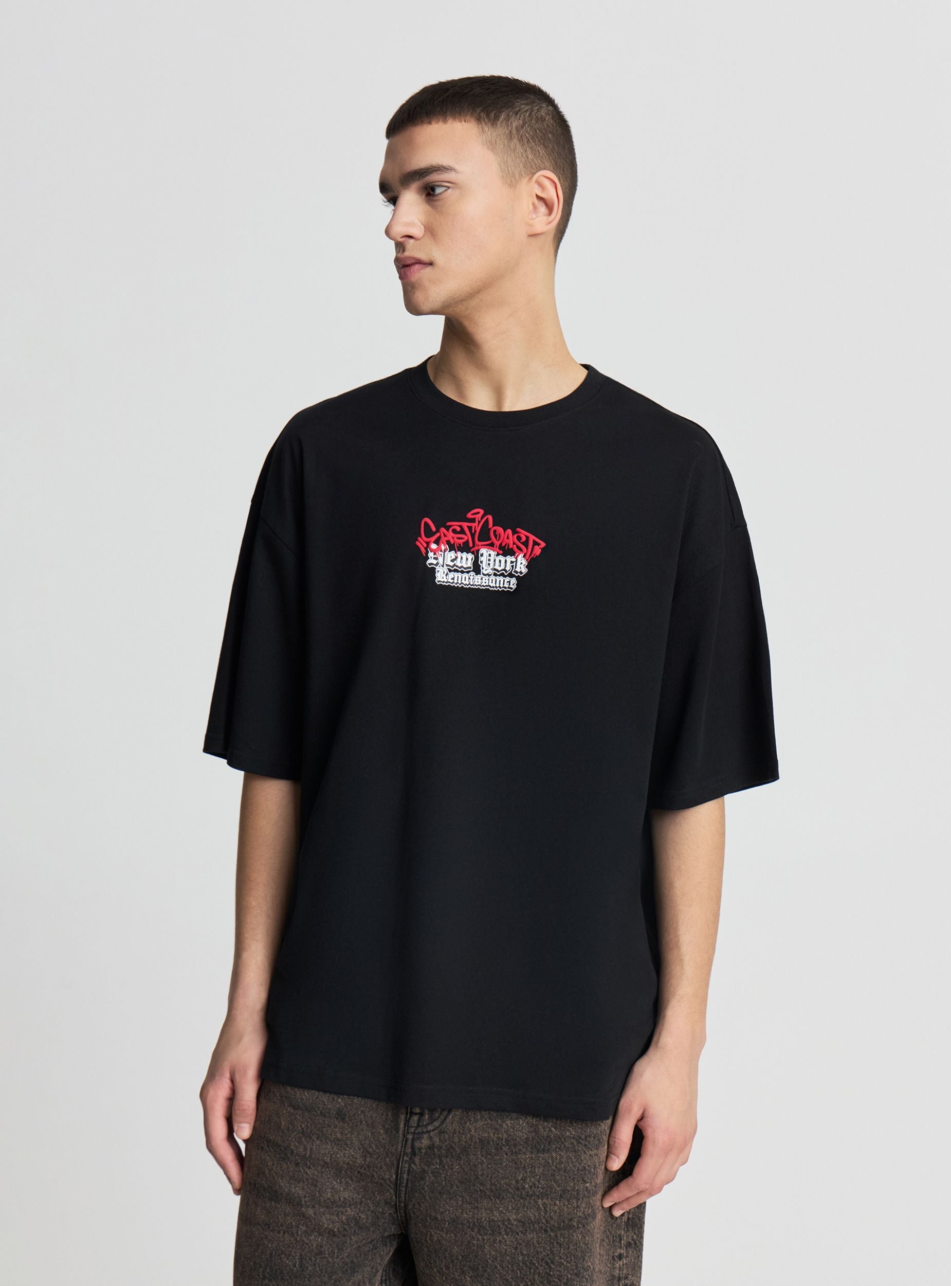 Muška oversize majica s printom sprijeda i straga. Okrugli izrez, kratki rukavi i širok kroj za udoban urbani izgled. Savršena uz široke traperice ili cargo kratke hlače i tenisice za slobodno vrijeme ili izlaske u grad. Printovi kombiniraju natpise i ilustracije za snažan efekt, idealan za one koji žele street style dodir u svojim svakodnevnim kombinacijama.Detalji
