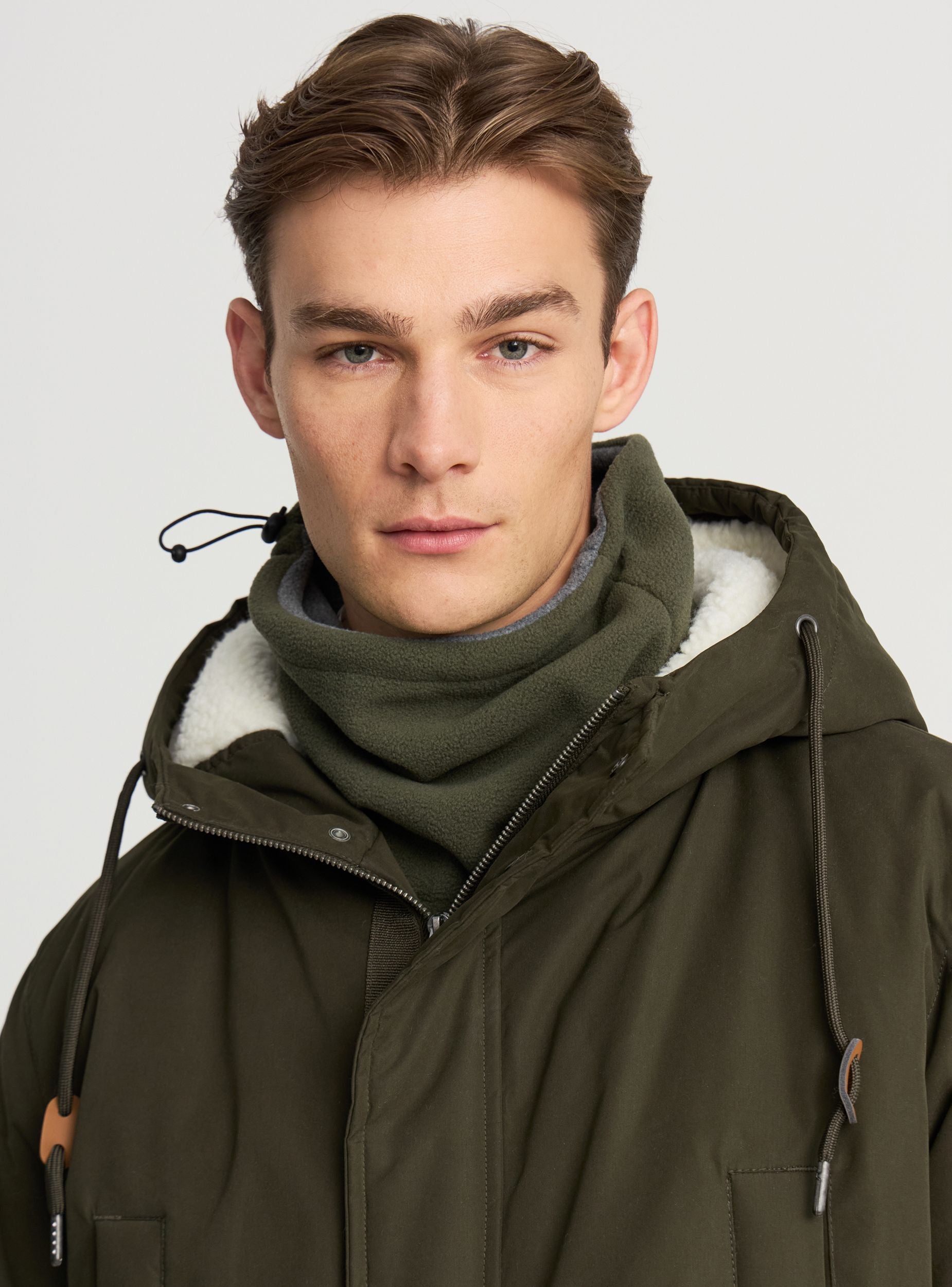 Muška jakna idealna za hladnu sezonu, karakterizirana parka dizajnom s kapuljačom. Opremljena je zatvaračem skrivenim ispod preklopa s gumbima i funkcionalnim džepovima, pružajući udobno i praktično pristajanje. Savršena za upotpunjavanje ležernih outfita i zaštitu od hladnoće sa stilom.Detalji