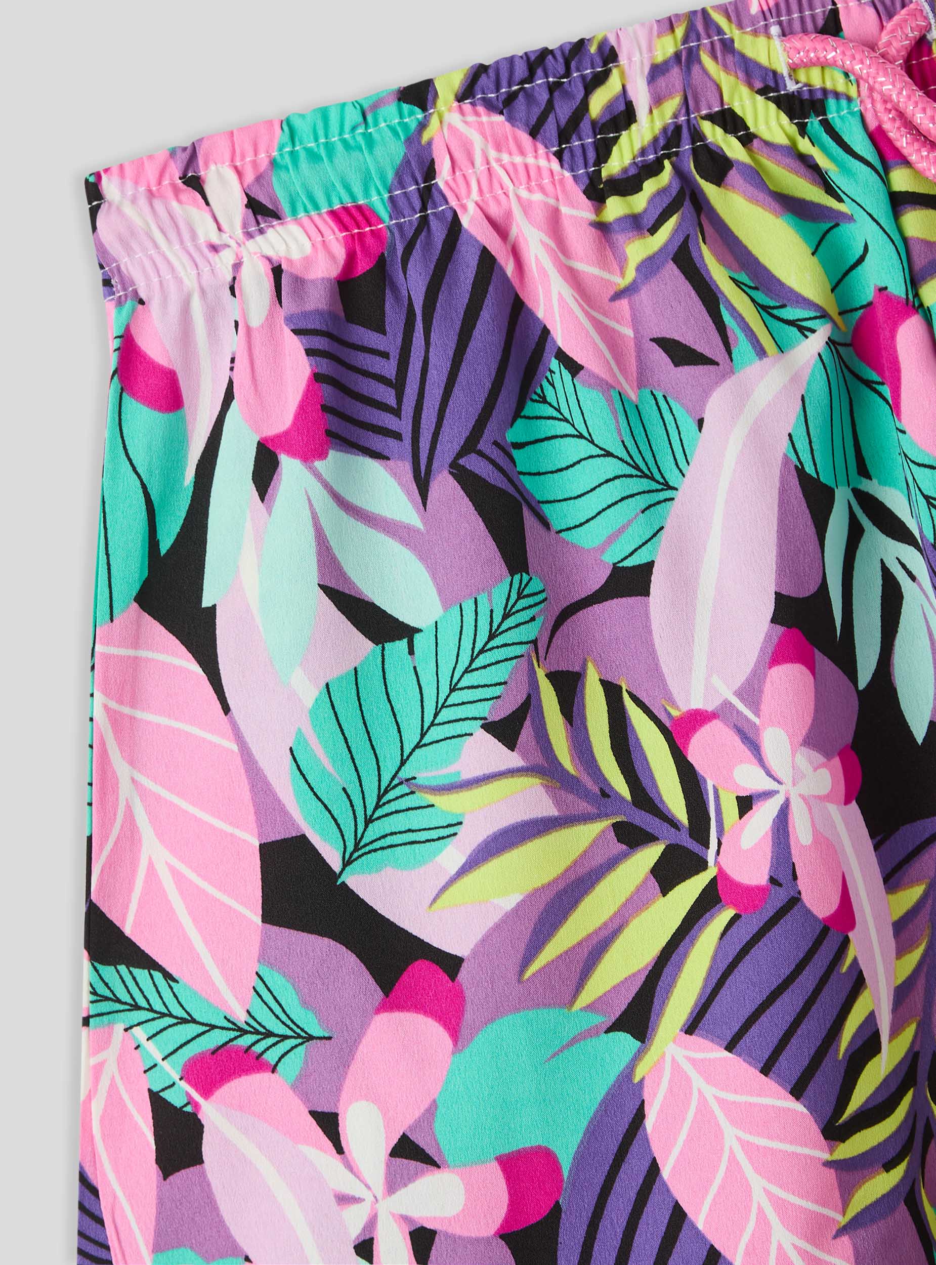 Kratki i živahni dječji šortsevi, savršeni za ljetne dane zahvaljujući svom šarenom uzorku koji donosi veselje i svježinu. Podesiva vezica u struku osigurava udobno i praktično pristajanje, dok rese na rubu dodaju razigrani i trendi detalj. Idealan za slobodno vrijeme, lako se kombiniraju s majicom bez rukava i sandalama za ležeran izgled, ili s majicom i tenisicama za dinamičan i udoban outfit.Detalji