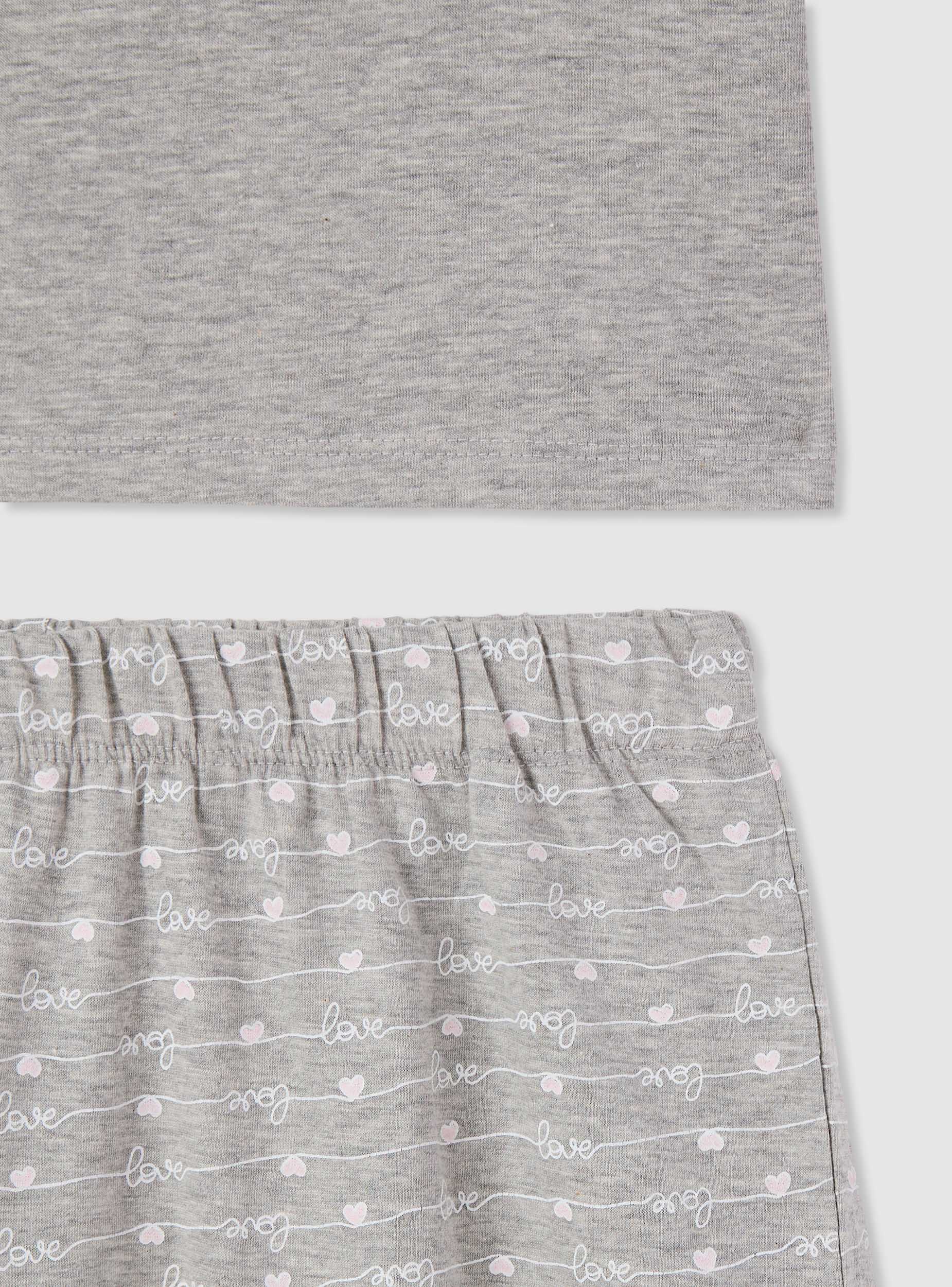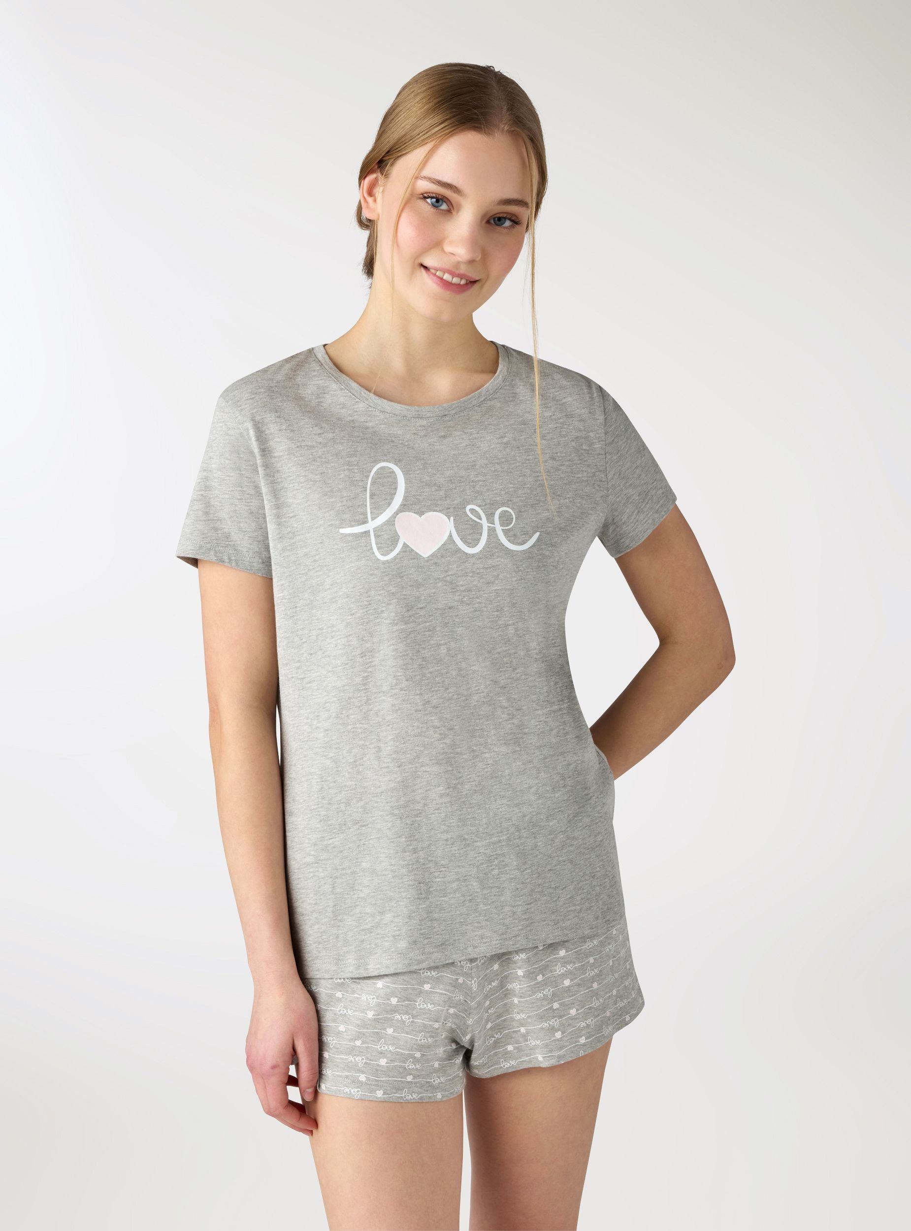 Pidžama za žene sastoji se od majice kratkih rukava s okruglim izrezom i natpisom sprijeda, uparene s kratkim hlačama s elastičnim pojasom u struku. Set je zamišljen za opuštanje kod kuće i za noć, s udobnim krojem i usklađenim uzorkom po cijelom komadu. Lako se nosi i kombinira s kardiganom i papučama za trenutke odmora.Detalji