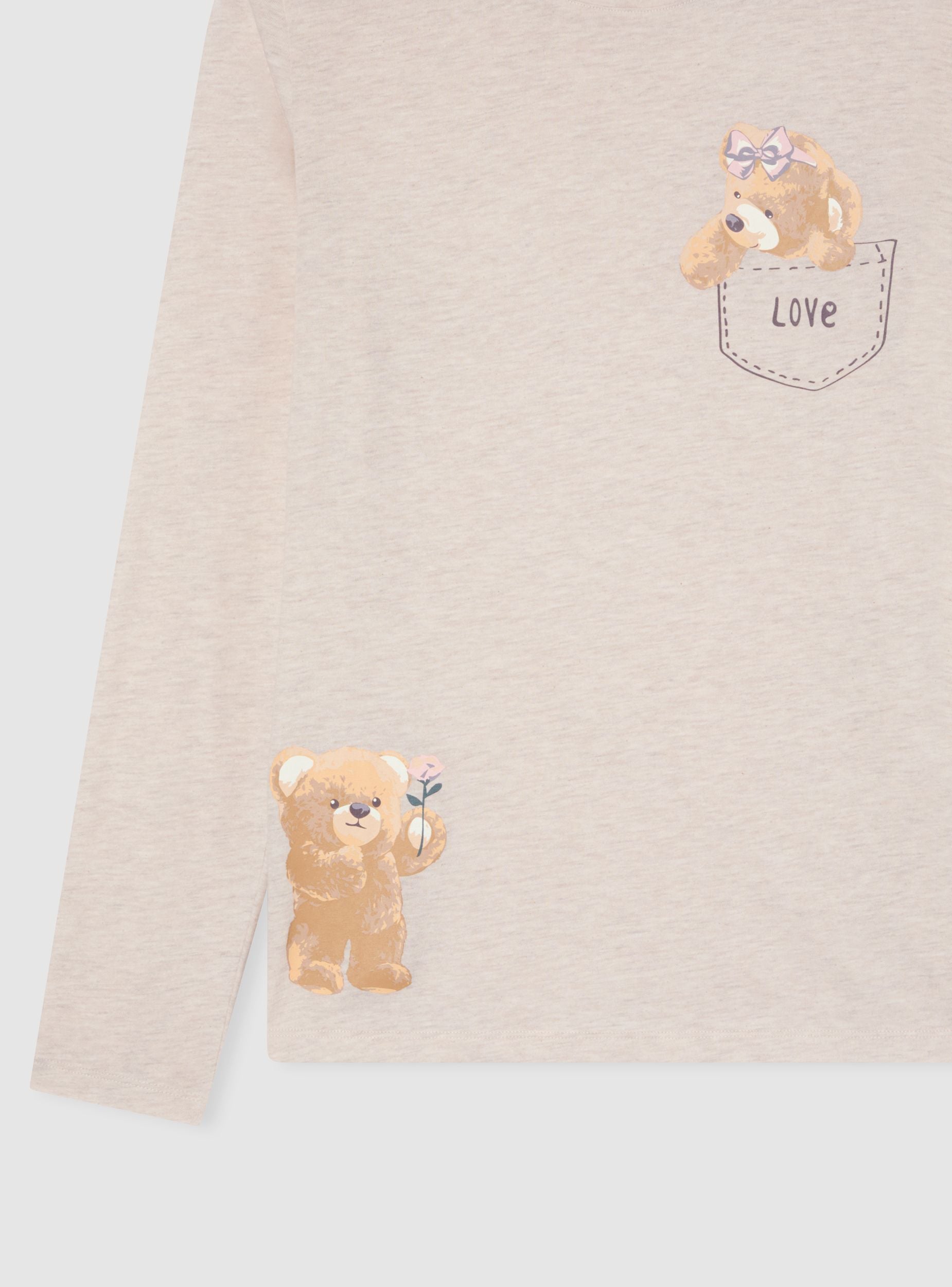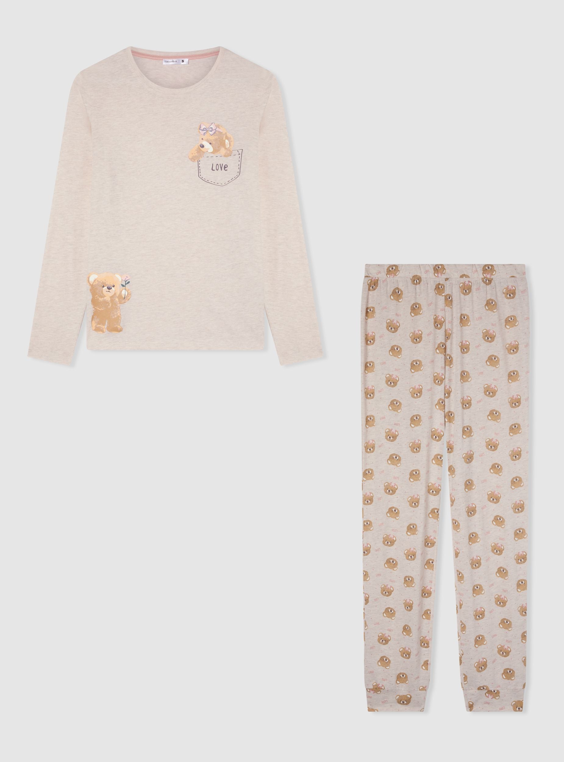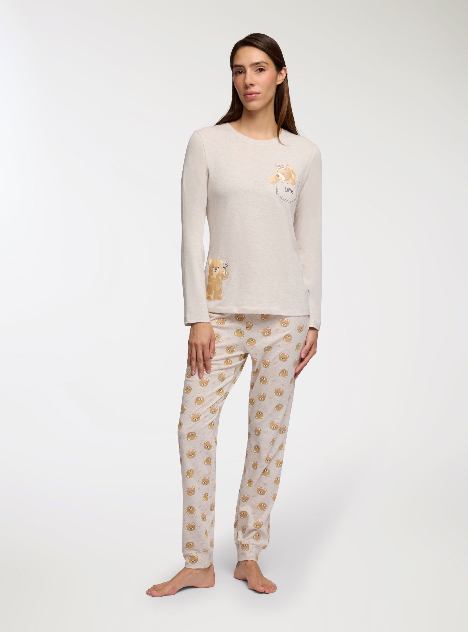 Ženski komplet pidžame koji se sastoji od majice s dugim rukavima i dugih hlača. Majica ima print medvjedića s ukrasnim detaljima, dok hlače krasi uzorak s ponavljajućim medvjedićima. Idealno za trenutke opuštanja i udobnosti, ova pidžama nudi regularan kroj. Savršena za mirne večeri ili kao ideja za poklon.Detalji