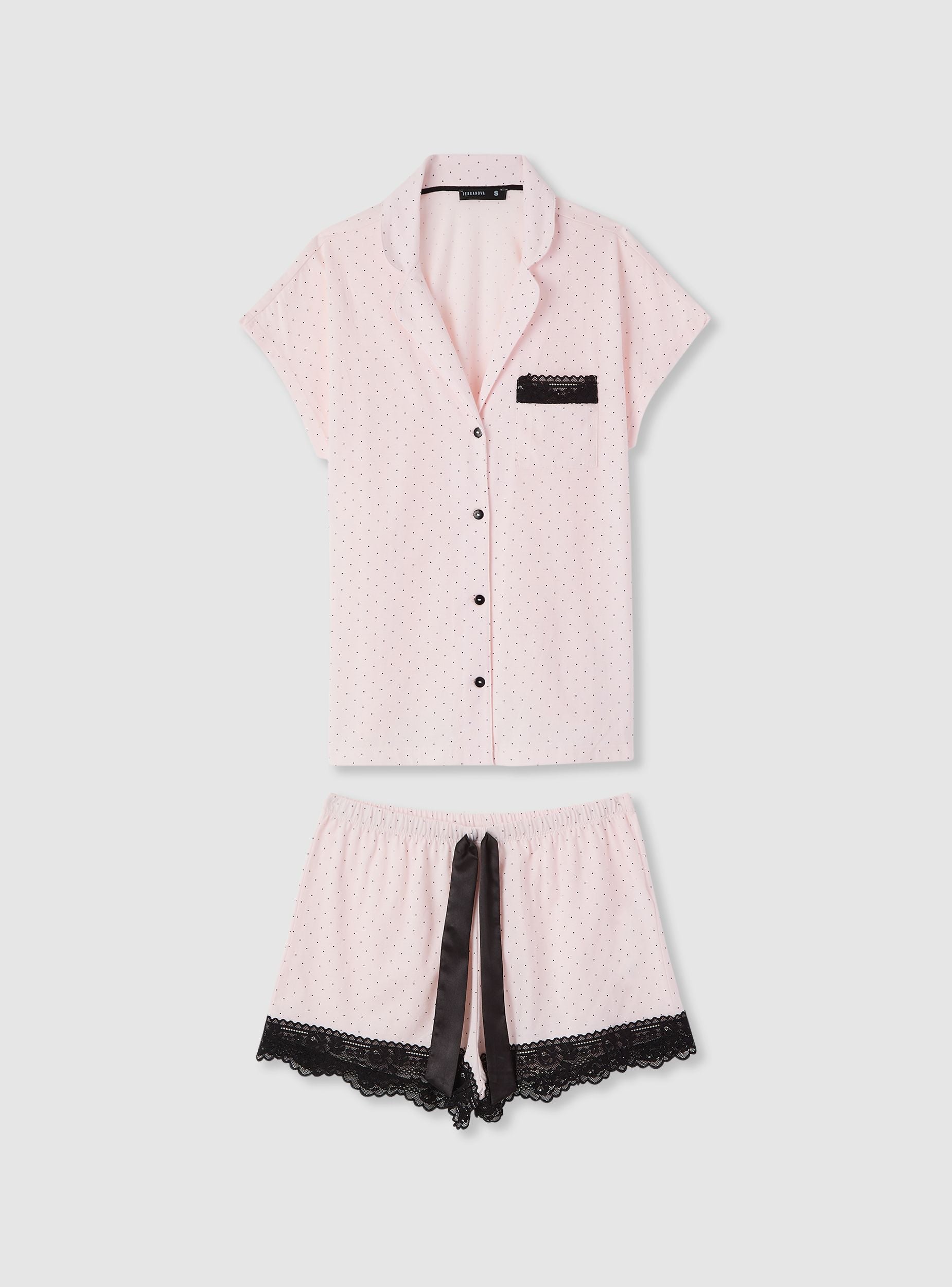 Pidžama za žene sastavljena od košulje s kratkim rukavima, rever ovratnikom i kopčanjem na gumbe te elastičnih kratkih hlača. Uzorak je s točkicama, s detaljima čipke na džepu i rubu kratkih hlača te ukrasnom vrpcom u struku. Udoban kroj idealan za toplo godišnje doba. Savršena za noć ili opuštanje kod kuće, može se kombinirati s laganim ogrtačem za usklađeni izgled.Detalji