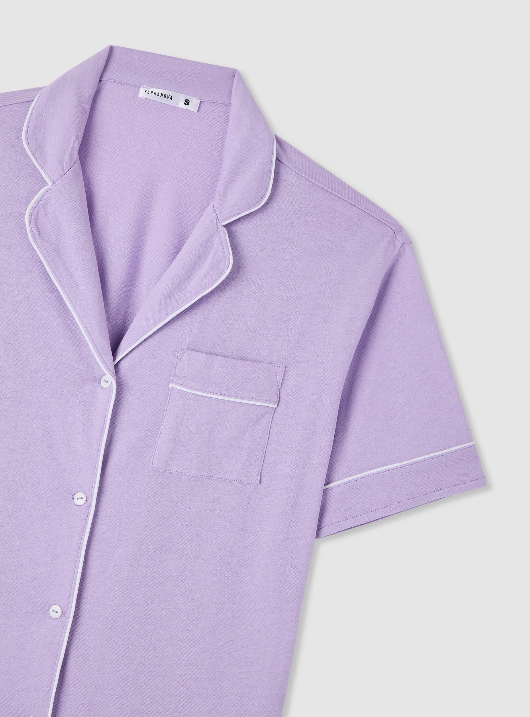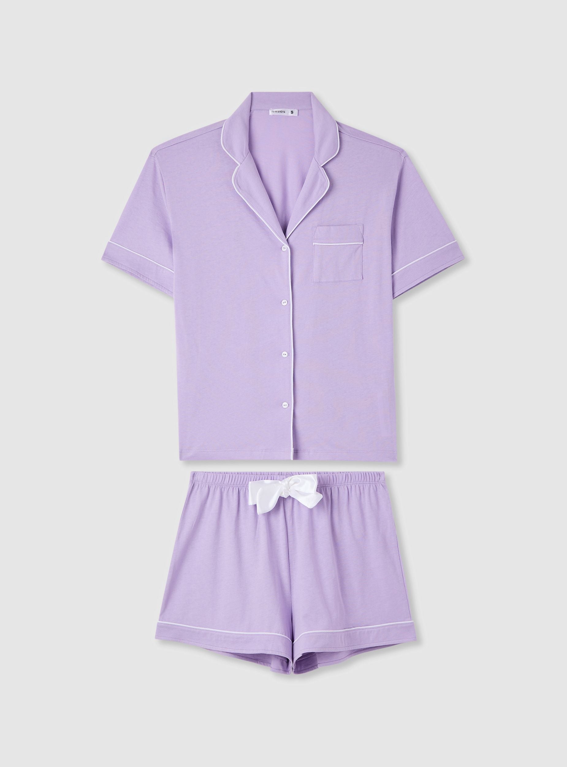 Ženski pidžama sastavljen od košulje s kratkim rukavima i kratkih hlača, savršen za noć ili trenutke opuštanja. Košulja ima ovratnik s reverom, zatvaranje na gumbe i džepić na prsima s kontrastnim rubovima. Kratke hlače imaju elastični pojas i ukrasnu mašnu, kao i rub s finišom. Regularan kroj i jednobojni dizajn lako se kombiniraju s laganim ogrtačem ili mekanim papučama.Detalji