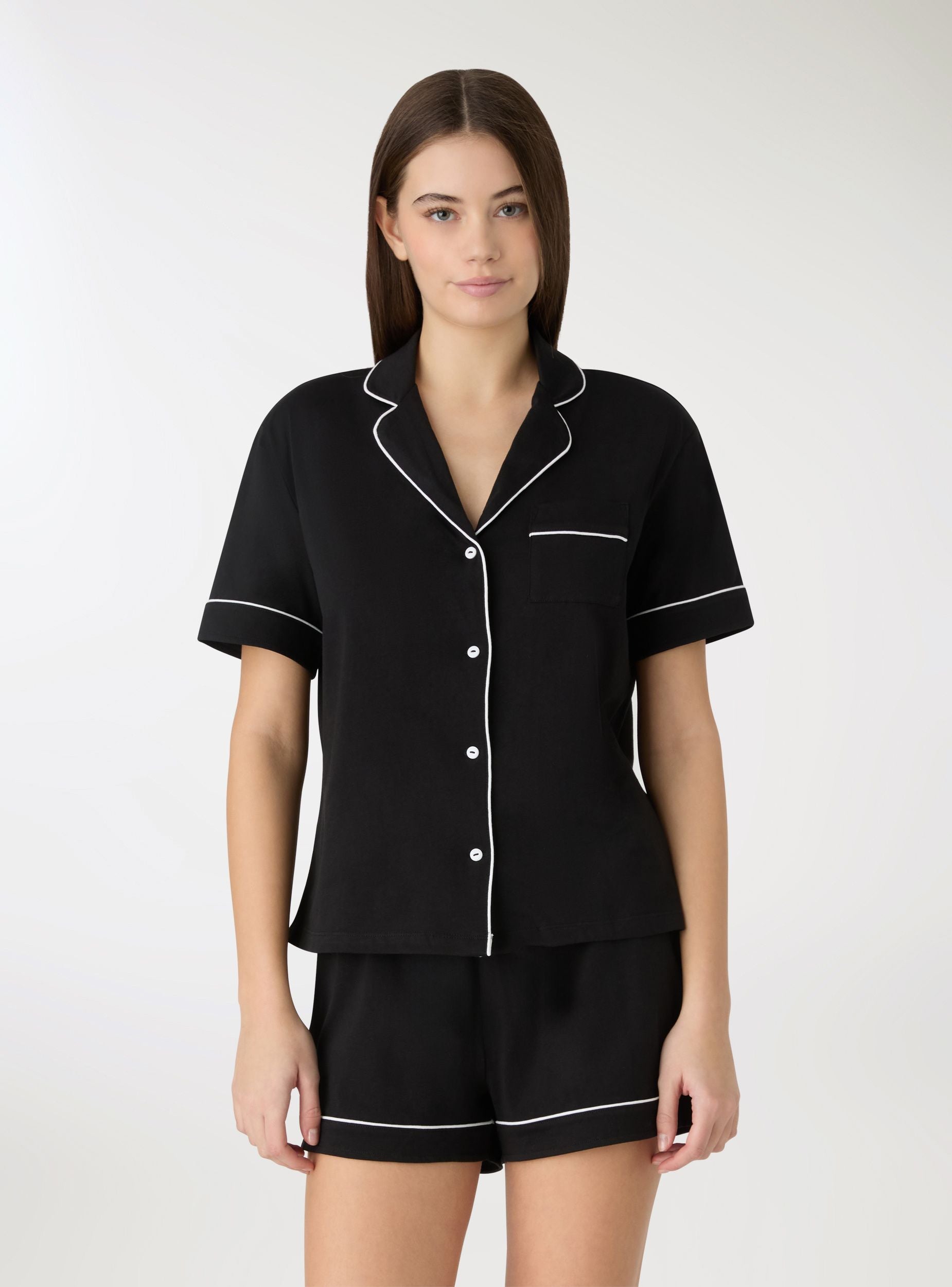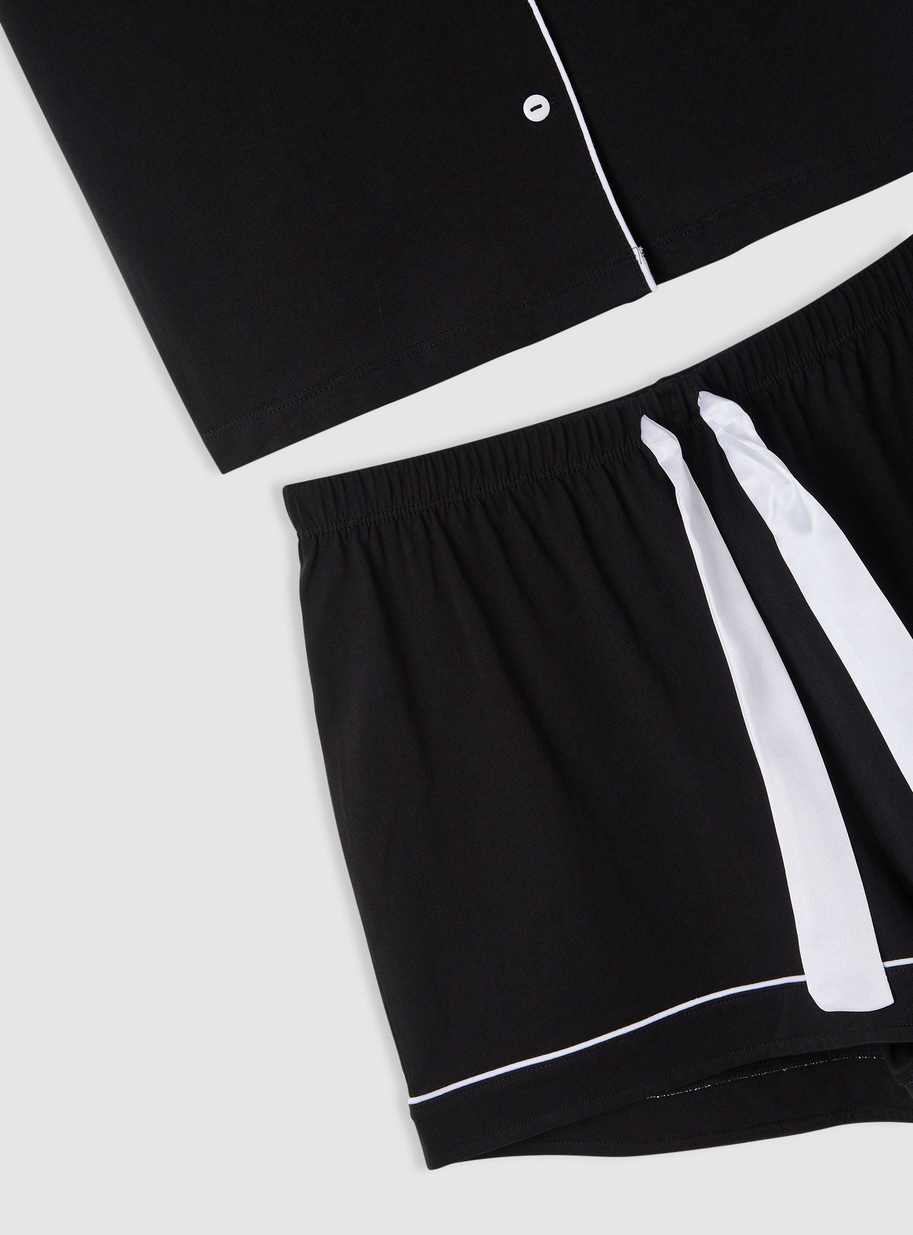 Ženski pidžama sastavljen od košulje s kratkim rukavima i kratkih hlača, savršen za noć ili trenutke opuštanja. Košulja ima rever ovratnik, zatvaranje na gumbe i džepić na prsima s kontrastnim rubovima. Kratke hlače imaju elastični pojas i ukrasnu mašnu, kao i rub s obrubom. Regularan kroj i jednobojni dizajn lako se kombiniraju s laganim ogrtačem ili mekanim papučama.Detalji