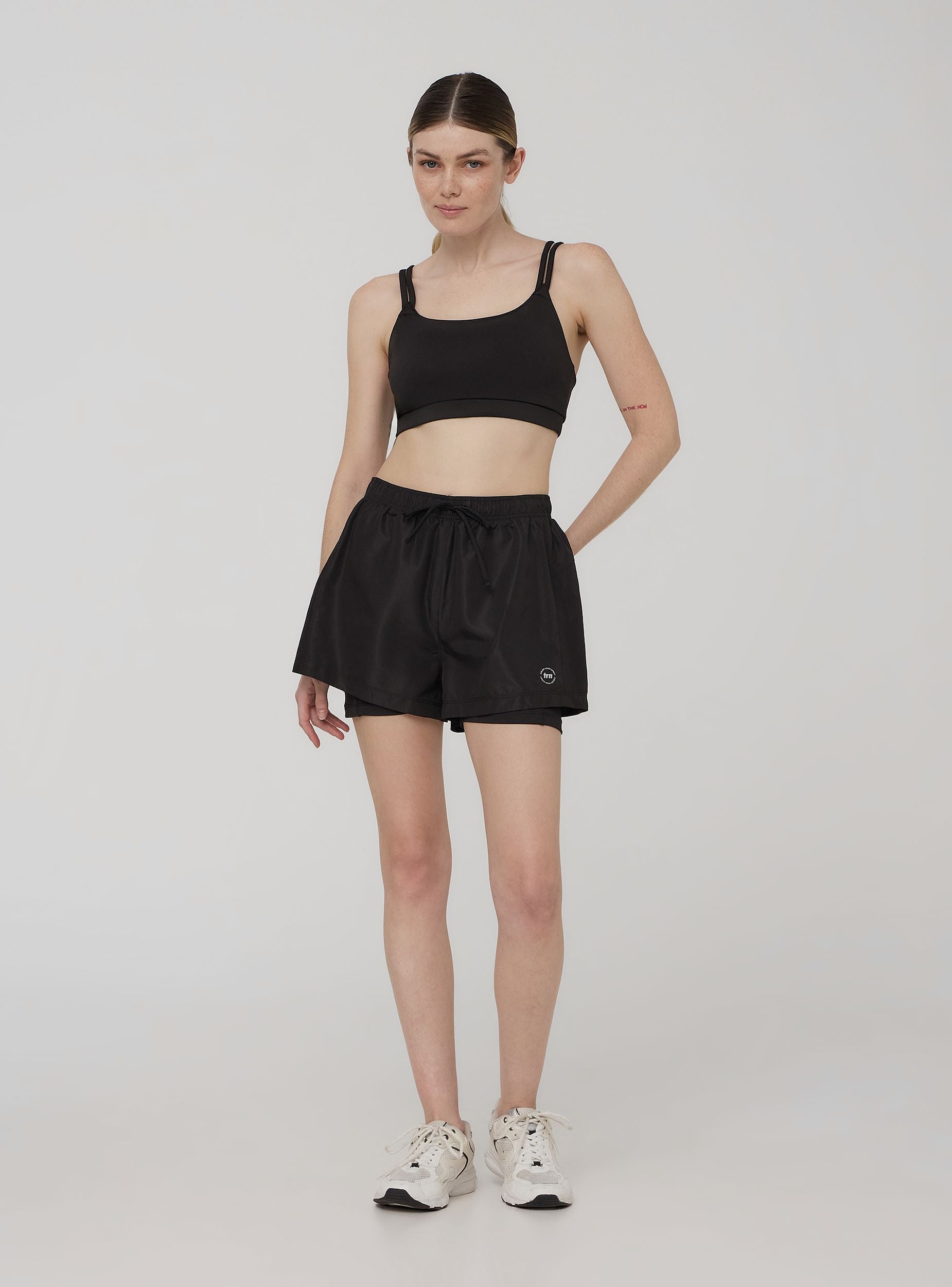 Ženski kratki šorts u jednobojnoj boji, s dizajnom koji uključuje praktičnu podesivu vezicu u struku za veću udobnost. Model ima funkcionalne džepove sa strane, pružajući udobnost i praktičnost, dok unutarnja struktura uključuje tajice za obavijajući efekt i potporu tijekom kretanja. Ovi šorts su idealni za sportske aktivnosti ili trenutke opuštanja, jamčeći udobnost i slobodu kretanja u svakoj prilici. Active linija.Detalji