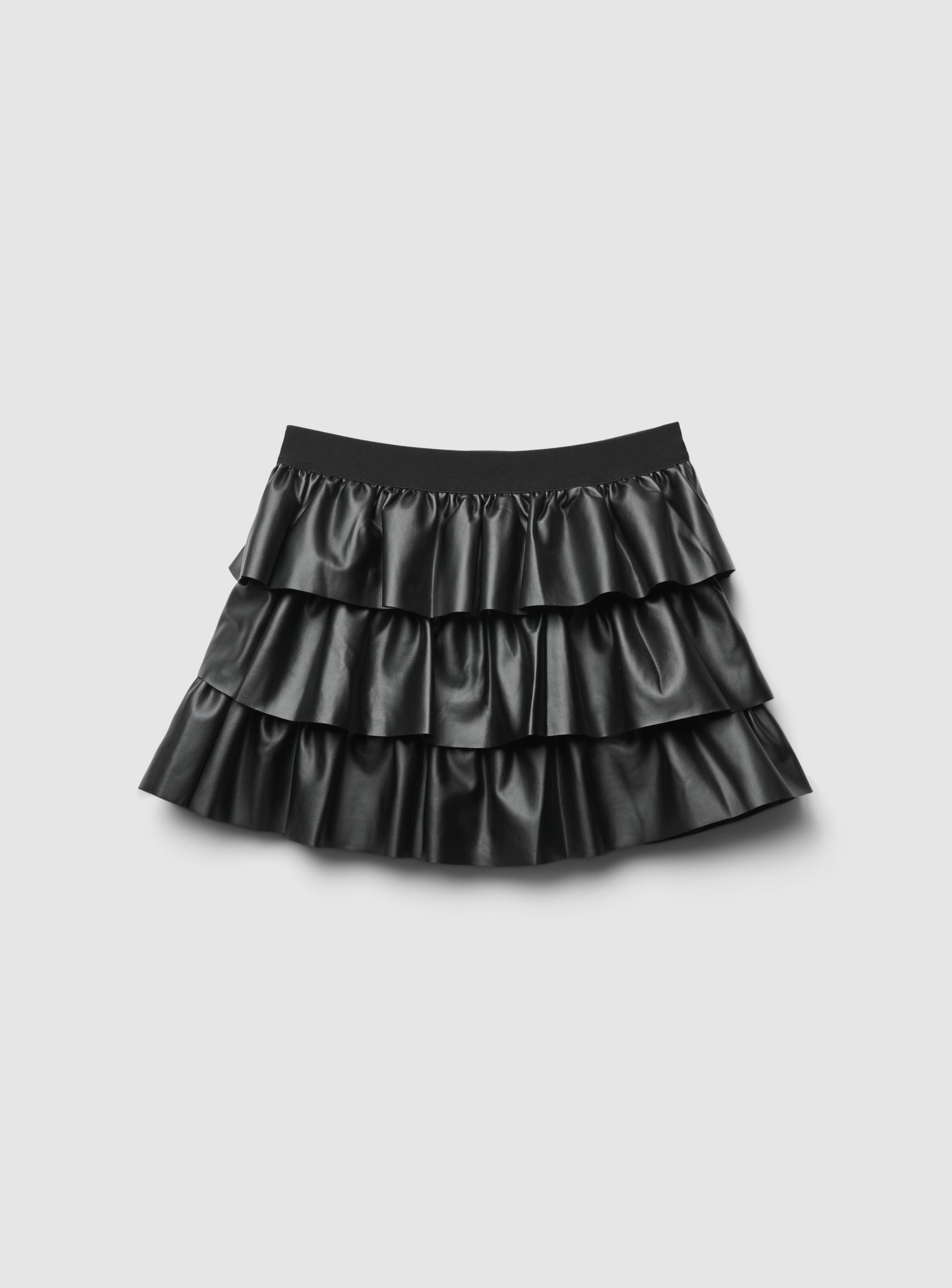 Suknja za djevojčice s volanima, savršena za trendi izglede i posebne prilike. Mini model s elastičnim strukom koji osigurava udobnost i jednostavno nošenje. Tkanina je od jednobojne umjetne kože, a slojeviti dizajn stvara pokret i volumen. Idealna uz majicu i tenisice za dan ili uz bluzu i čizme za sofisticiraniji outfit.Detalji