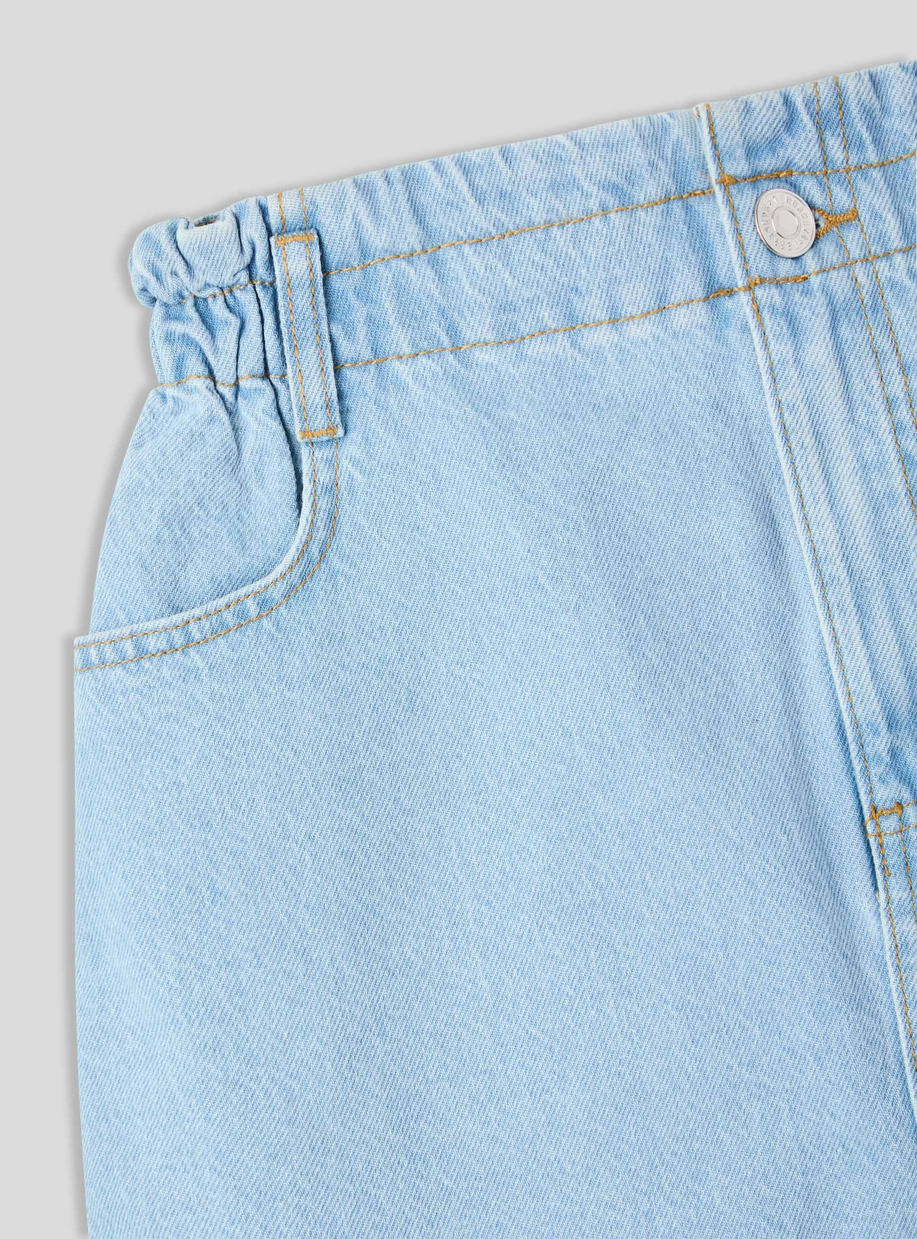 Ženska kratka suknja modernog i ležernog stila, karakterizirana efektom paperbag koji naglašava struk. Jednostavna boja s laganim denim pranjem dodaje ležerni i svestrani dodir, savršena za svaku sezonu. Opremljena funkcionalnim džepovima i zatvaranjem na dugme i patentni zatvarač, ima i petlje za pojas za prilagodljiv izgled. Savršena je uz majicu i tenisice za dan ili uz košulju i sandale za sretniji izgled.Detalji