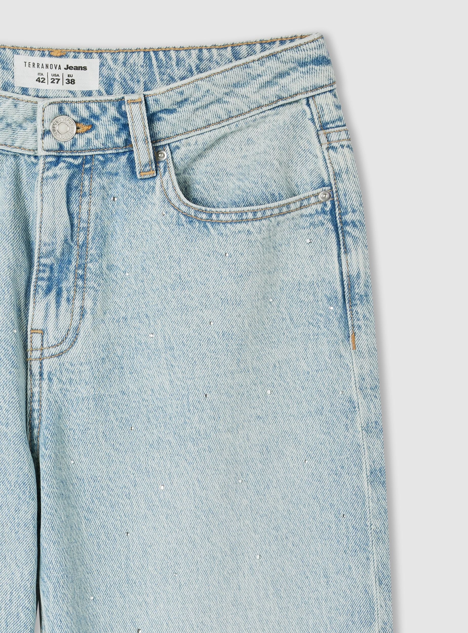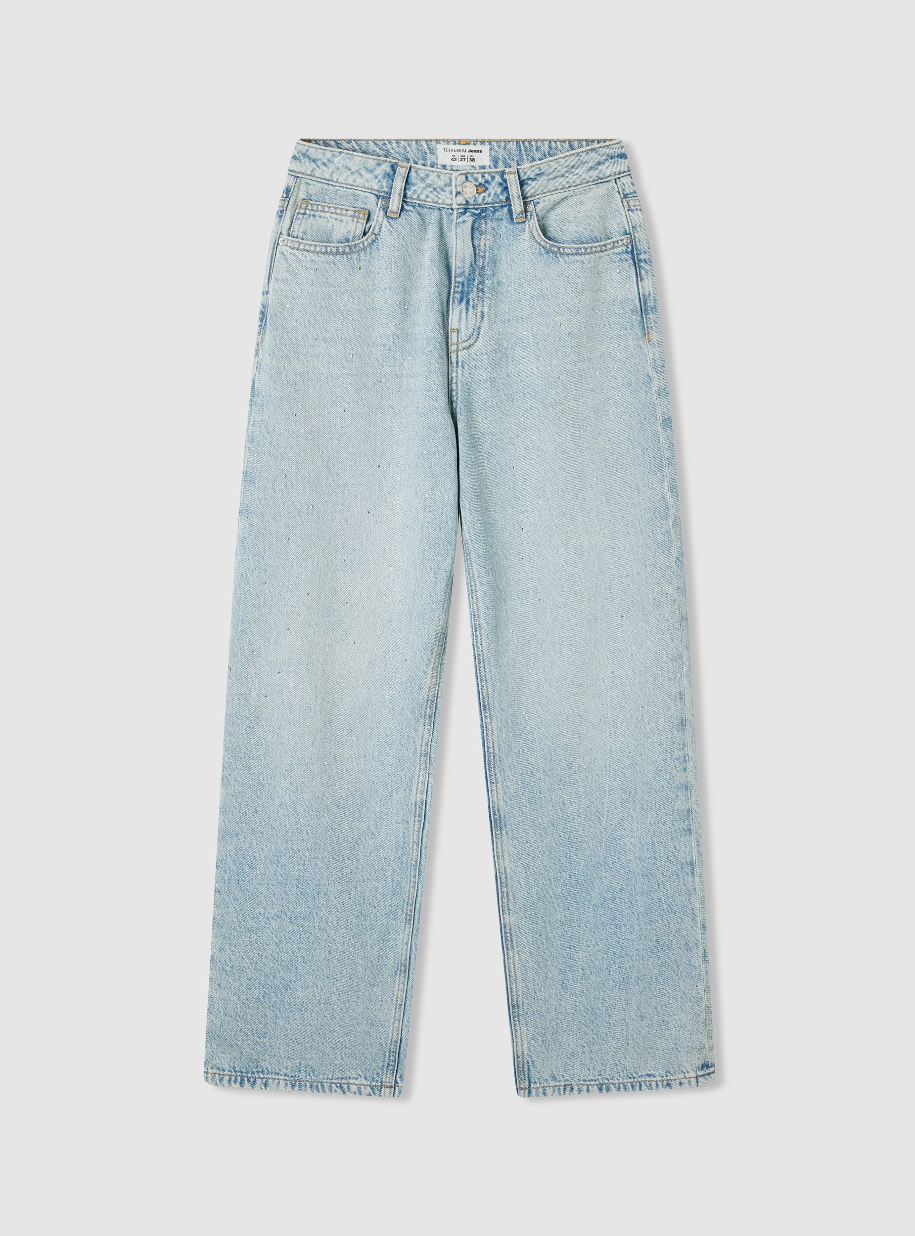 Ženske traperice širokog kroja i dizajna wide leg. Ove traperice svijetlog denima ističu se modernim i ležernim stilom, obogaćene detaljima sa šljokicama koje daju originalan dodir. Idealne za kombiniranje s majicama ili košuljama, prikladne su za razne prilike, od slobodnog vremena do neformalnih izlazaka. Imaju zatvaranje na gumb i patentni zatvarač, prednje i stražnje džepove te udobnu i svestranu siluetu.Detalji