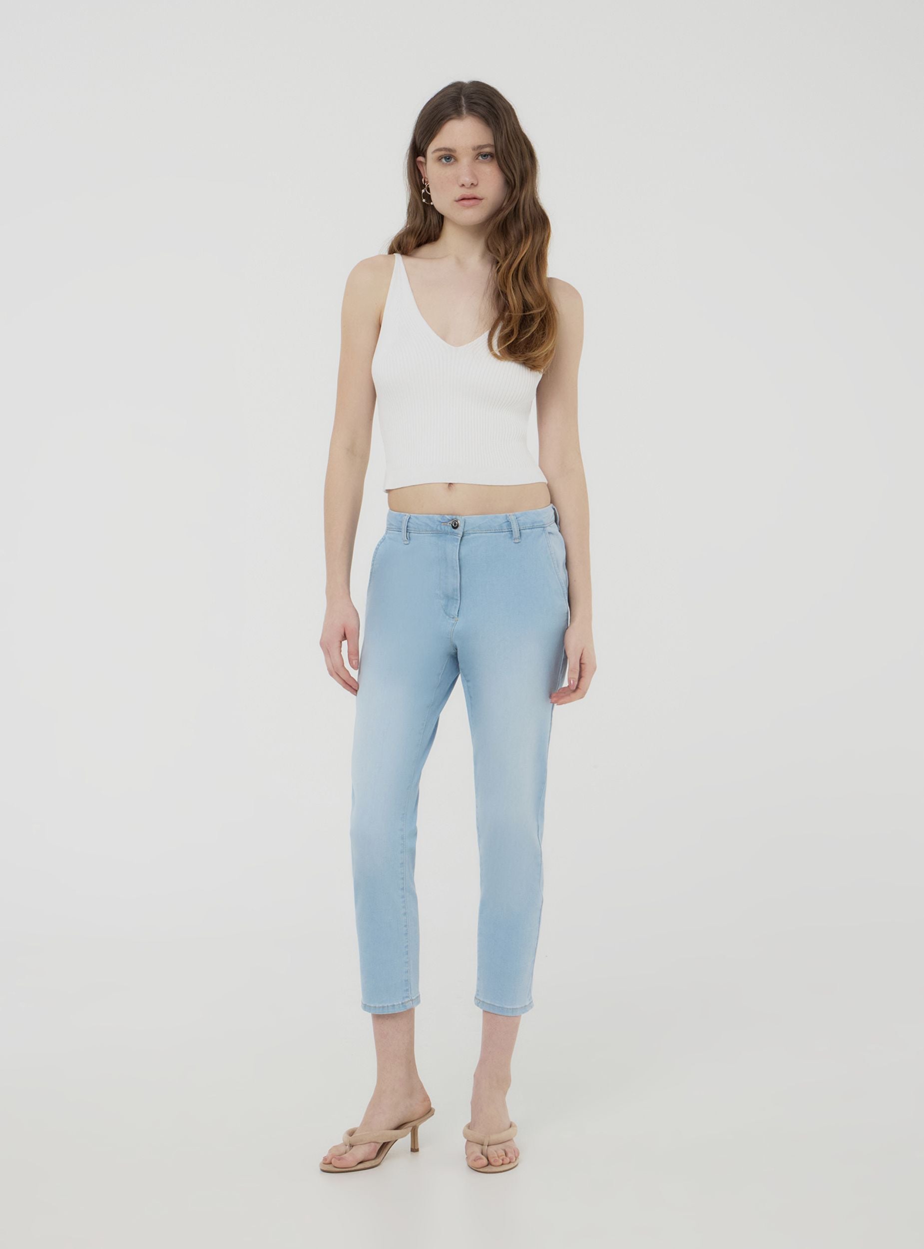 Ženske traperice idealne su za svestran izgled prikladan za svaku priliku, od slobodnog vremena do ležernih trenutaka. Jednostavan dizajn i skinny kroj daju uski efekt koji ističe siluetu. Model u chino stilu s praktičnim bočnim džepovima i lažnim stražnjim džepovima, za sofisticiran i minimalistički dodir. Zakopčavanje s gumbom i patentnim zatvaračem upotpunjuje odjevni predmet, dok uski i suženi kroj osigurava idealnu udobnost bez odricanja od stila.Detalji