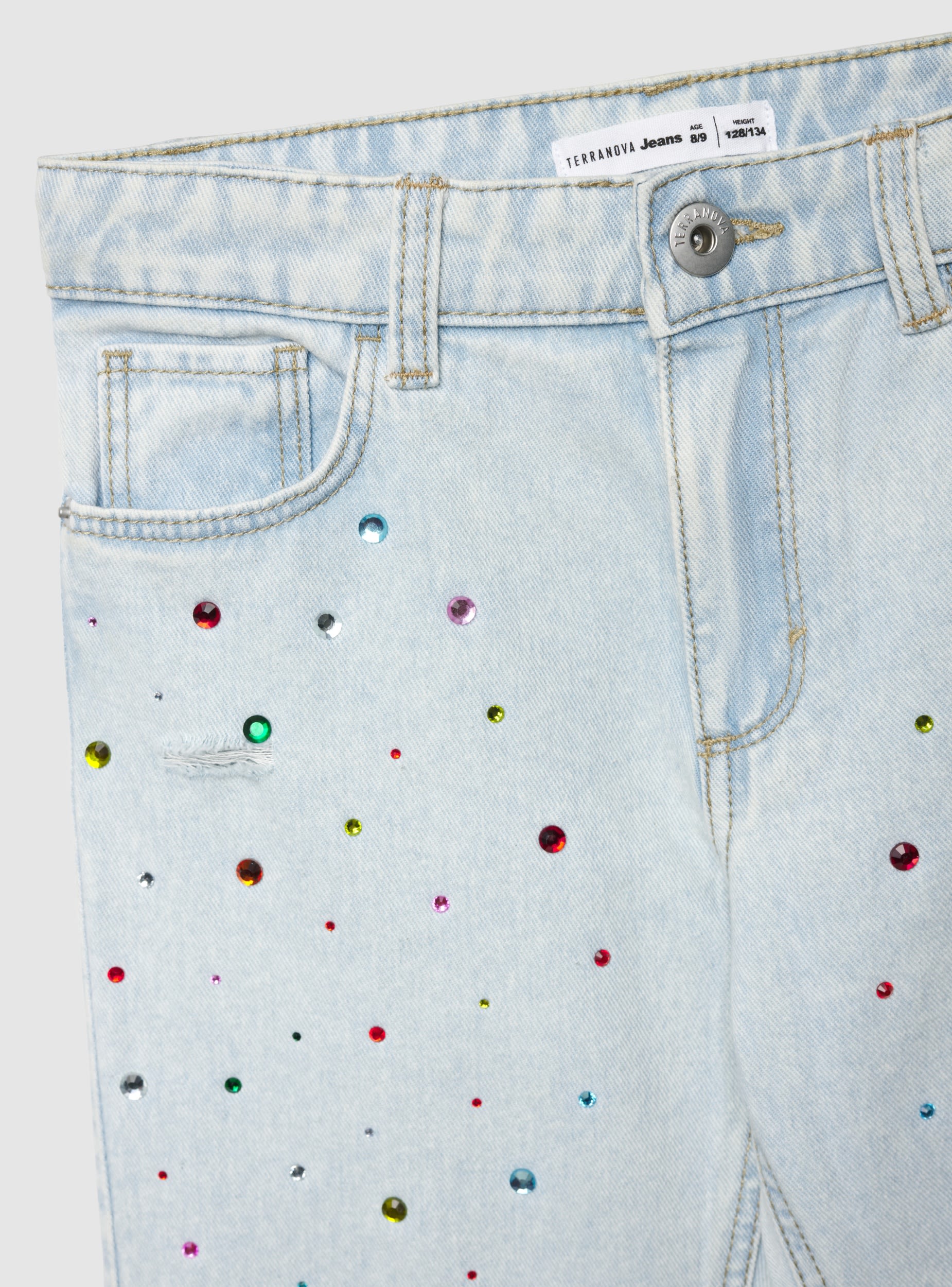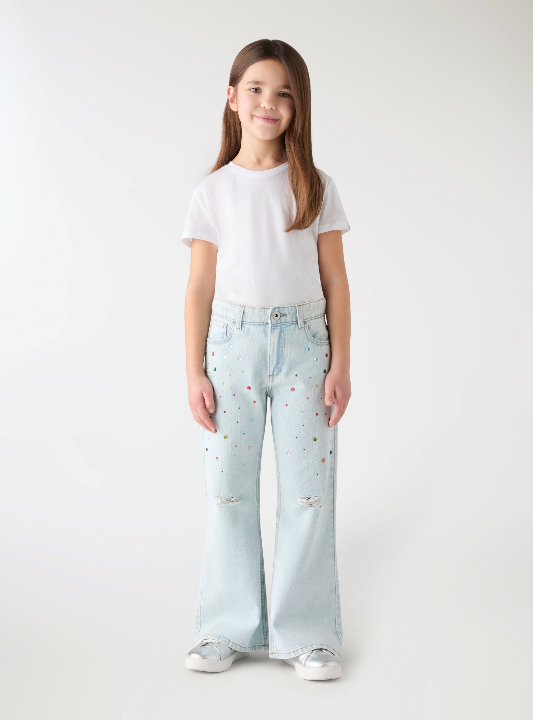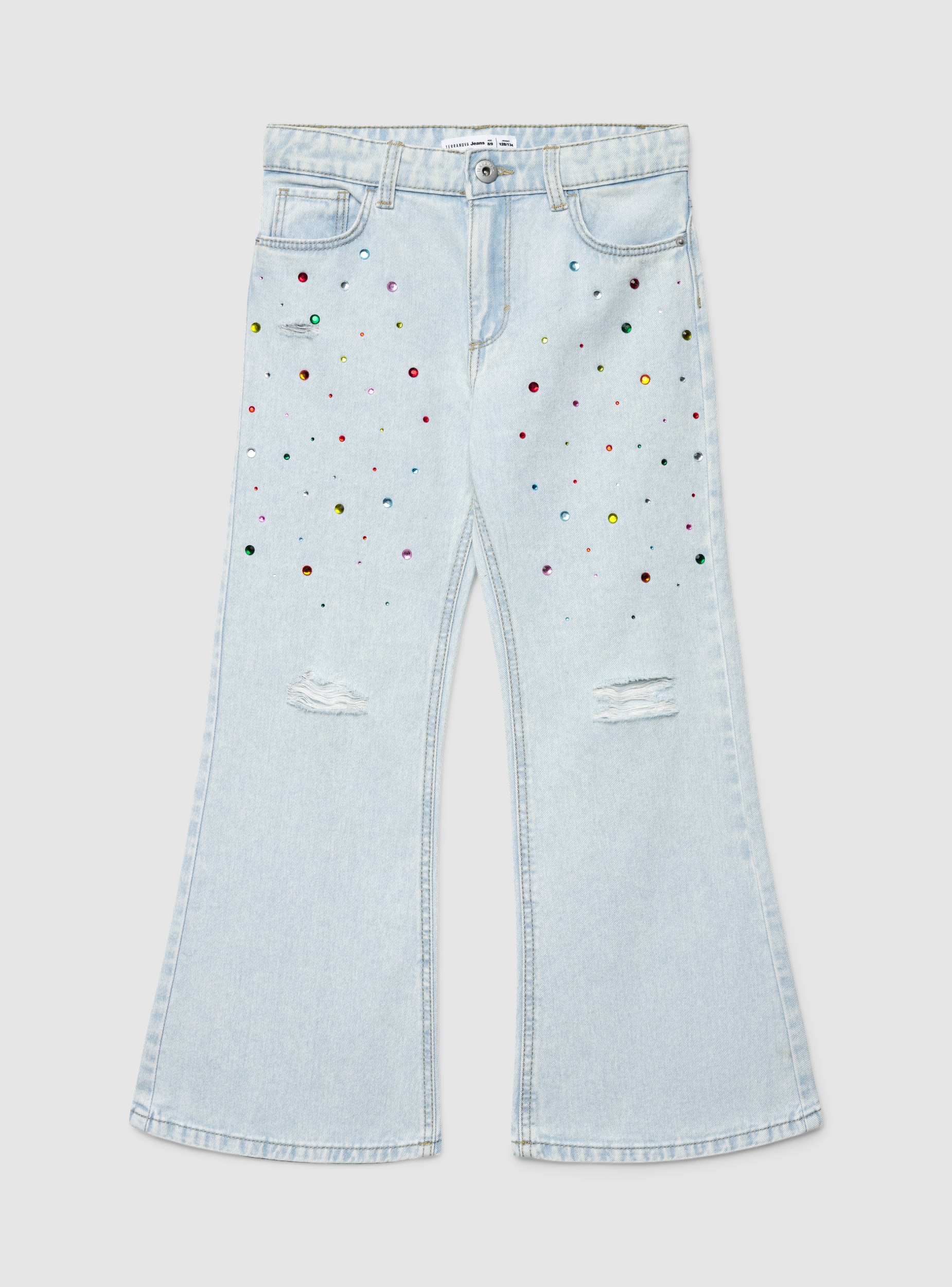 Traperice za djevojčice s nogavicama na zvono, savršene za trendi školski ili ležerni izgled. Model s redovitim strukom s petljama za remen, zatvaranjem na gumb i patentni zatvarač te pet džepova. Aplikacije od strass kamenčića po cijelom modelu i detalji s poderotinama na koljenima dodaju sjajni dodir koji se može kombinirati s majicama i tenisicama.Detalji