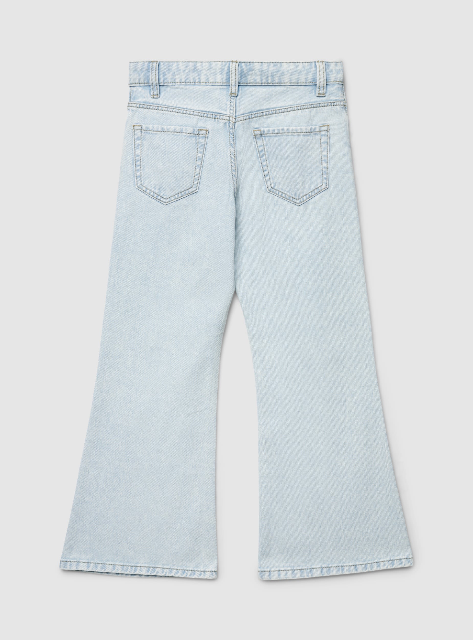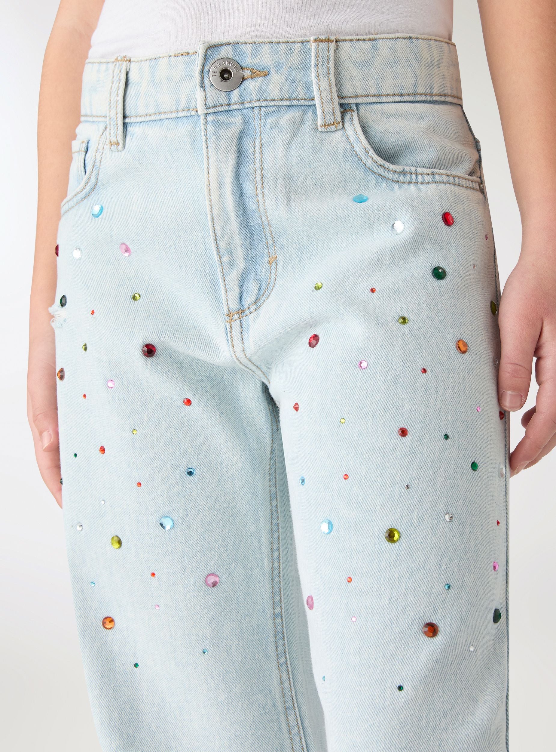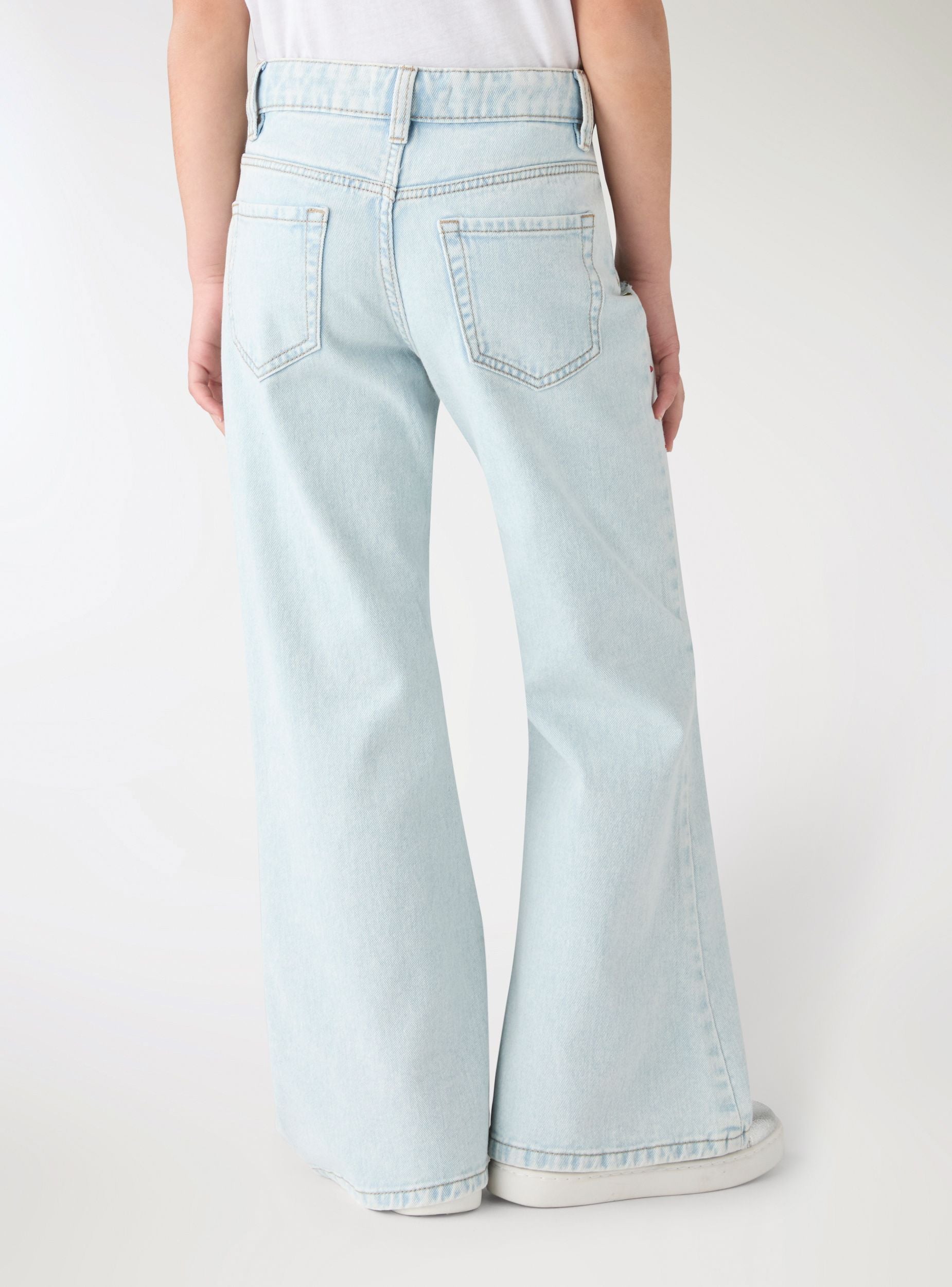 Traperice za djevojčice s nogavicama na zvono, savršene za trendi školski ili ležerni izgled. Model s redovitim strukom s petljama za remen, zatvaranjem na gumb i patentni zatvarač te pet džepova. Aplikacije od strass kamenčića po cijelom modelu i detalji s poderotinama na koljenima dodaju sjajni dodir koji se može kombinirati s majicama i tenisicama.Detalji
