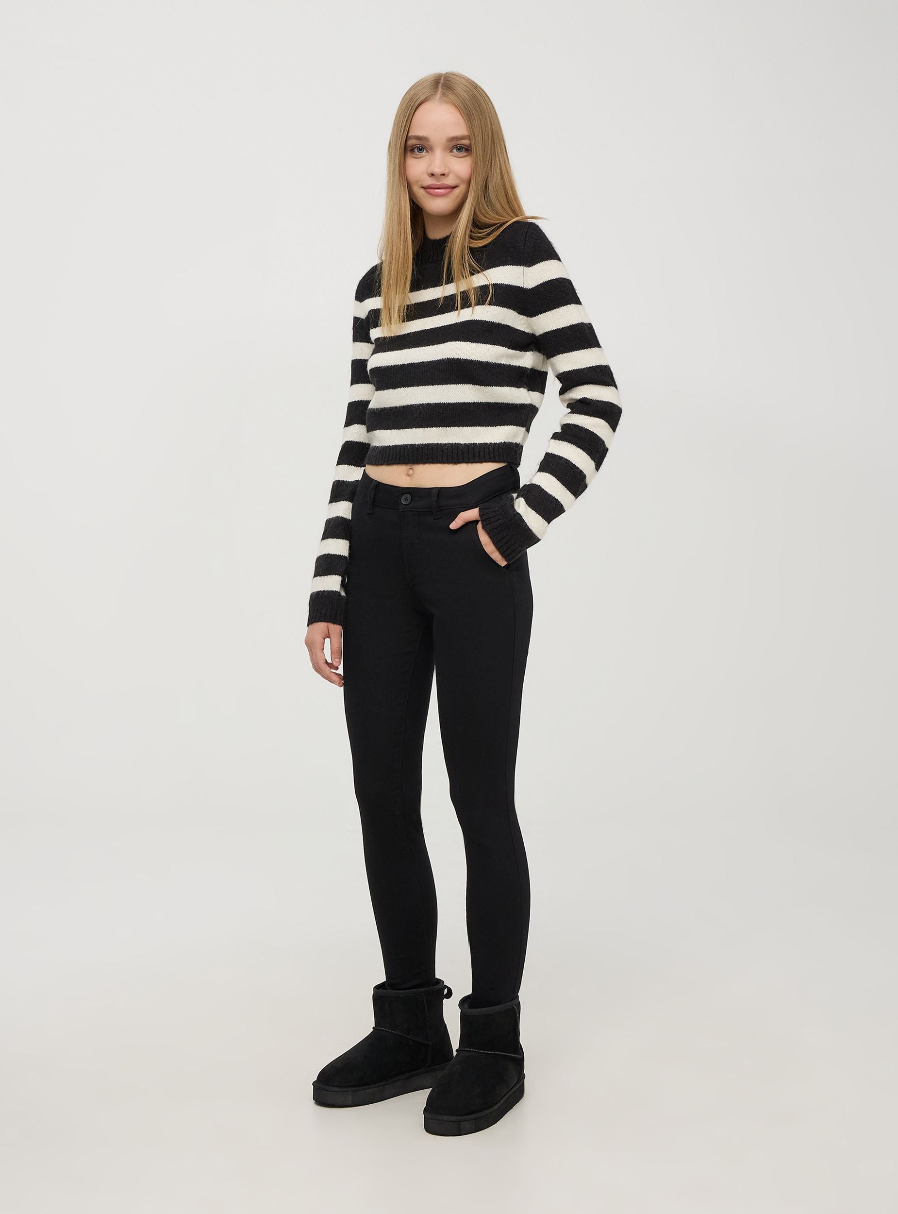 Ženski skinny chino hlače. Ove hlače imaju elegantan dizajn s prednjim francuskim džepovima i zatvaranjem na patentni zatvarač i gumb. Izrađene su od kvalitetnog materijala, imaju petlje za remen. Savršene za ležeran ili formalni izgled, nude udobnost i stil za svaku priliku.Detalji