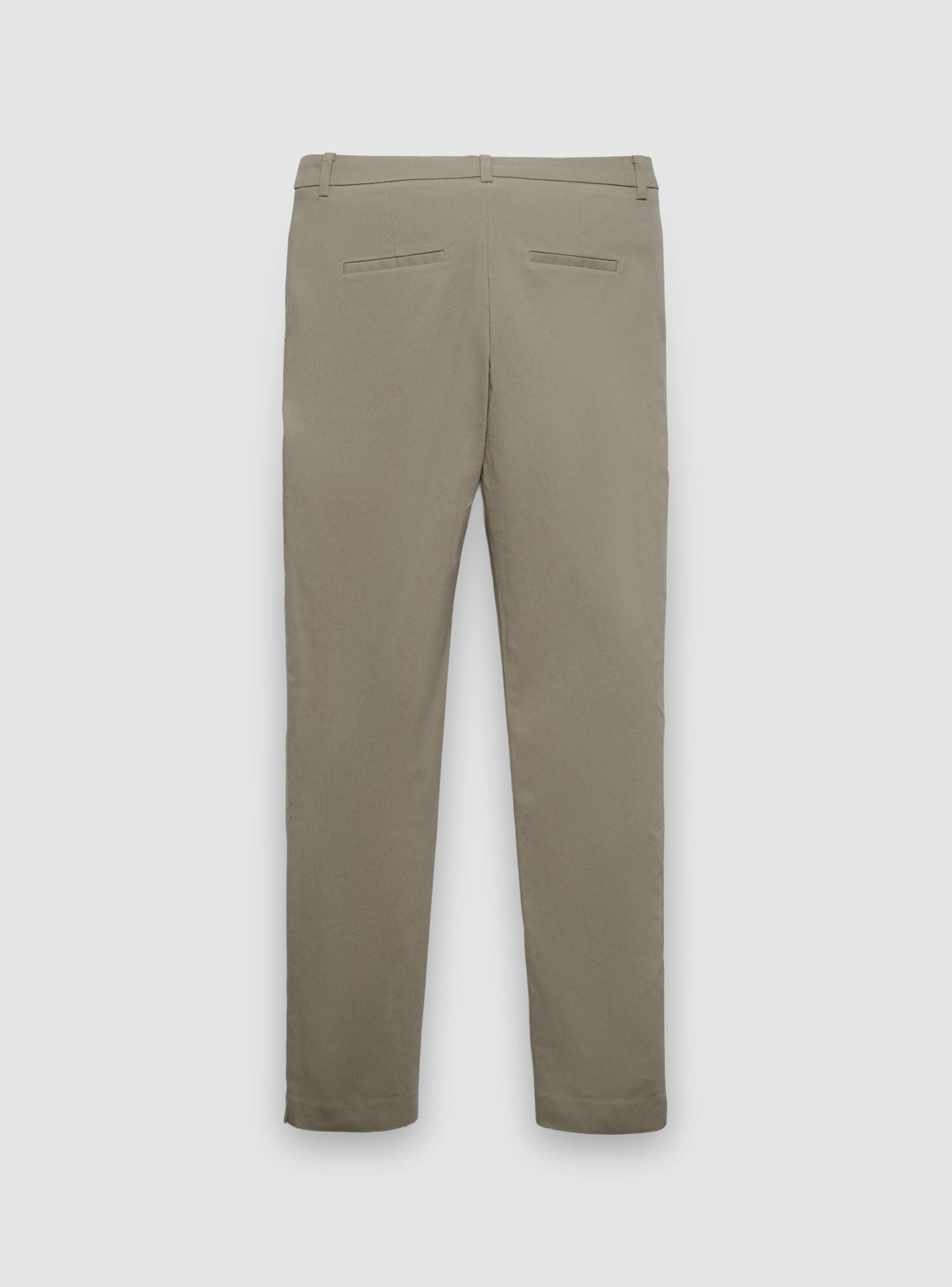 Ženske hlače u jednobojnoj varijanti, savršene za ured i svakodnevne kombinacije. Dugi model uskog kroja s petljama za remen. Prednje zatvaranje s kukom i skrivenim patentnim zatvaračem, bočne džepove na francuski način i ukopčane džepove na stražnjoj strani za uredan izgled. Lako se kombiniraju s košuljama i blejzerima za formalni izgled, ili s majicom i tenisicama za njegovani ležerni stil.Detalji