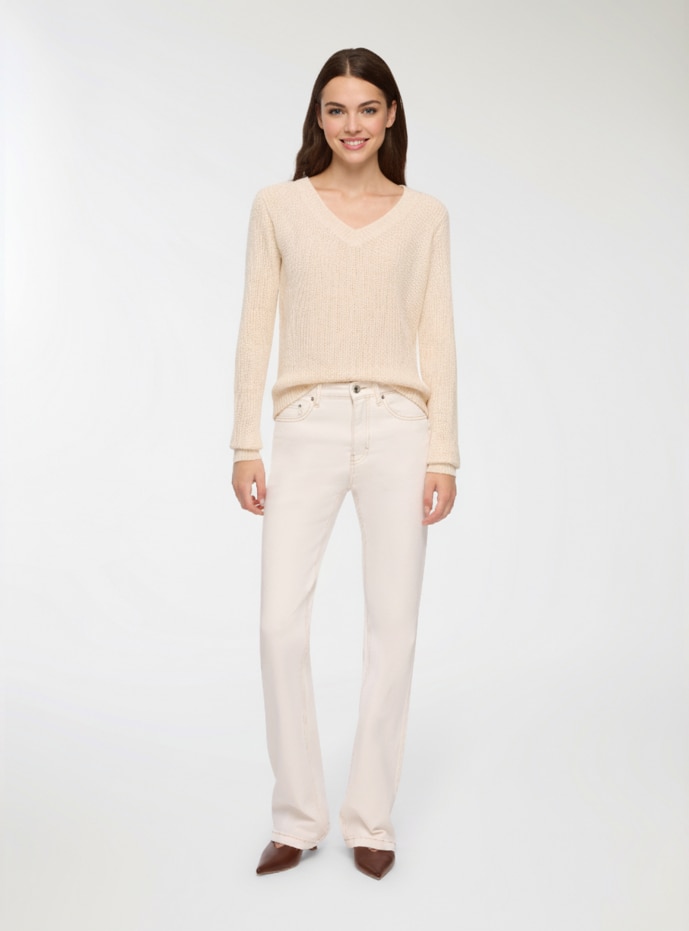 Ženski pulover jednobojni s V izrezom, savršen za suočavanje s najhladnijim mjesecima s stilom. Dizajn u engleskom rebrastom uzorku naglašava odjevni predmet s rafiniranim i strukturiranim učinkom, idealan za ležeran, ali dotjeran izgled. Udoban kroj i duži rukavi osiguravaju potpunu udobnost tijekom dana. Može se nositi uz traperice ili elegantne hlače, svestran je komad za ured ili slobodno vrijeme.