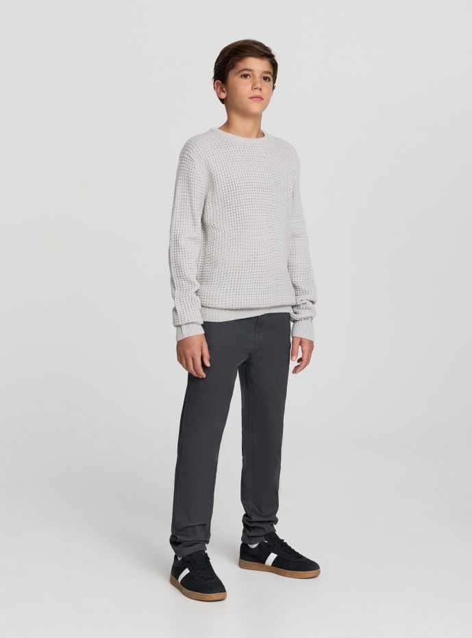 Dječje duge hlače u chino stilu jednobojne, savršene za školu i slobodno vrijeme. Struk s prorezima za remen, zatvaranje na gumb i patentni zatvarač. Prednji džepovi u francuskom stilu i lažni džepovi na stražnjoj strani za uredan izgled. Regular kroj s ravnim nogavicama, lako se kombiniraju s košuljama ili duksericama za dotjerane i svestrane outfite.