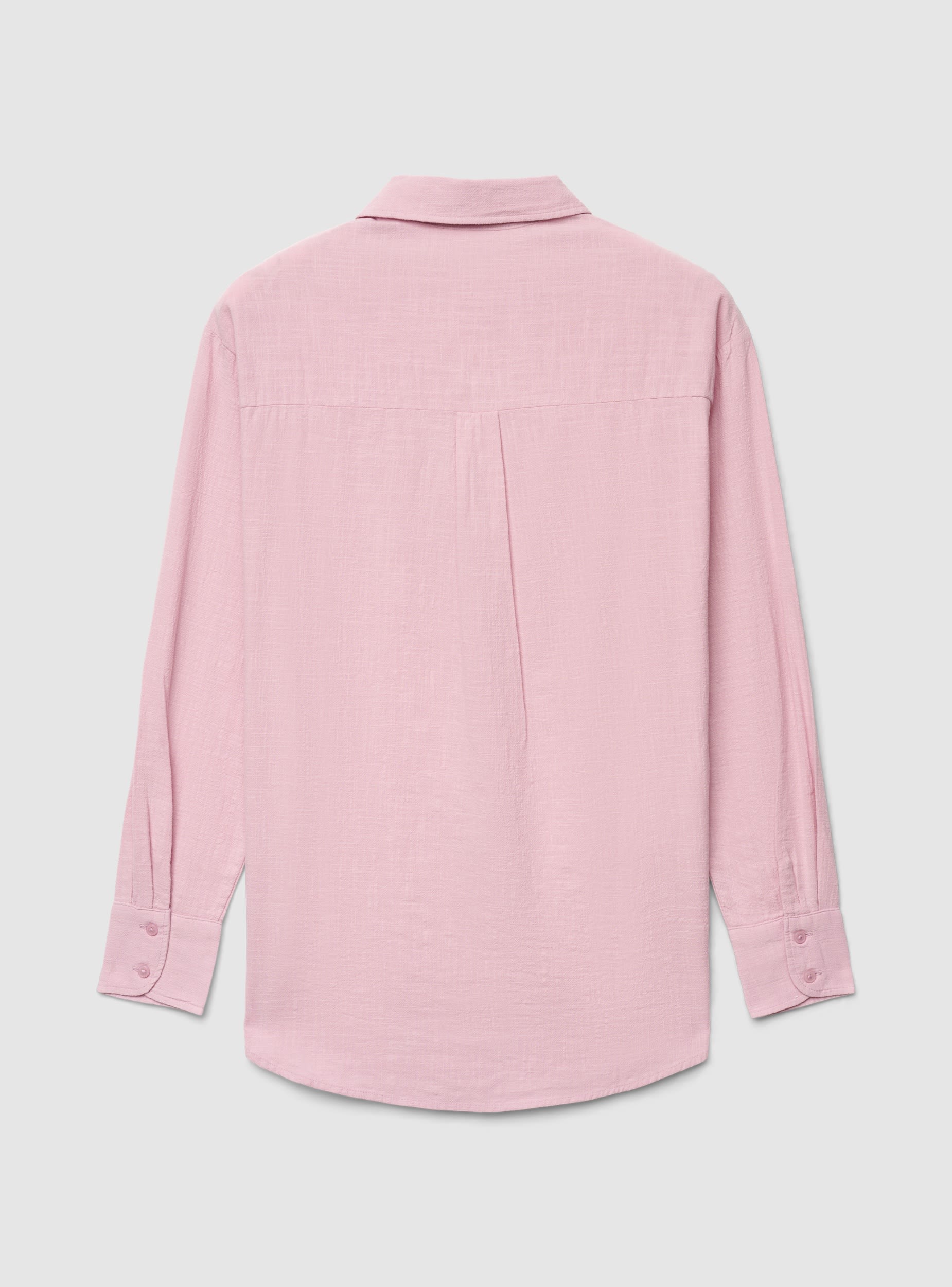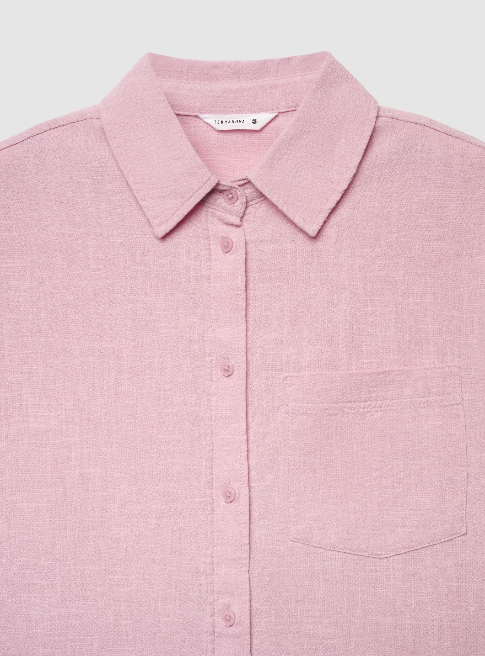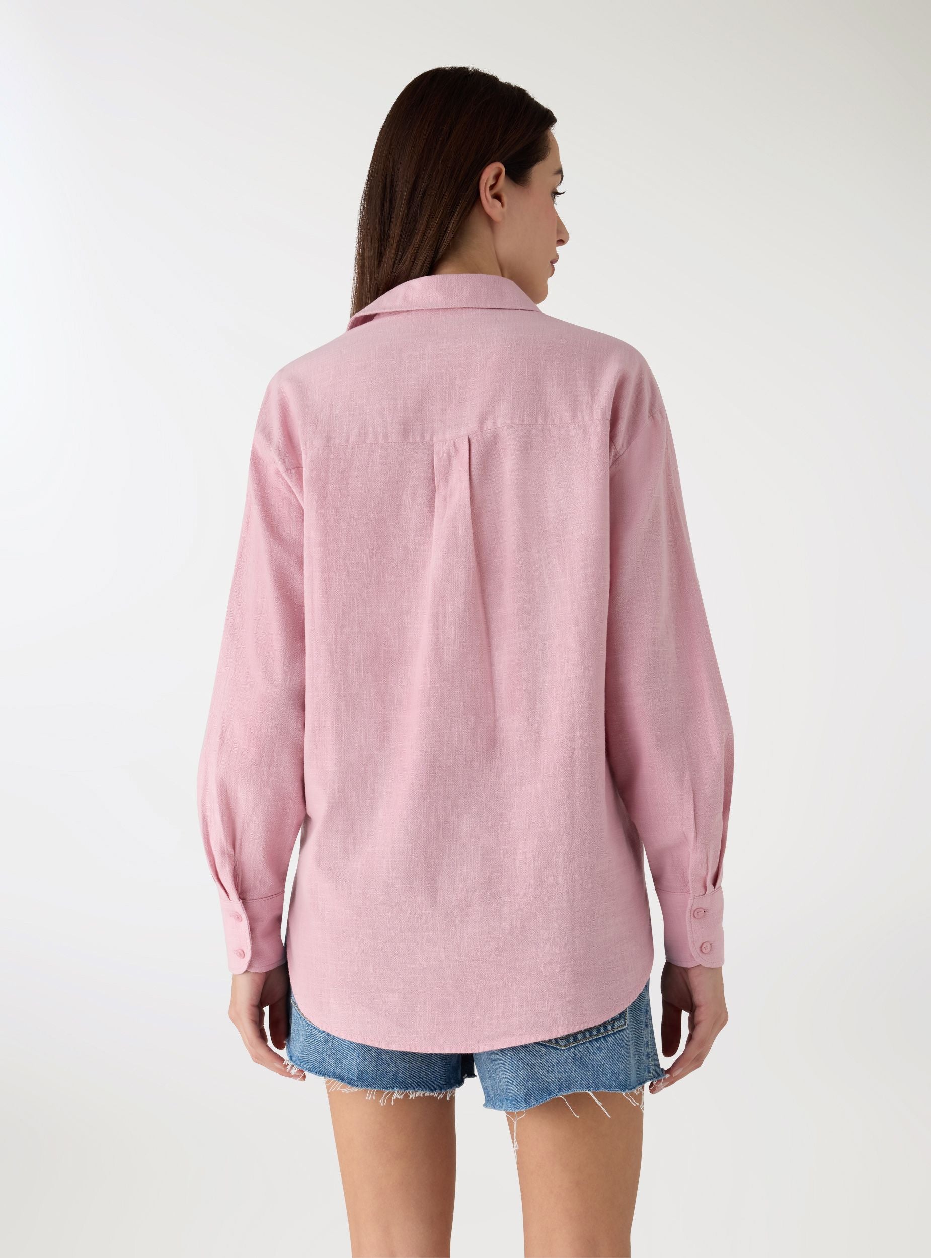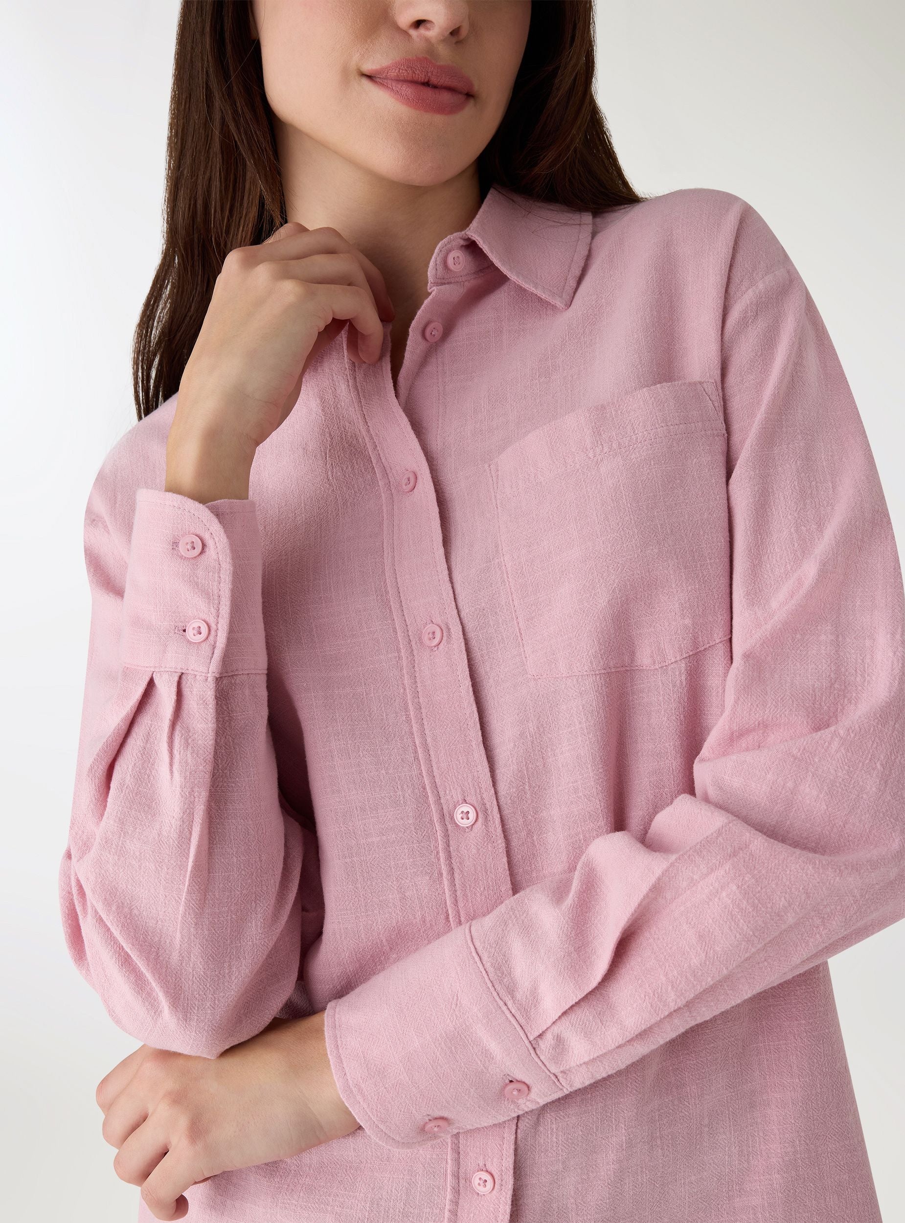 Camicia da donna a tinta unita con collo classico e maniche lunghe, ideale per l’ufficio e il tempo libero. Chiusura frontale con bottoni e taschino applicato sul petto, fondo stondato per indossarla anche aperta su top o maglietta. Vestibilità regular che si abbina a jeans o pantaloni eleganti per look versatili dal giorno alla sera.