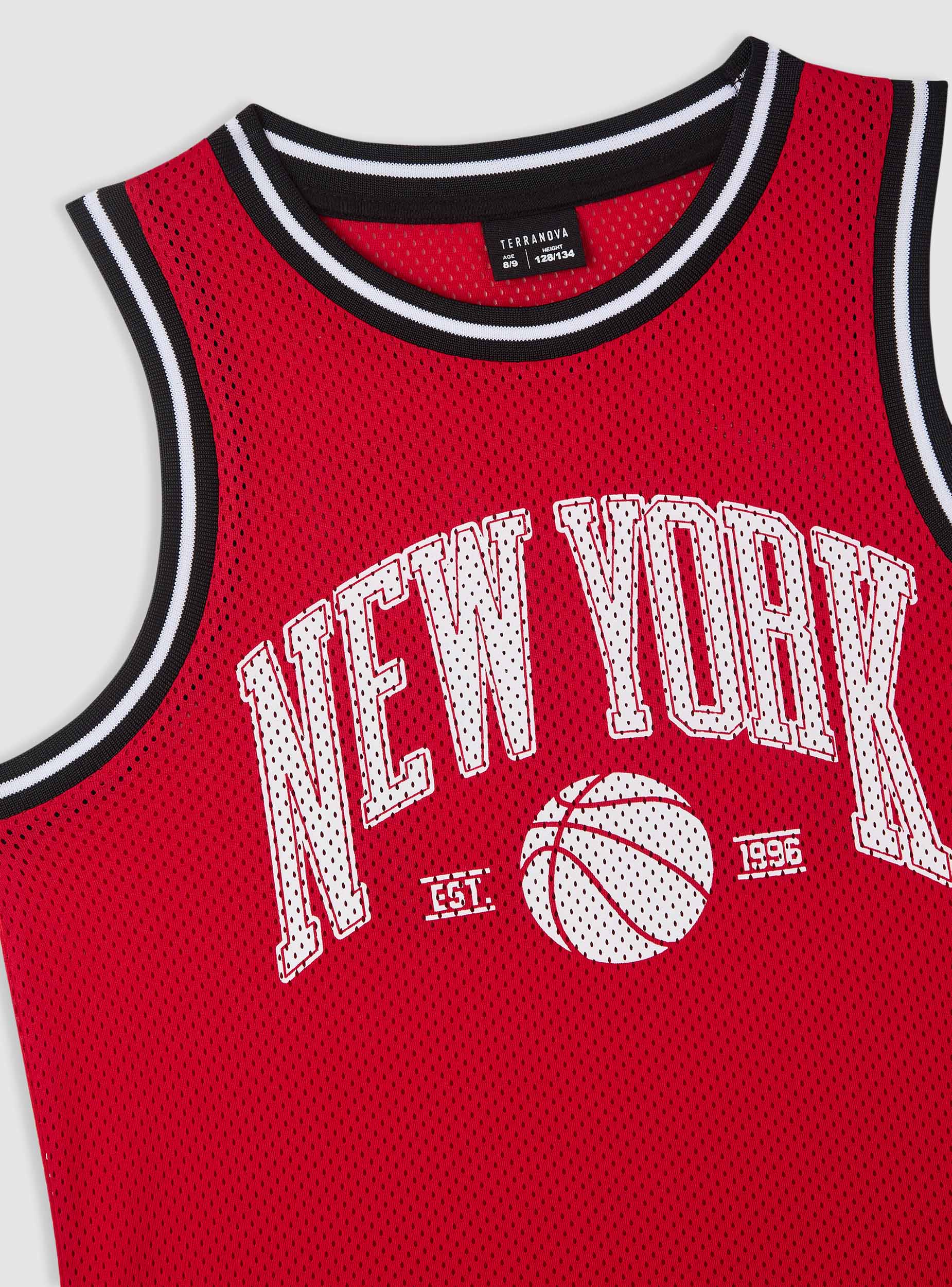 Canotta da bambino in stile basket, perfetta per sport e tempo libero. Modello smanicato con scollo tondo e profili a righe, pensato per una vestibilità comoda. La stampa con scritta e palla sul davanti e il numero sul retro danno un tocco street, facile da abbinare a shorts, jeans o pantaloni tuta. Patch applicata sul fondo.Dettagli