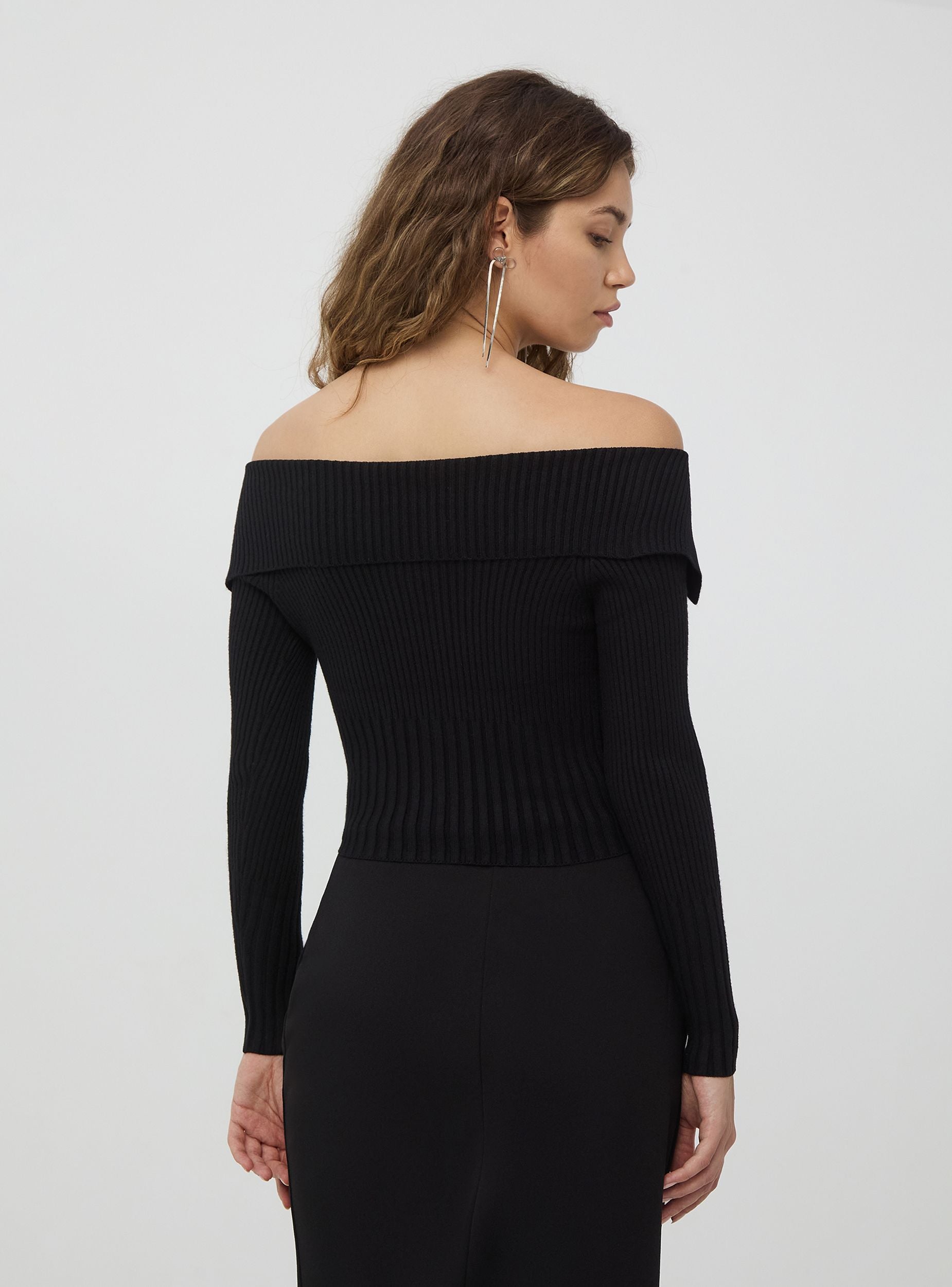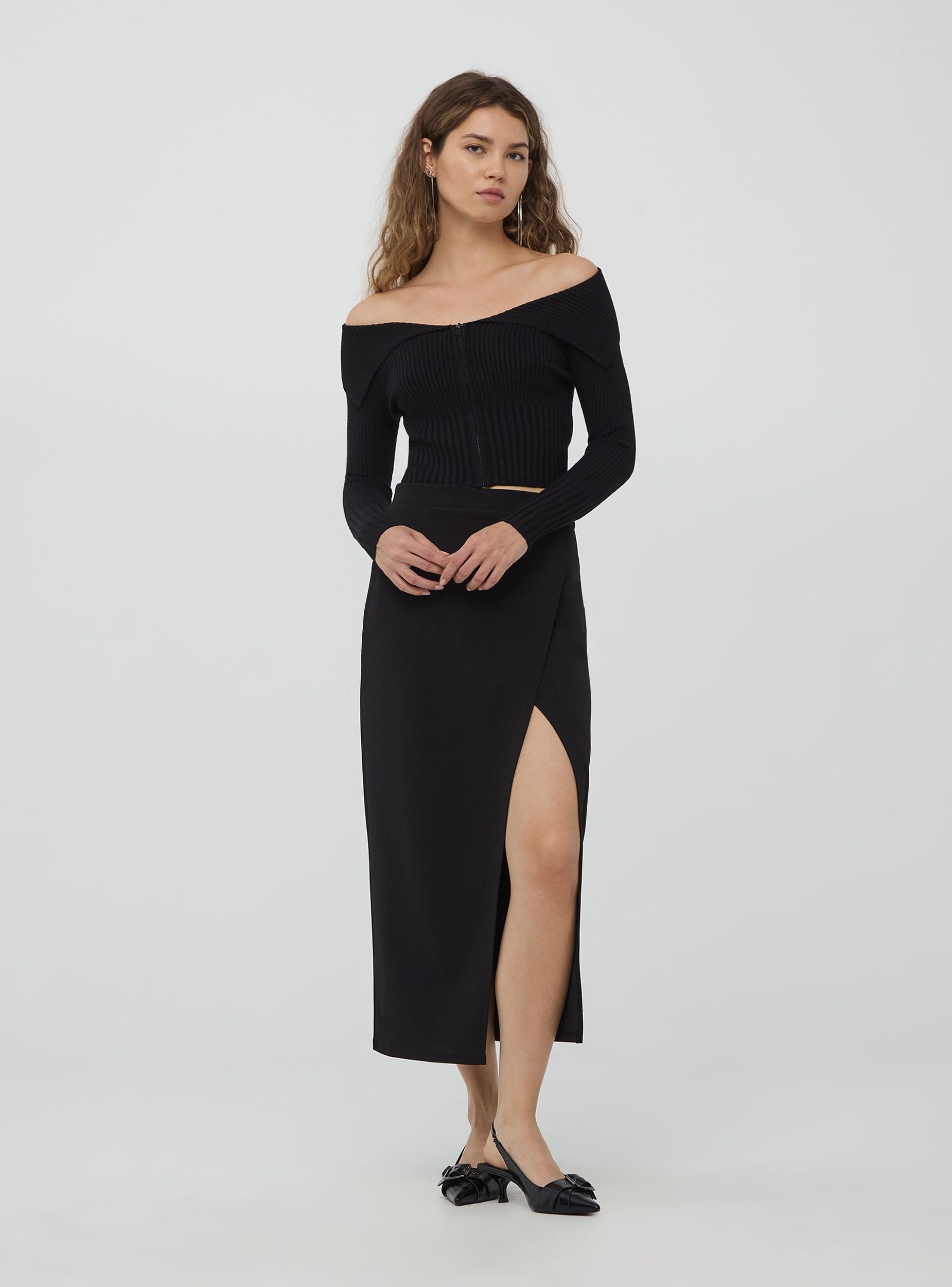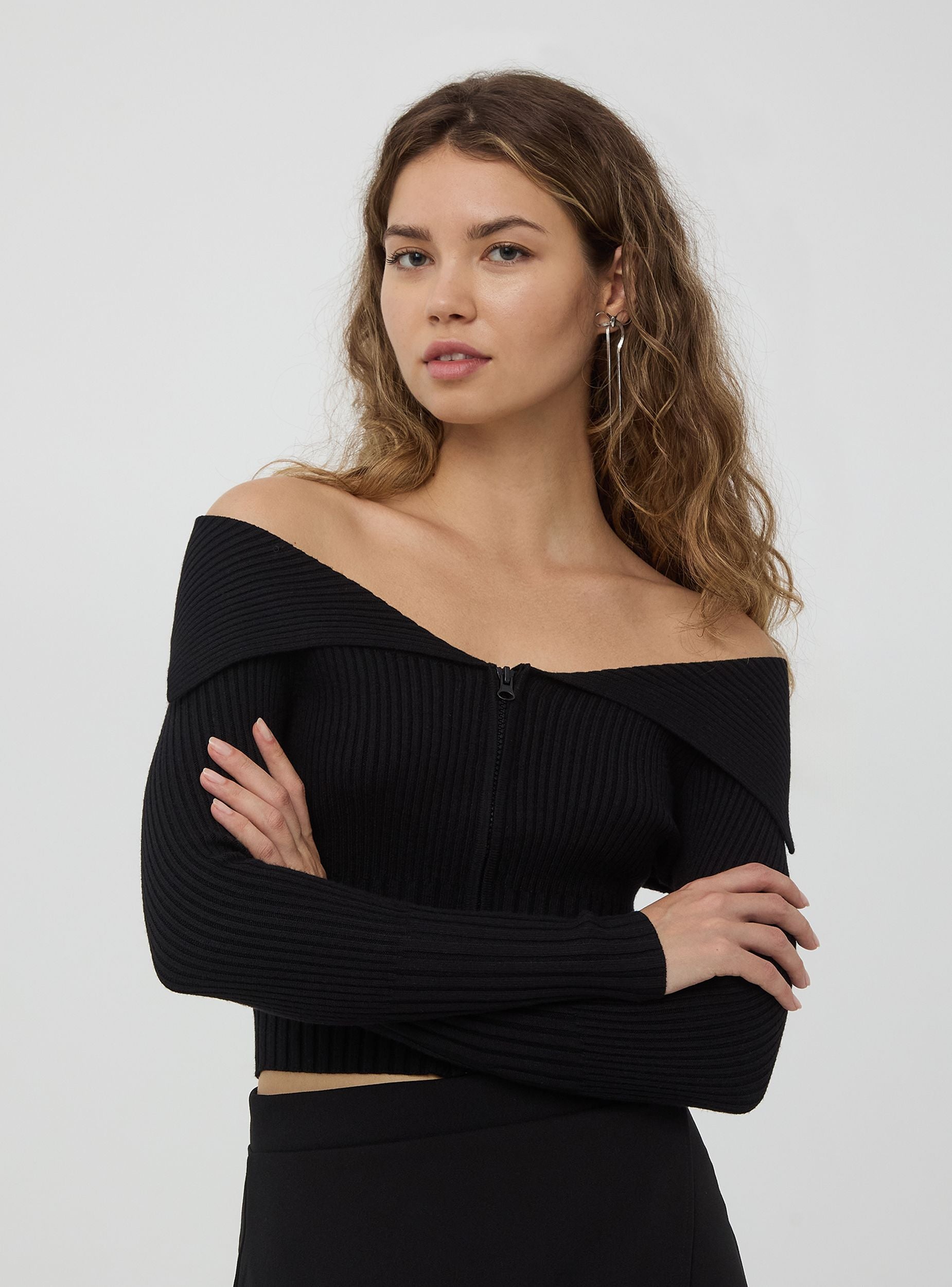 Maglia da donna, modello cardigan, con chiusura a zip e spalle scoperte. Realizzato in tessuto a costine in tinta unita. Vestibilità crop.