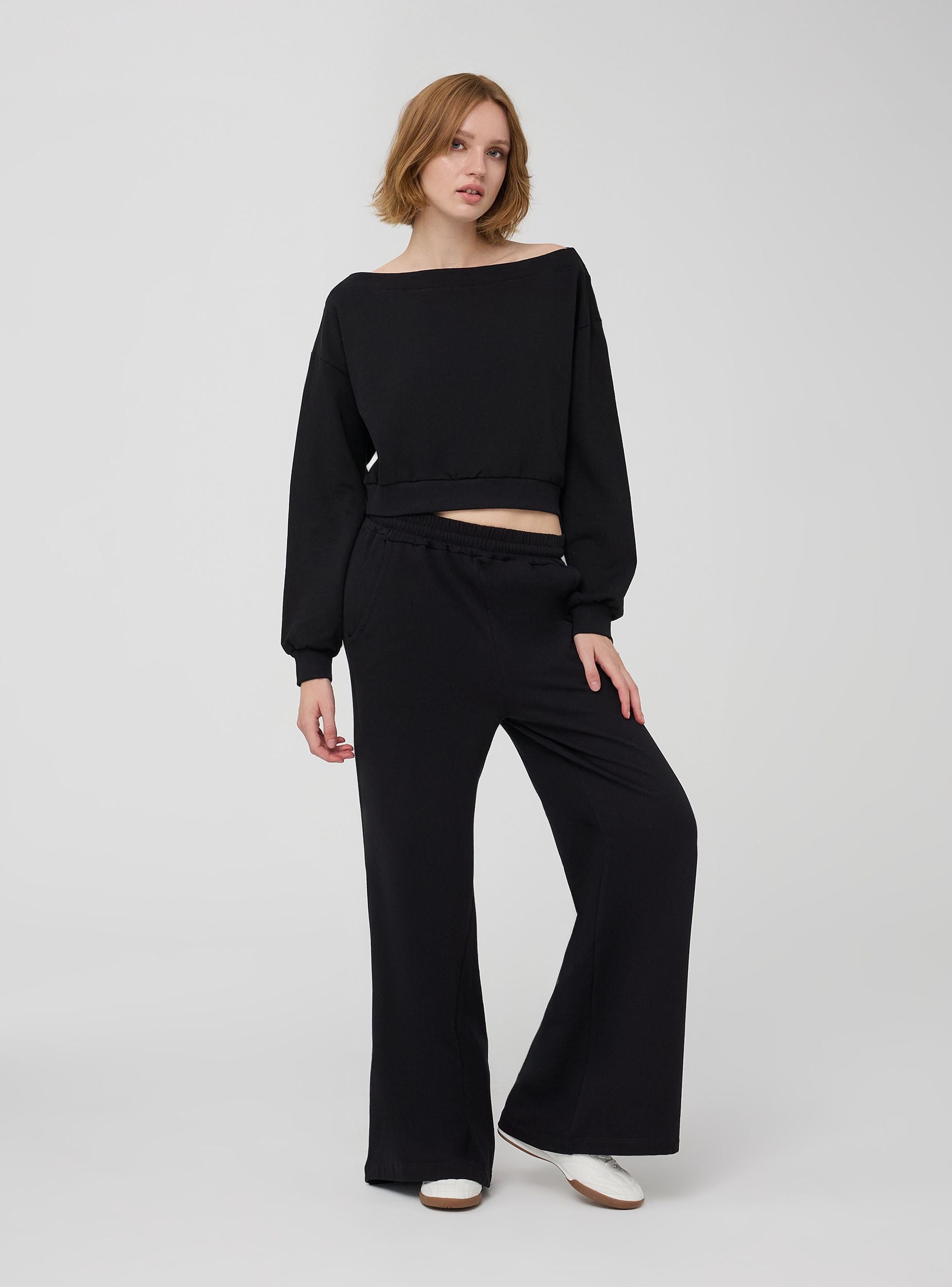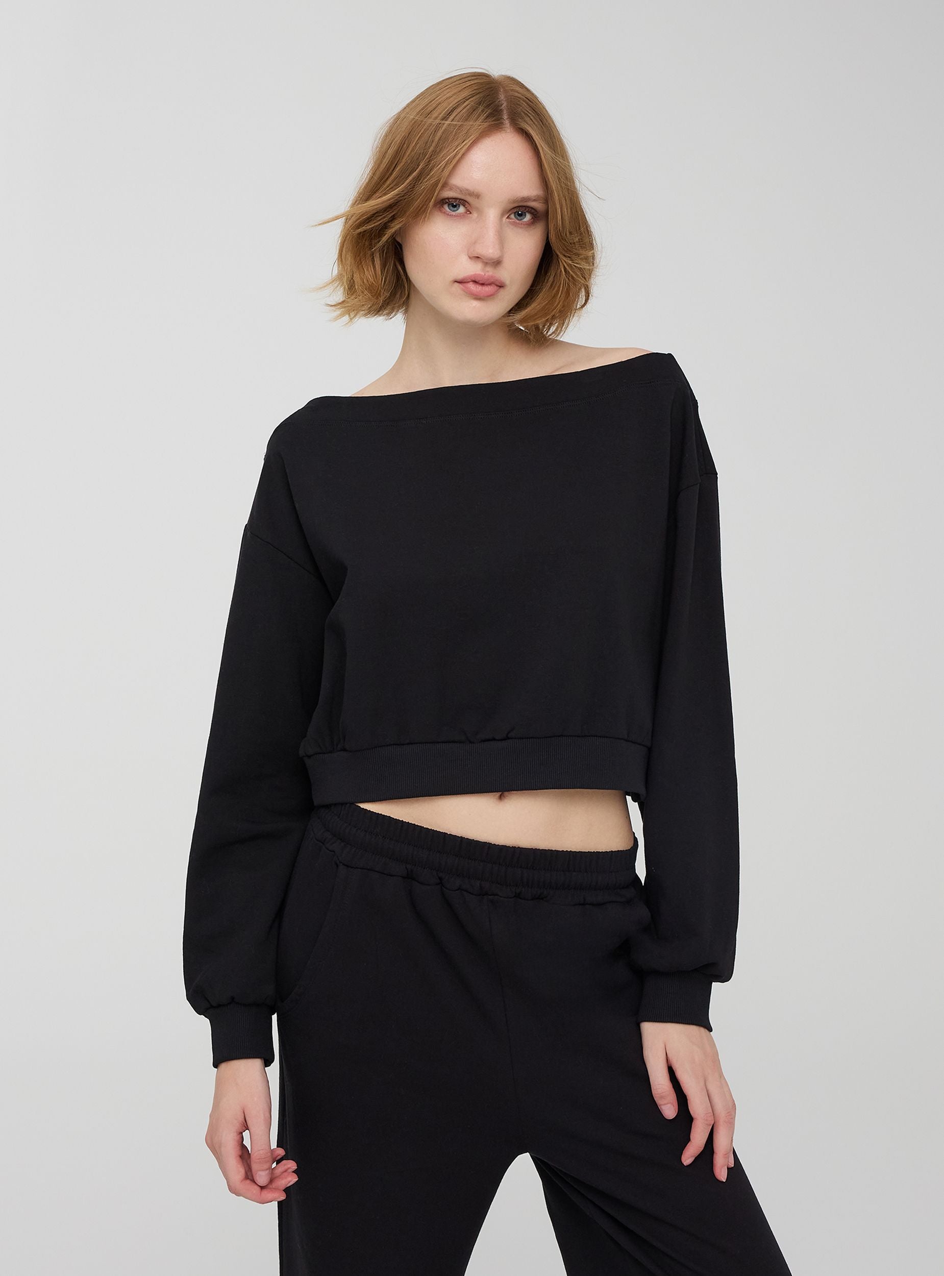 Felpa da donna caratterizzata da un taglio ampio e rilassato. Presenta spalle scoperte maniche lunghe con polsini a costine e orlo a costine, per un fit confortevole. La felpa è progettata per offrire comfort e stile, perfetta per un abbigliamento quotidiano informale.Dettagli
