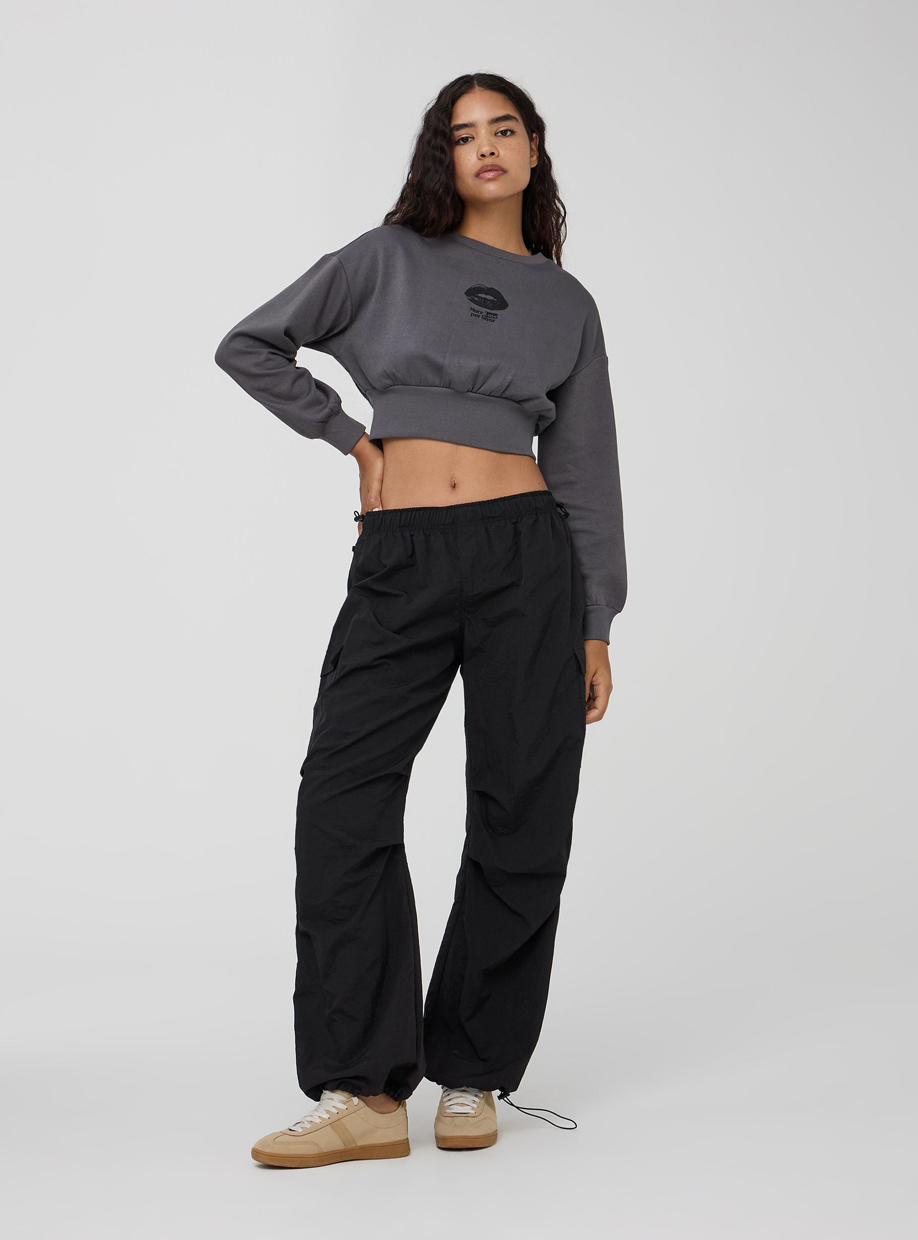 Felpa da donna senza cappuccio, realizzata in tessuto pesante con stampa frontale di una bocca e una scritta. I polsini, il girocollo e l'orlo inferiore sono a costine. Vestibilità crop.